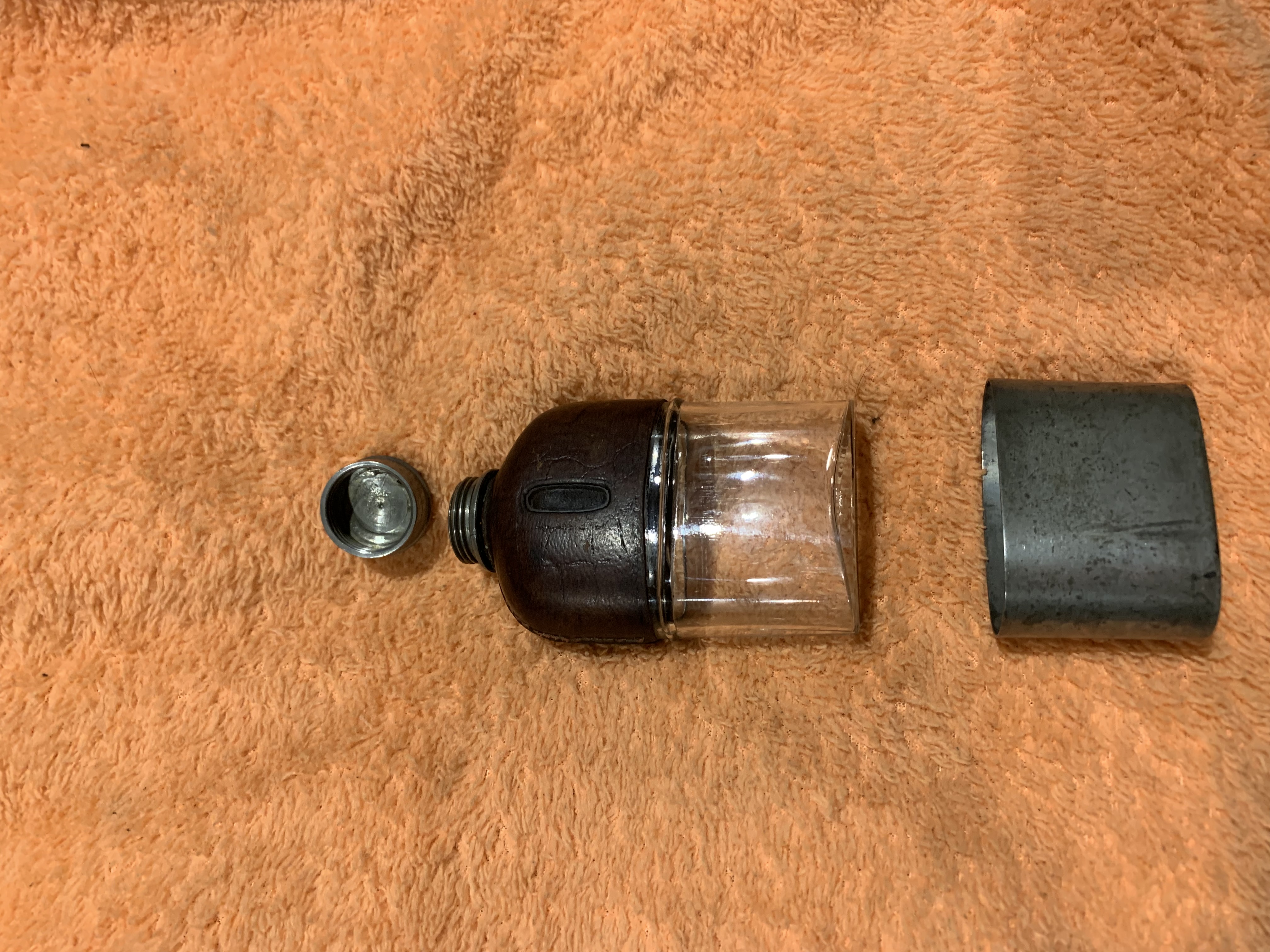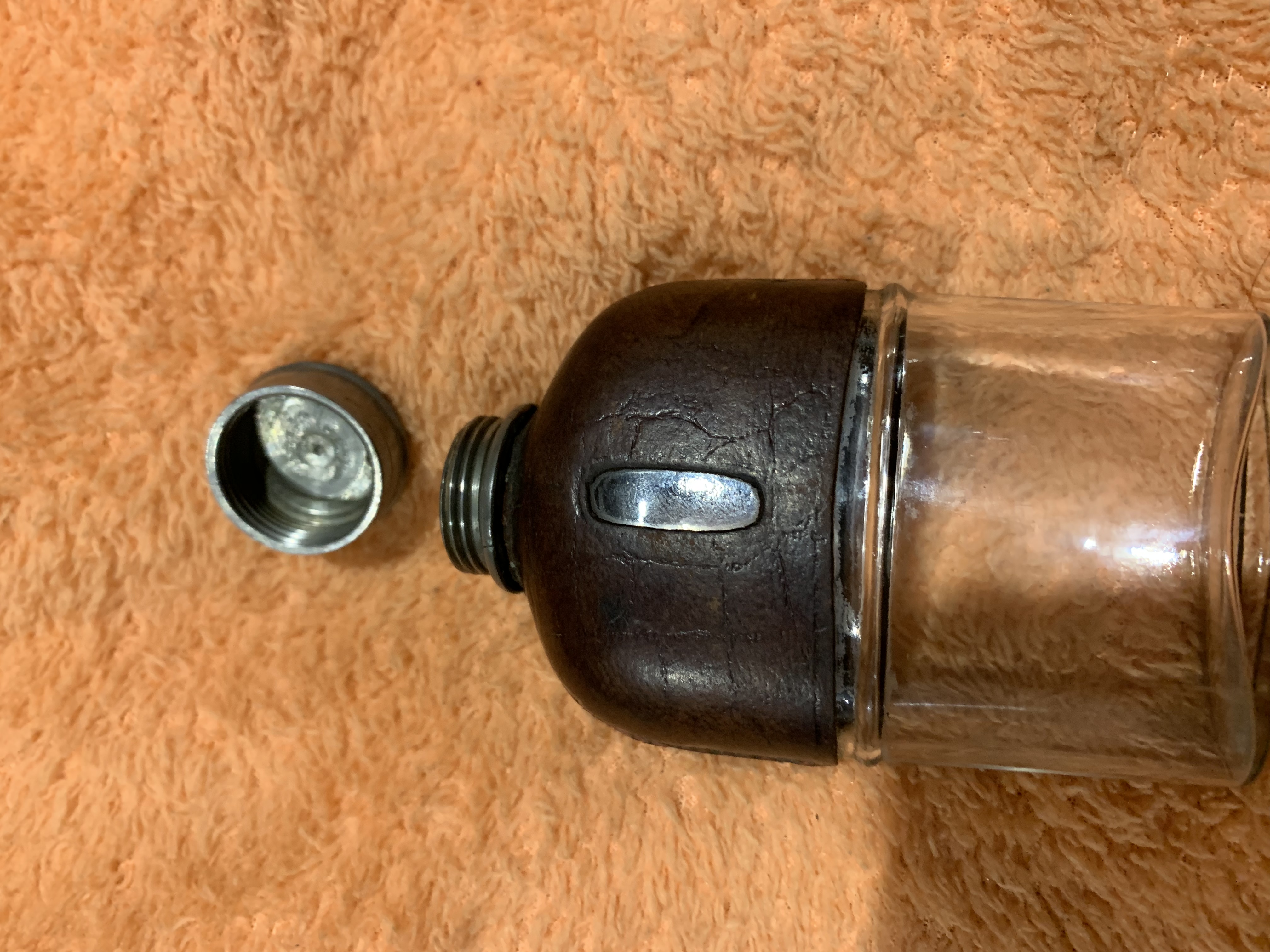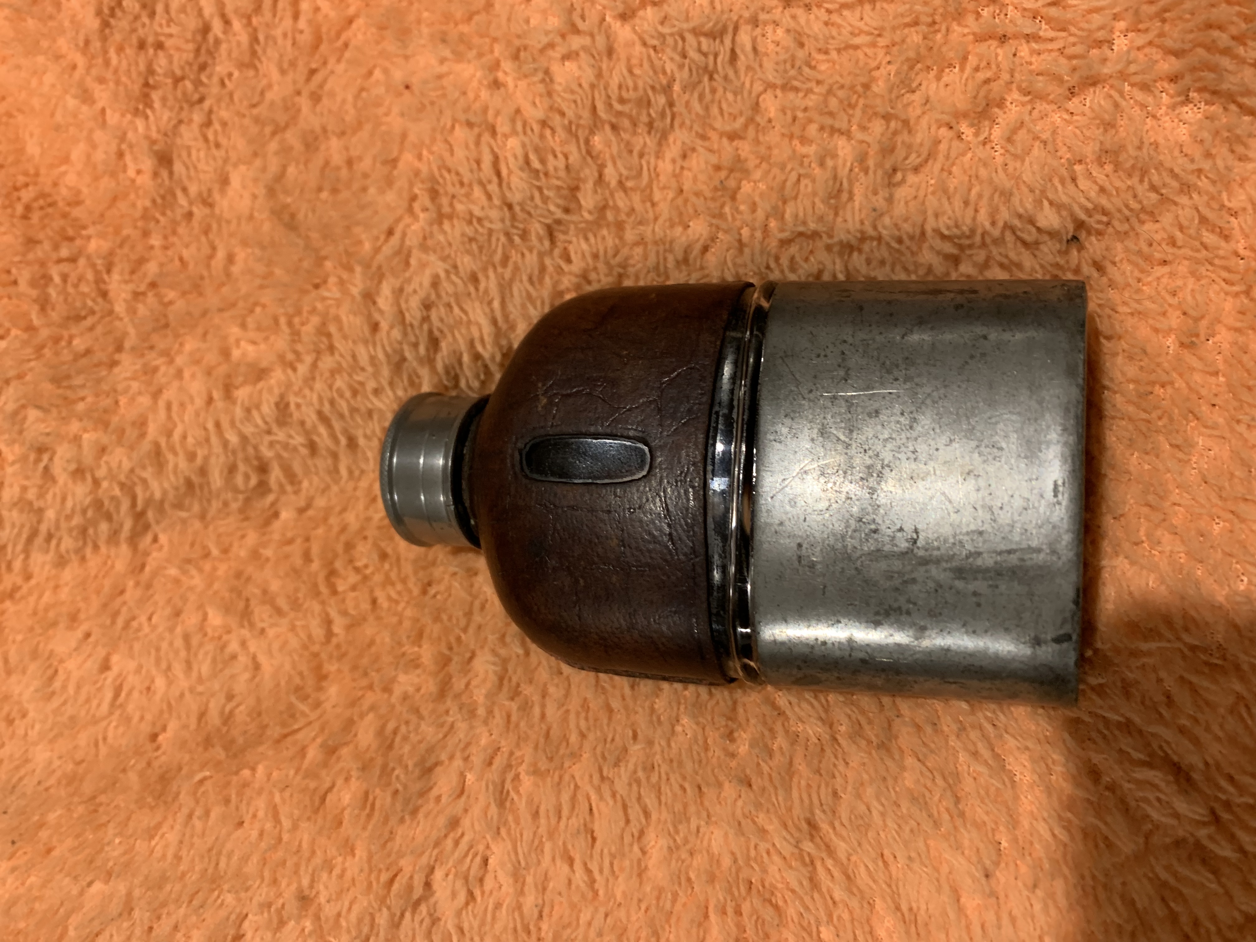 Small leather wrapped hip flask with detachable metal cup at bottom. No markings anywhere on piece, was hoping someone could tell me a bit more about it: eg approximate time period