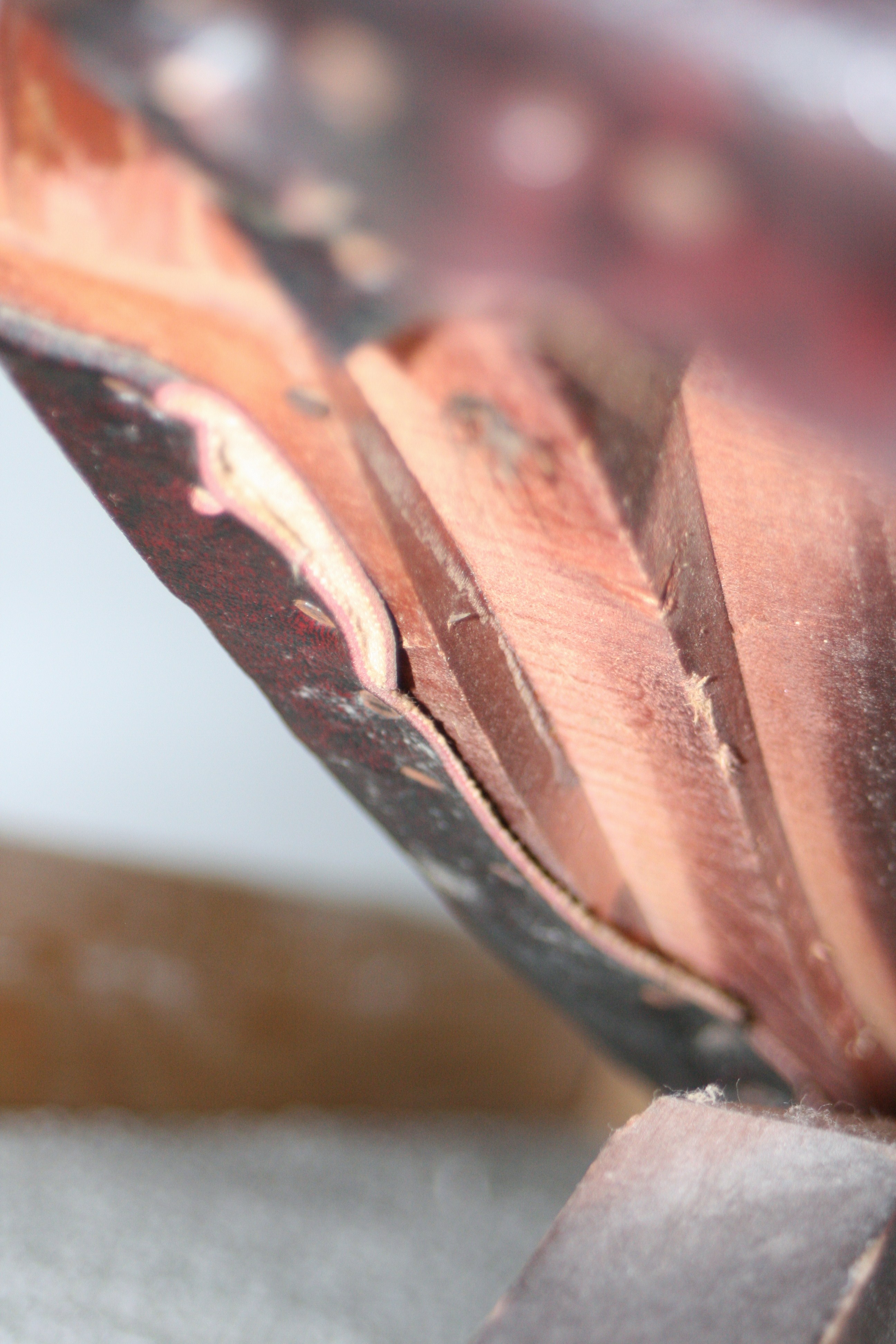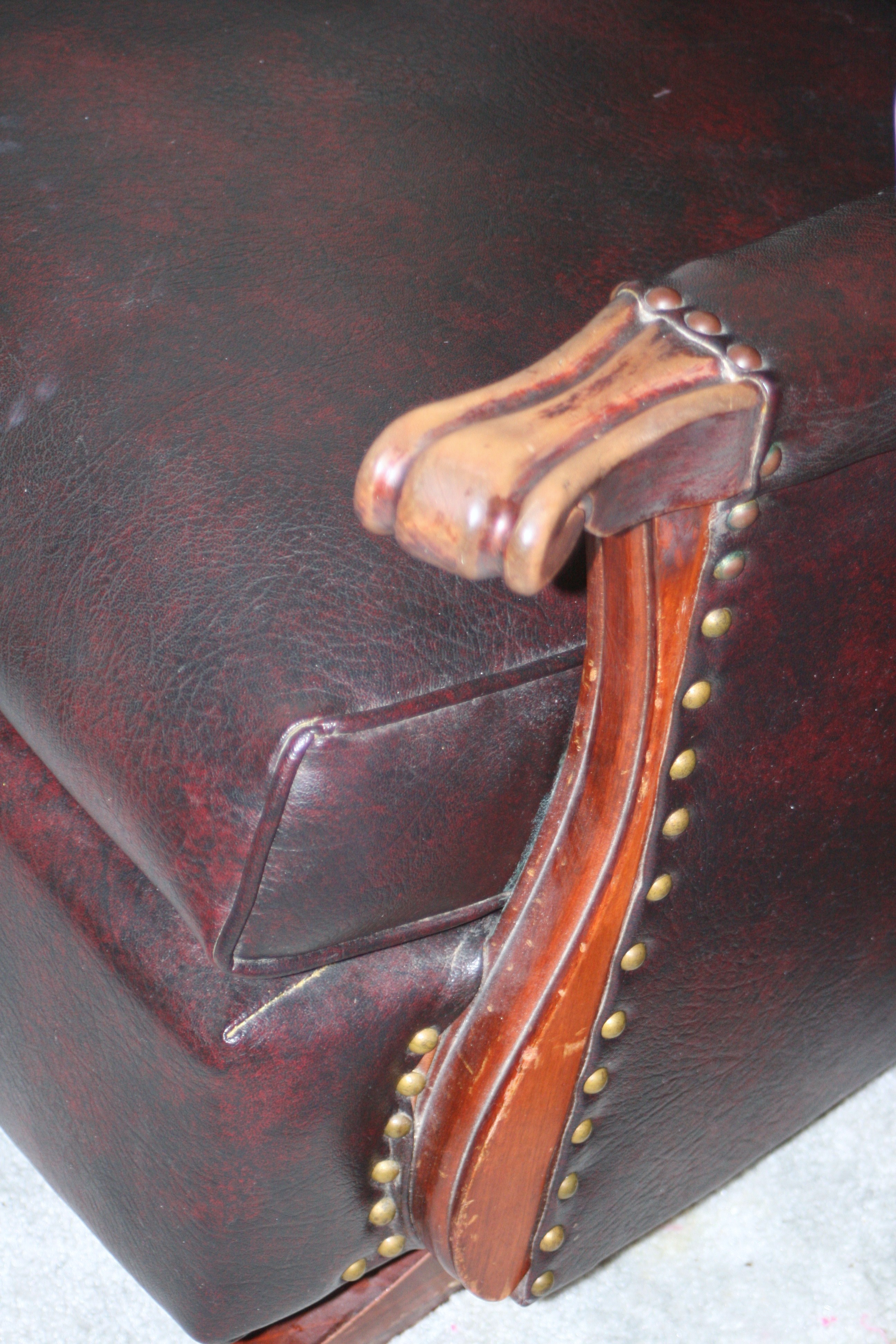 Chair is a heavy wooden frame covered in a dark red/black leather - Small rivets attach leather to frame around unseen edges - decorative rivets down side of arms - Leather seat cushion appears to be separate piece, but won't easily remove, so I haven't tried to force it - Back of rocker is completely covered - Covered arms stop at the "hand rest" area where they continue as carved wood down to the front arm panel