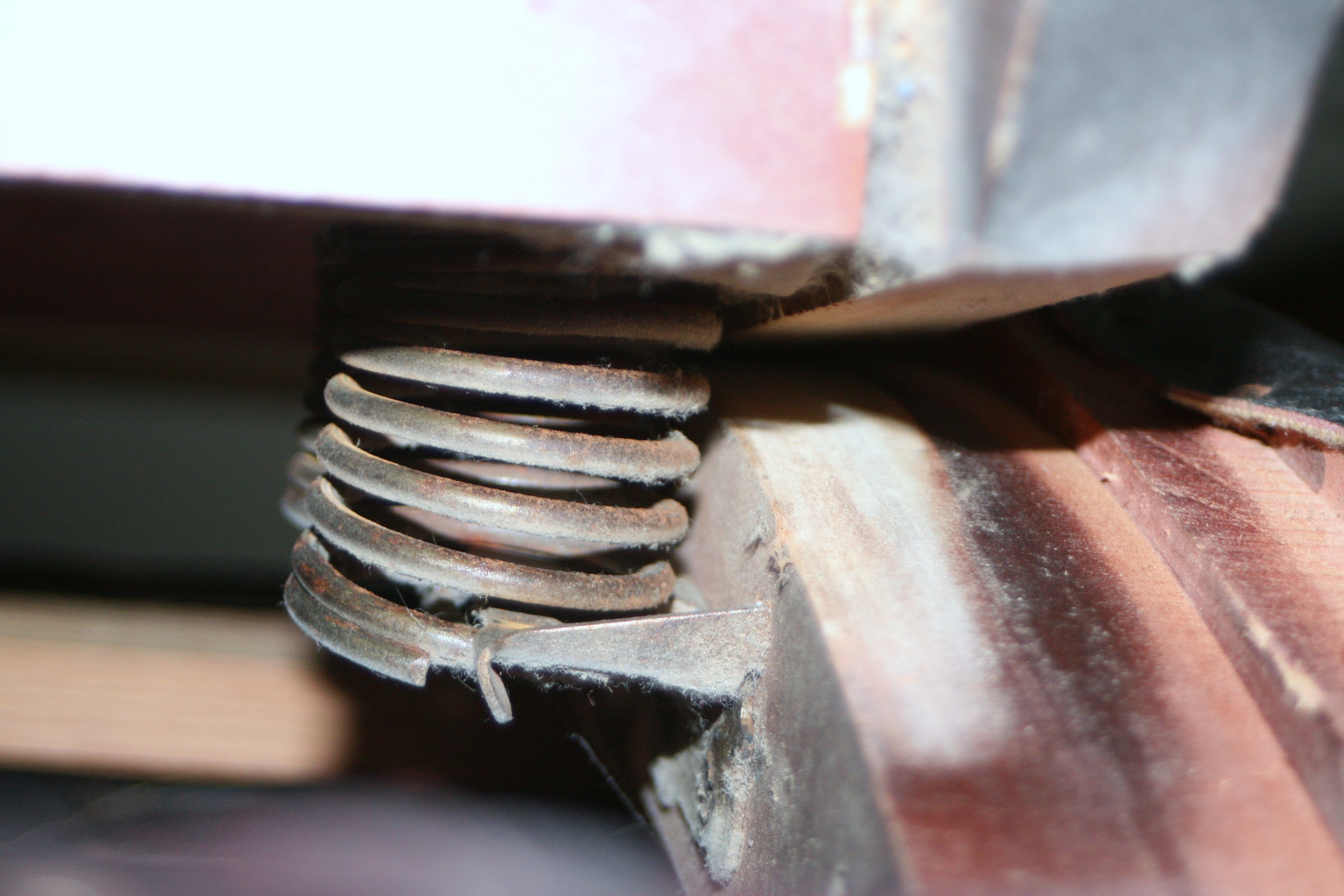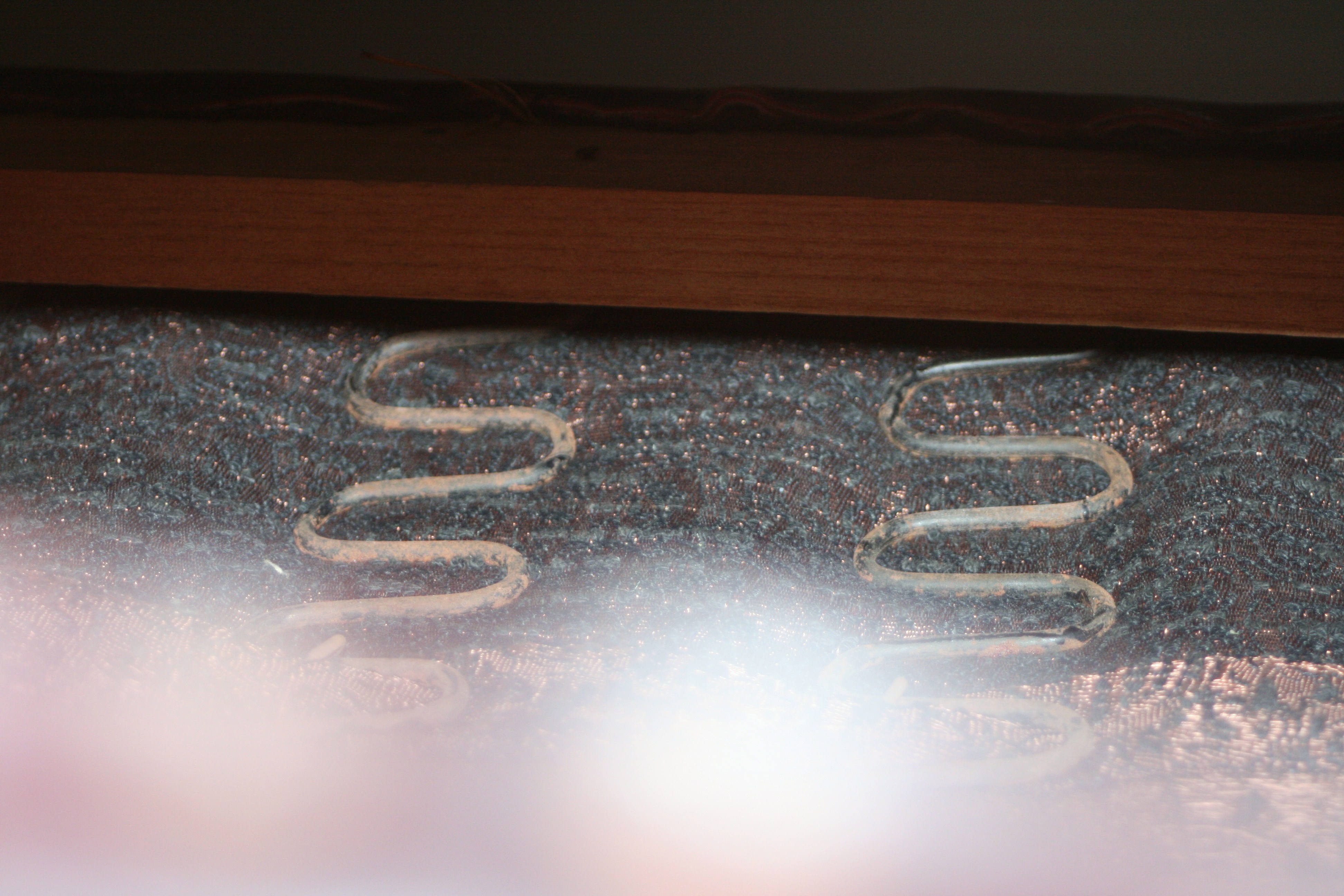 Underneath are 2 large springs - Not sure what chair is stuffed with (makes a crunching sound if depressed) - Looking underneath a few curvy wires can be seen as seat supports through the cloth and burlap - no tags, initials, etchings or other identifying marks can be found.