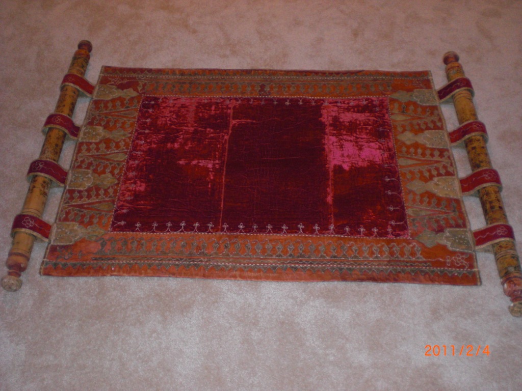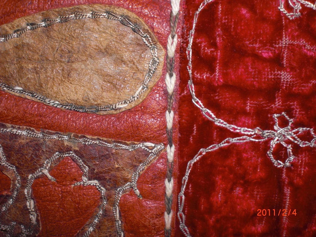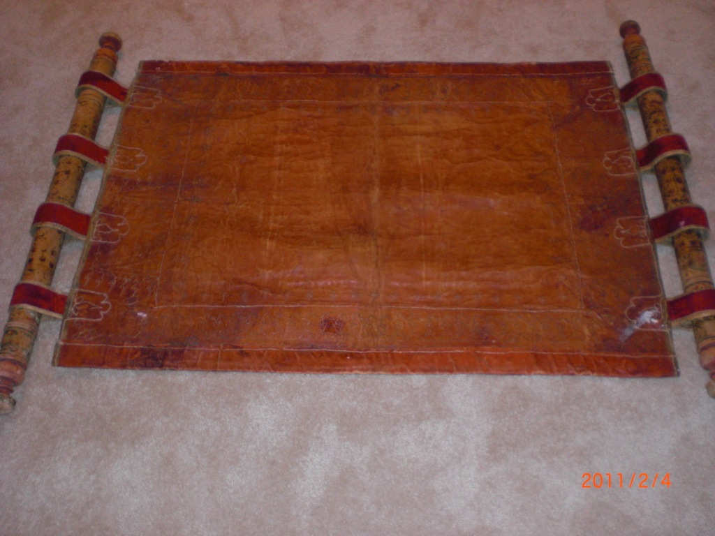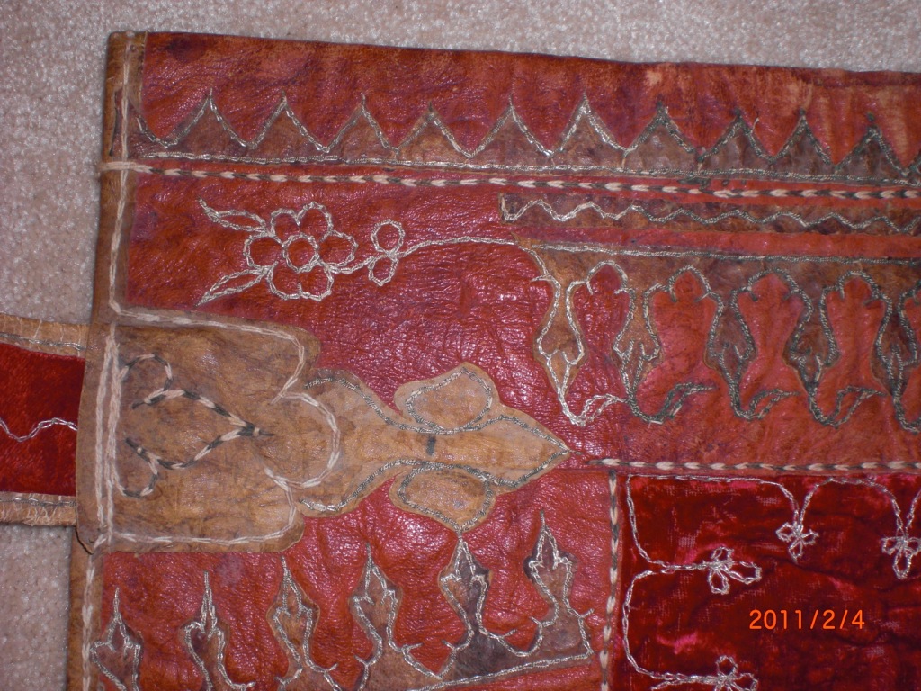 Unsure of what this is, or what the proper terminolgy is to describe this item. It is a leater tapestry like carpet/rug. I appears to be of Asian (Mongolian, Tibetan or Egyptian influence). It may be a saddle blanket, or? I have no idea what it is or what it's worth, please help. I can tell you that it is heave and very good quality, it also appears to be very old. THANKS!