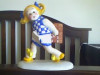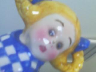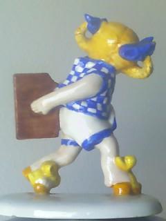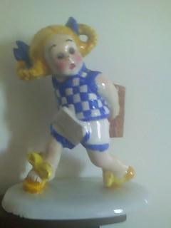 This Lenci figurine is of a young girl with blonde braided pigtails. She is wearing blue and white checkered clothing. She has her arms drawn behind her holding onto a chocolate candy bar that has had a bite taken from it. This figurine is in good condition, however it is not in perfect condition. It does have 1 very tiny chip but it is hardly noticable. The bottom is marked Lenci Made in Italy 24-2-31 with the artists initial that looks like an E.