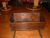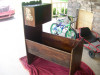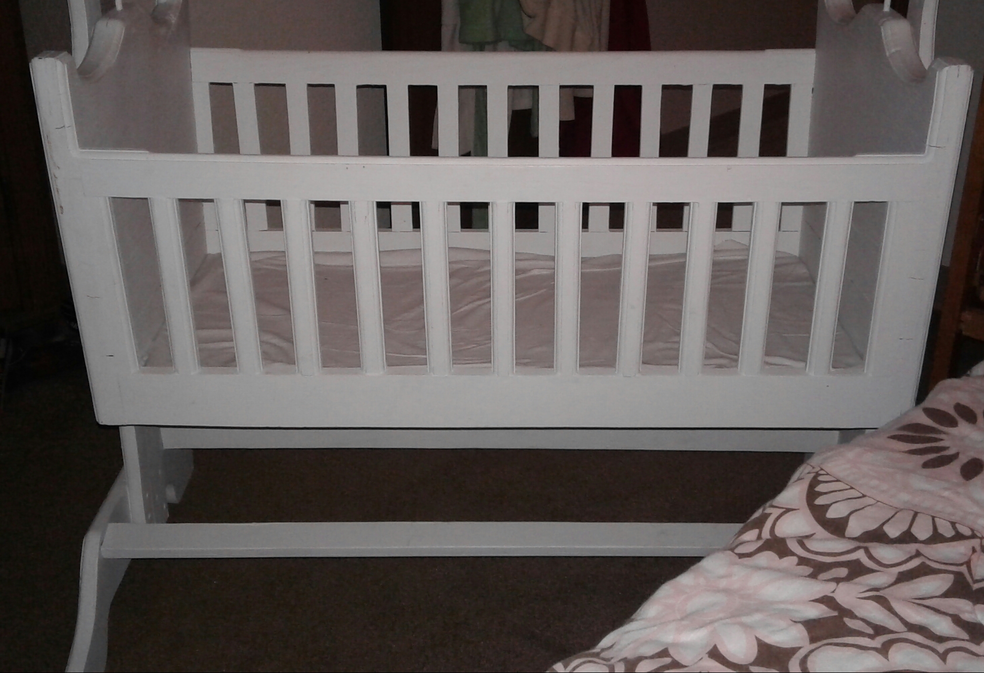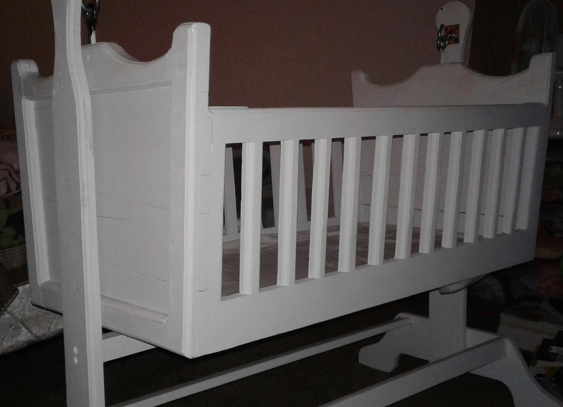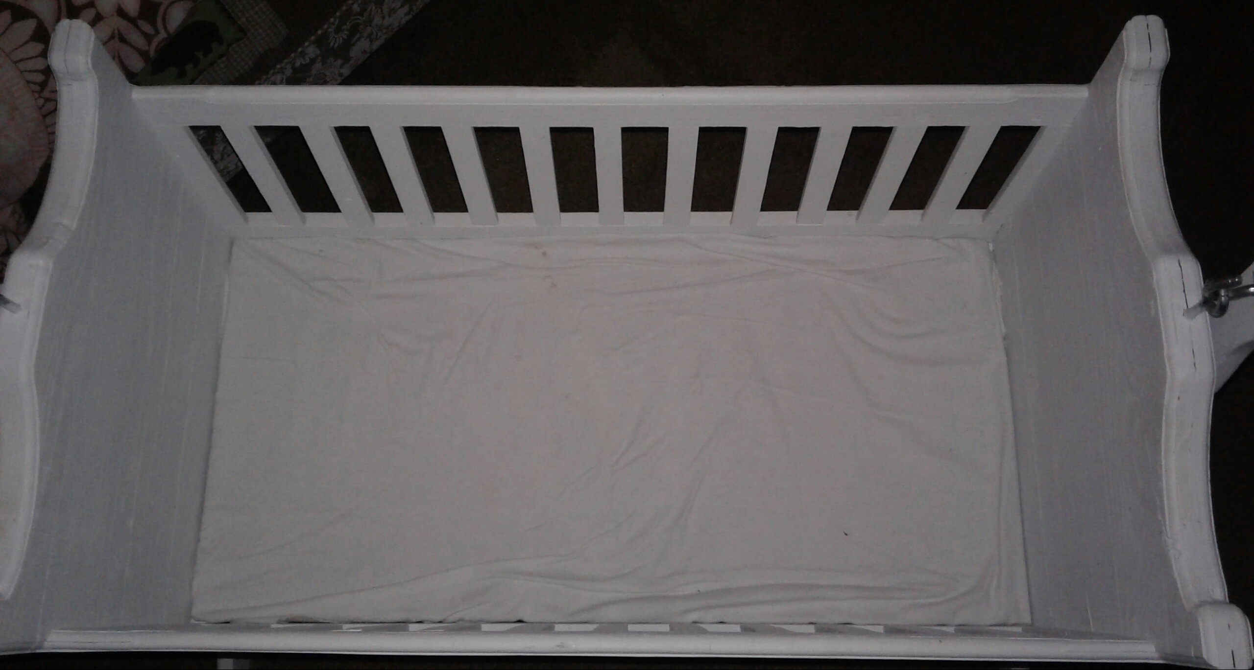 Refinished and painted white. Nothing wrong with it. Like new condition. Made of solid hard wood. Bought a piece of firm foam to use as mattress. Approximately 3 1/2 ft tall, 24 inches wide and approximately 4 1/2 ft in length.