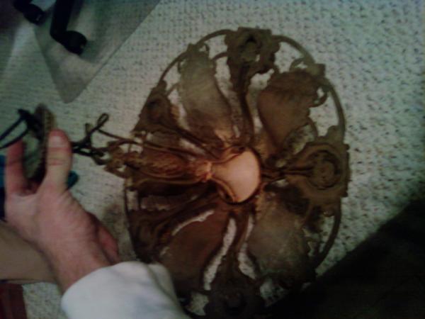 metal of some sort hanging ceiling fixture 5 arm. is it missing glass?