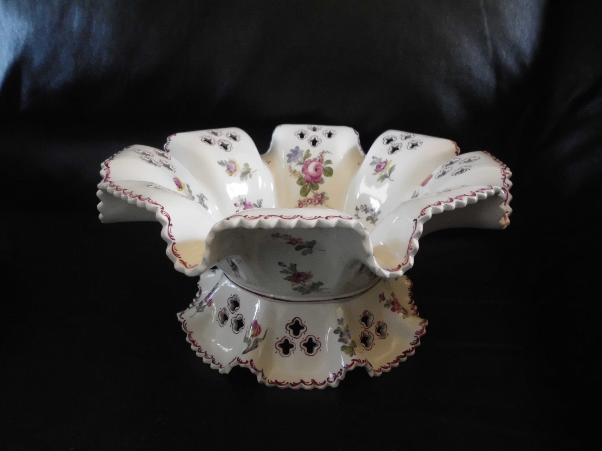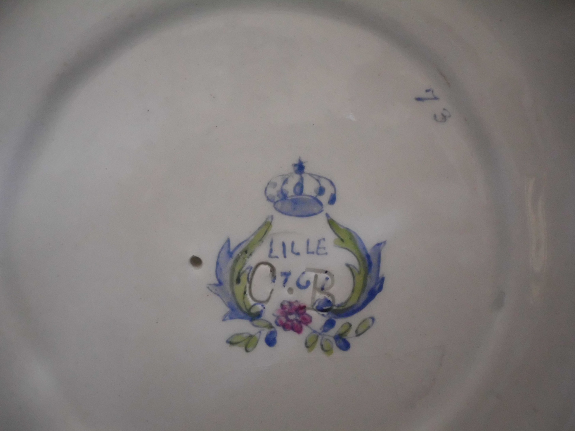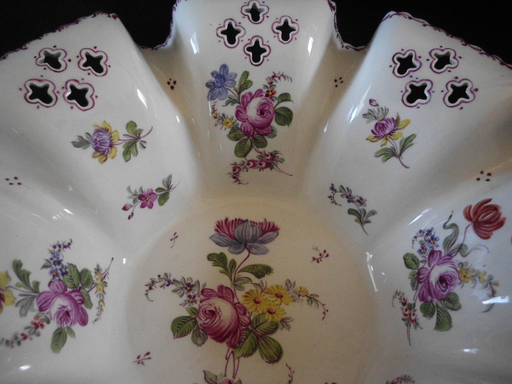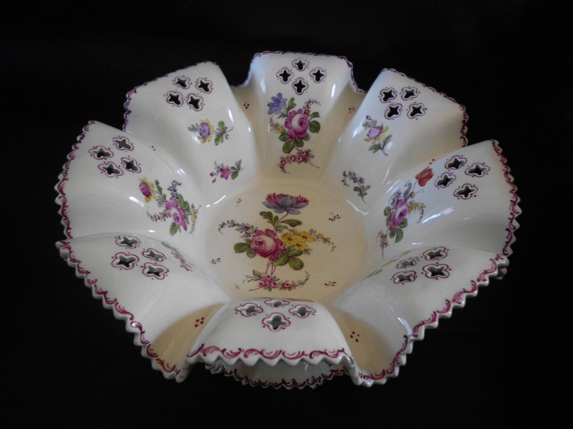 Large floral bowl with cutouts. Marked underneath with Lille and impressed initials CB.