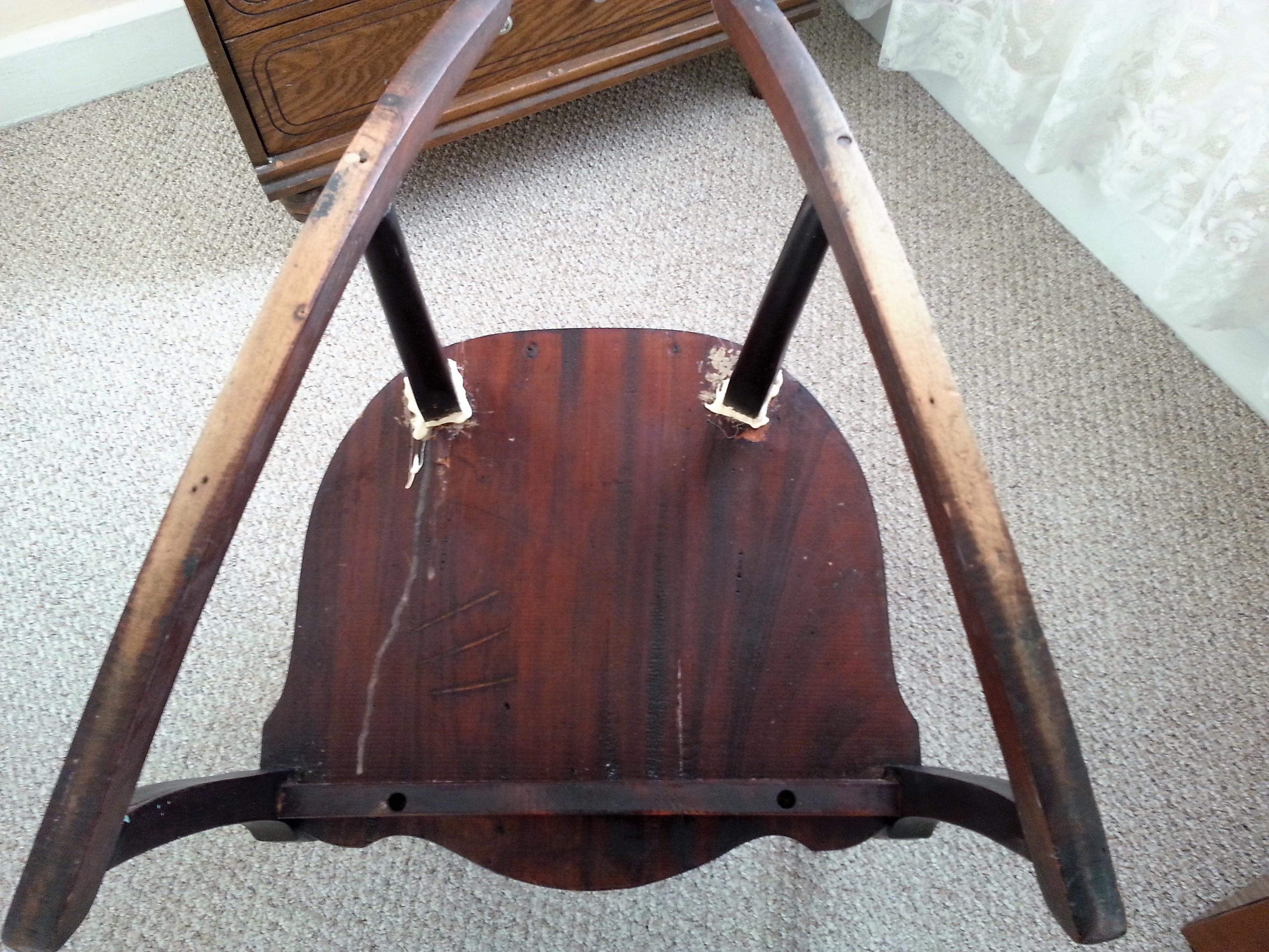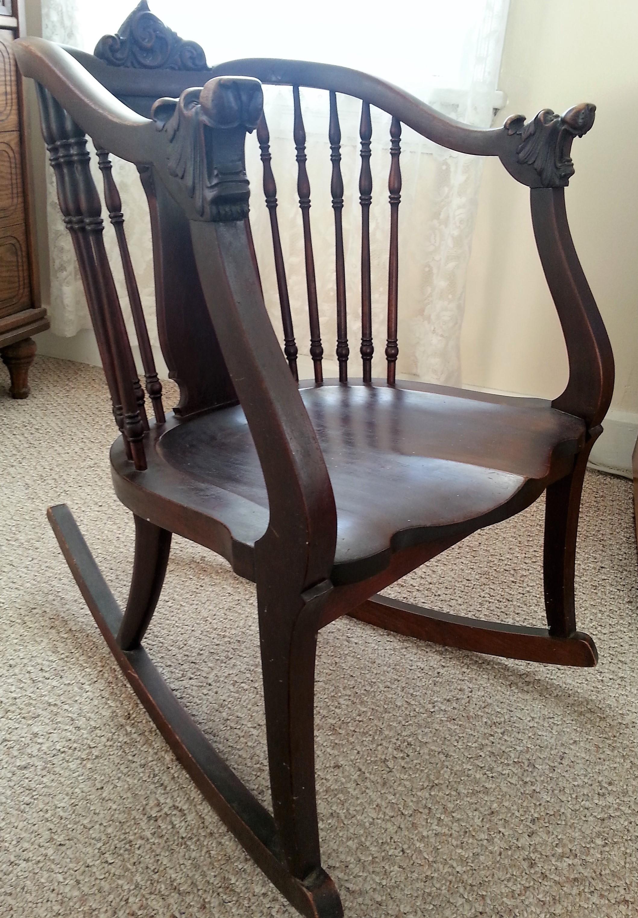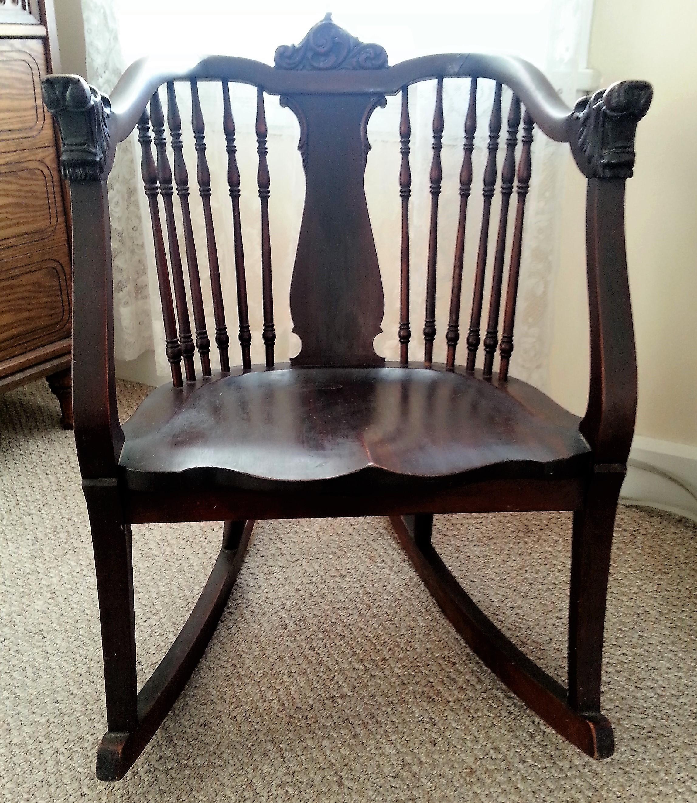 This hand-carved wood rocking chair belonged to my grandmother and has been in our home for nearly 50 years.  It is made of mahogany and has beautifully carved spindles, details & lion's head arm rests.  Measures:  22" Wide x 20" Deep x 32 1/2" High.  It is put together by pegs (at the top anyway).  There are no maker marks on the piece that I can see.  Collectors/experts from antique indentification sights suggest it is from the 1840-1850 era while others say it could be from 1900-1910.  Possible makers are Homer, stomps-Burkhardt, Jelliff and Morris Cook.  Estimated value could be from $450 to $2K.