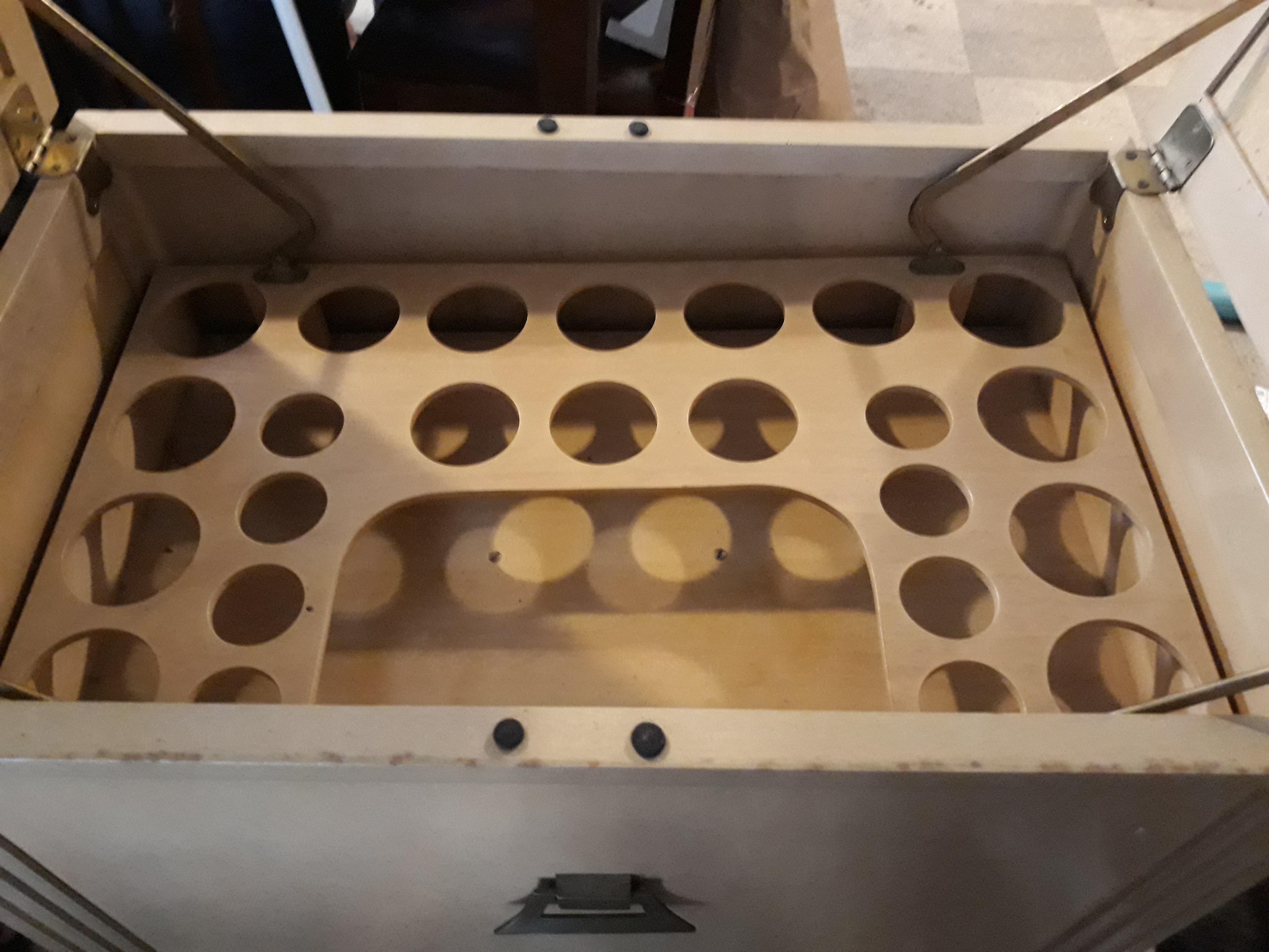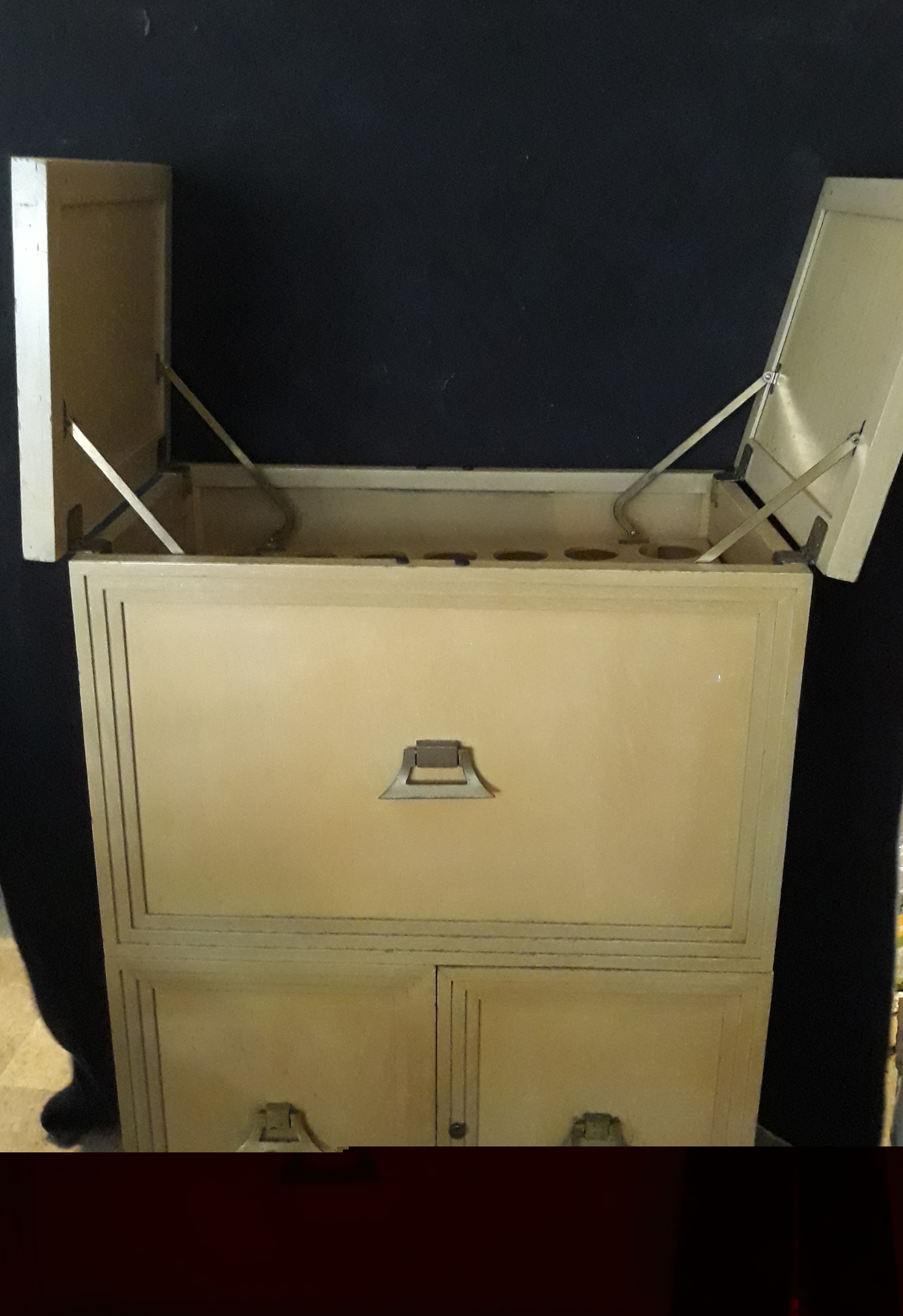 Liquor cabinet with drop down holder for glasses.