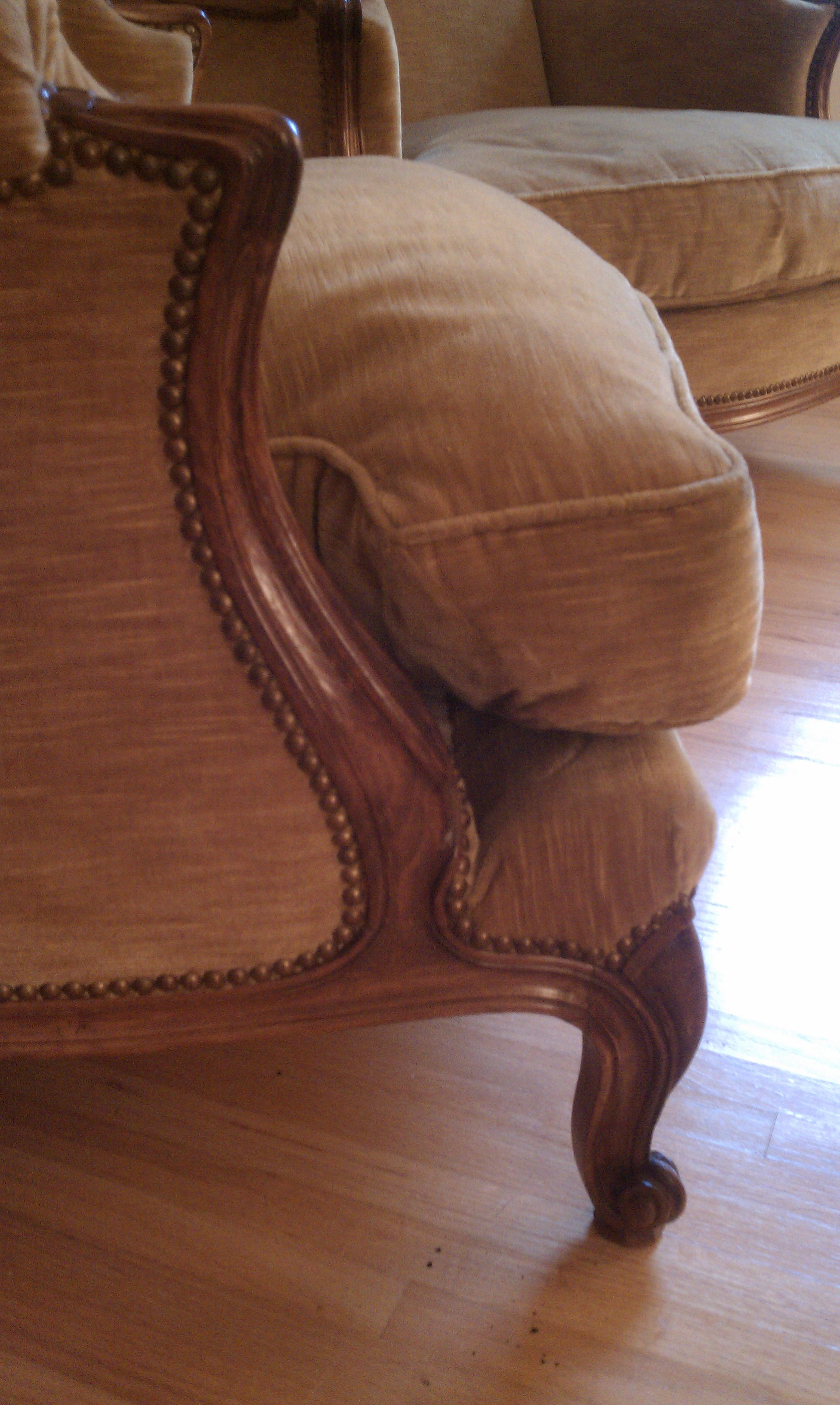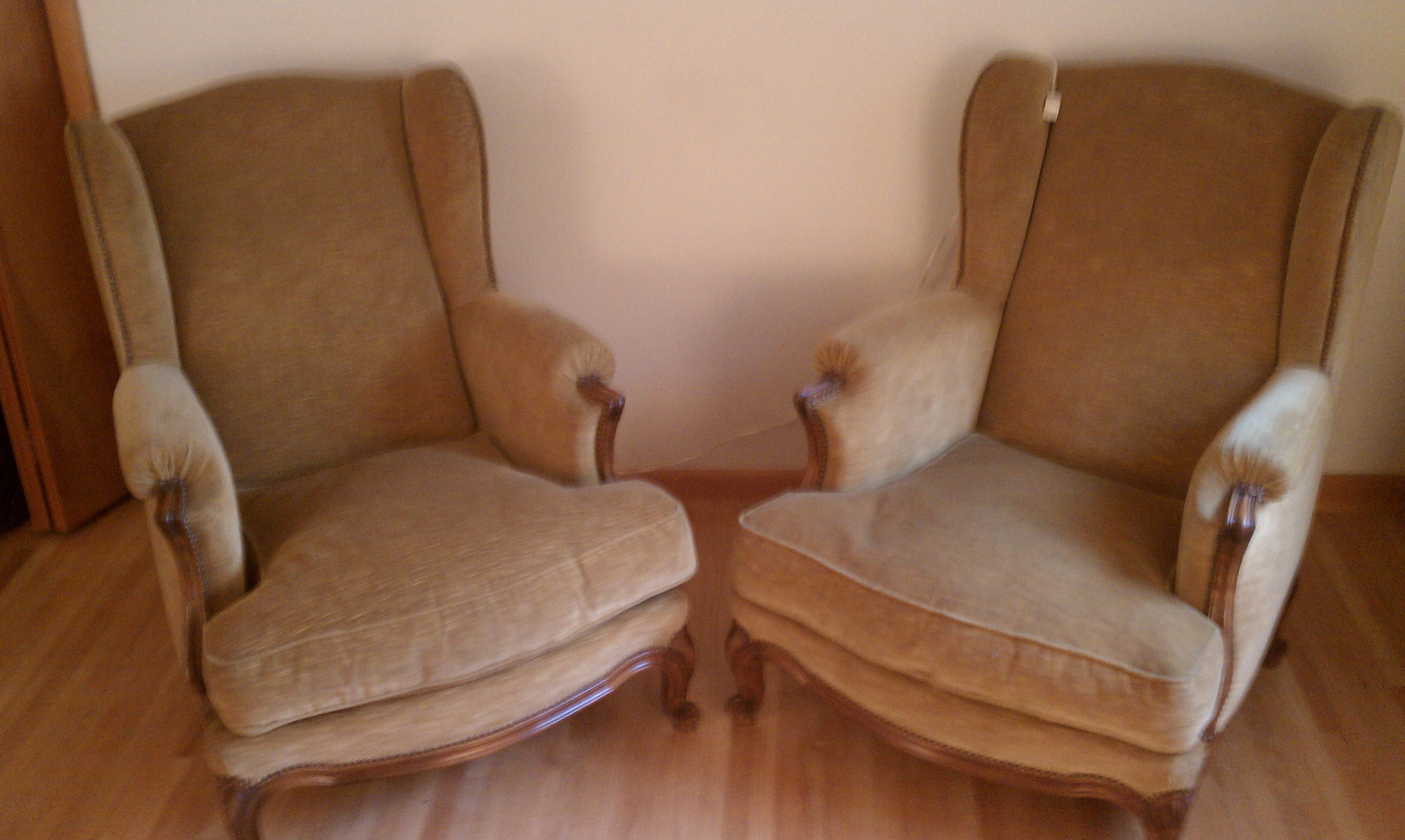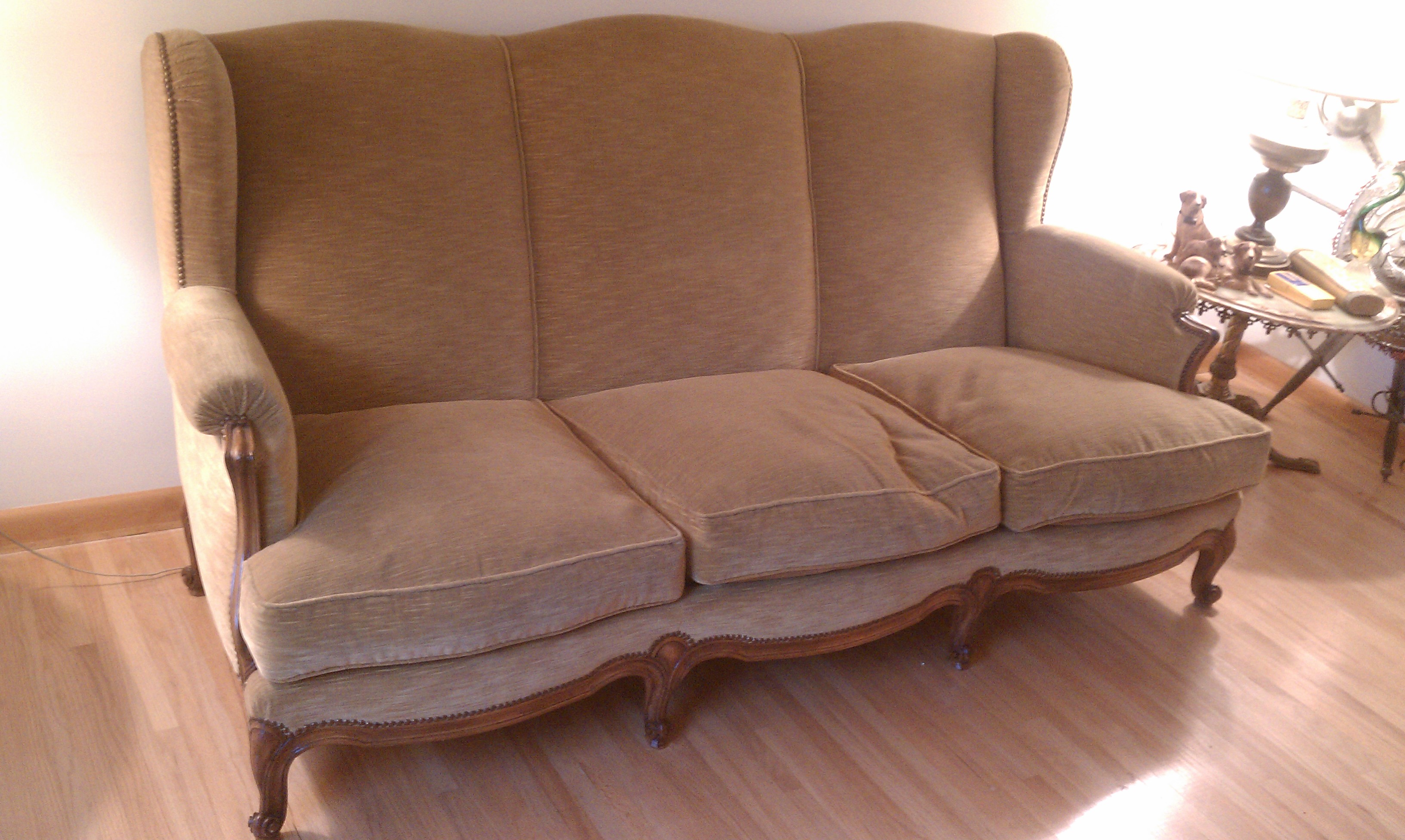 My parents bought this furniture in europe in the late 1950's or early 1960's. The set includes a sofa and 2 wingback chairs. The covering is a mustard colored heavy material ( feels almost like soft corduroy ). The material is secured all around the edges by some type of metal plugs that not only secure the material but also create a pattern all around the edges.