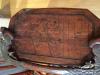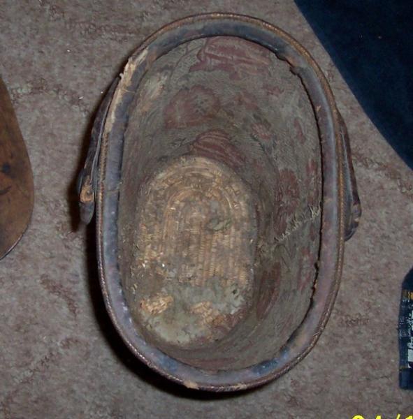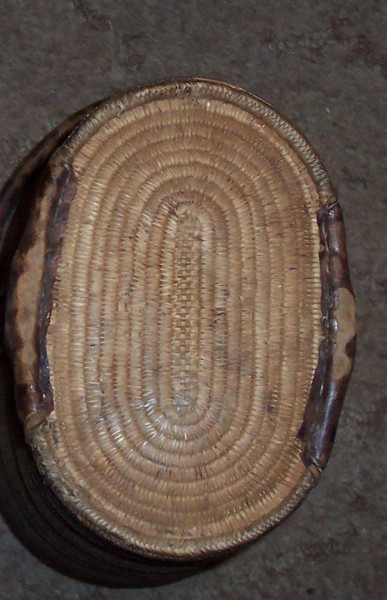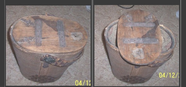 Top seems to be 1 piece Walnut with 2 metal straps nailed on to prevent a crack from spreading . Also try to notice that it has 2 ornamental pieces attached on the bottom of the lid toward the end that are raised up as they meet at the lip of the lid and will slide underneath a space in the piece to secure them firmly to it . At this point notice that an ornamental piece is attached to the top of the lid with a lock hole it meant to lock the lid down to the piece at this point .The locking mechanism is missing , but i can see that it was an oval shape with 2 squat leg shapes , with a square mechanism attached to it that held the lock itself .The outside sides and bottom are a woven material that i can only conclude is some type of straw ? The interior is lined with canvas as shown and the handle seems to be leather covered bentwood , The bottom fancy work is made of what feels like leather and there are large iron fancy bolts protruding through the handle to secure it to the piece .