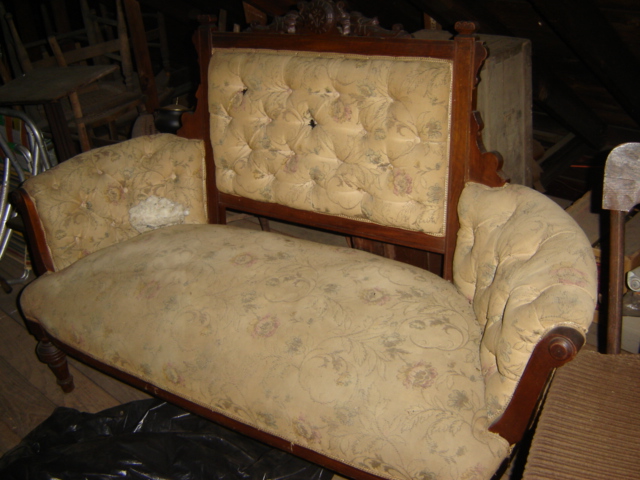 This was always called the "horse hair love-seat". I don't know if it's horse hair or not. The material is faded in the seat part, a mouse, unfortunately, chewed a hole in one arm about 3 inches wide. The wood is carved, the rest of the material and trim are not damaged.