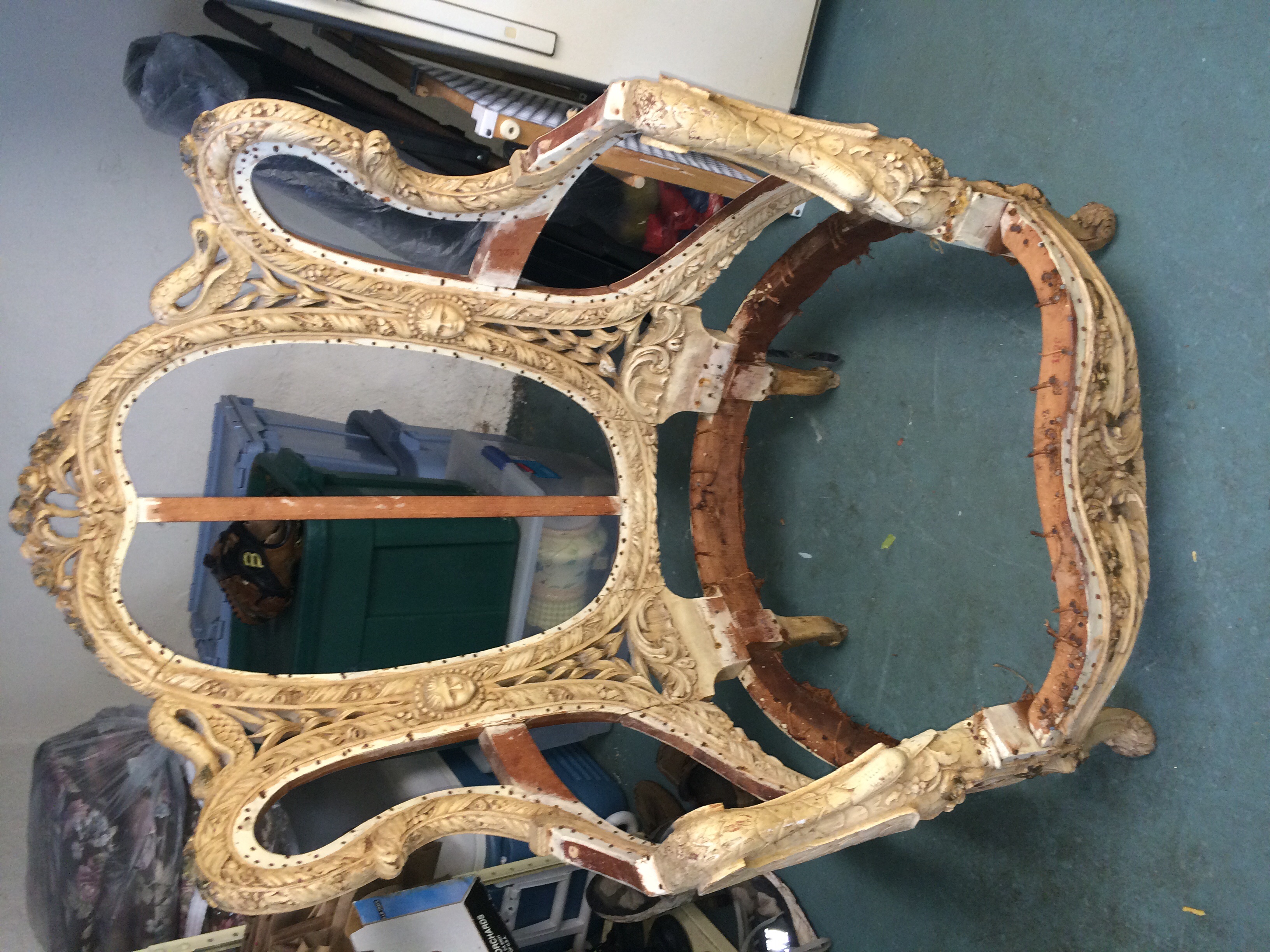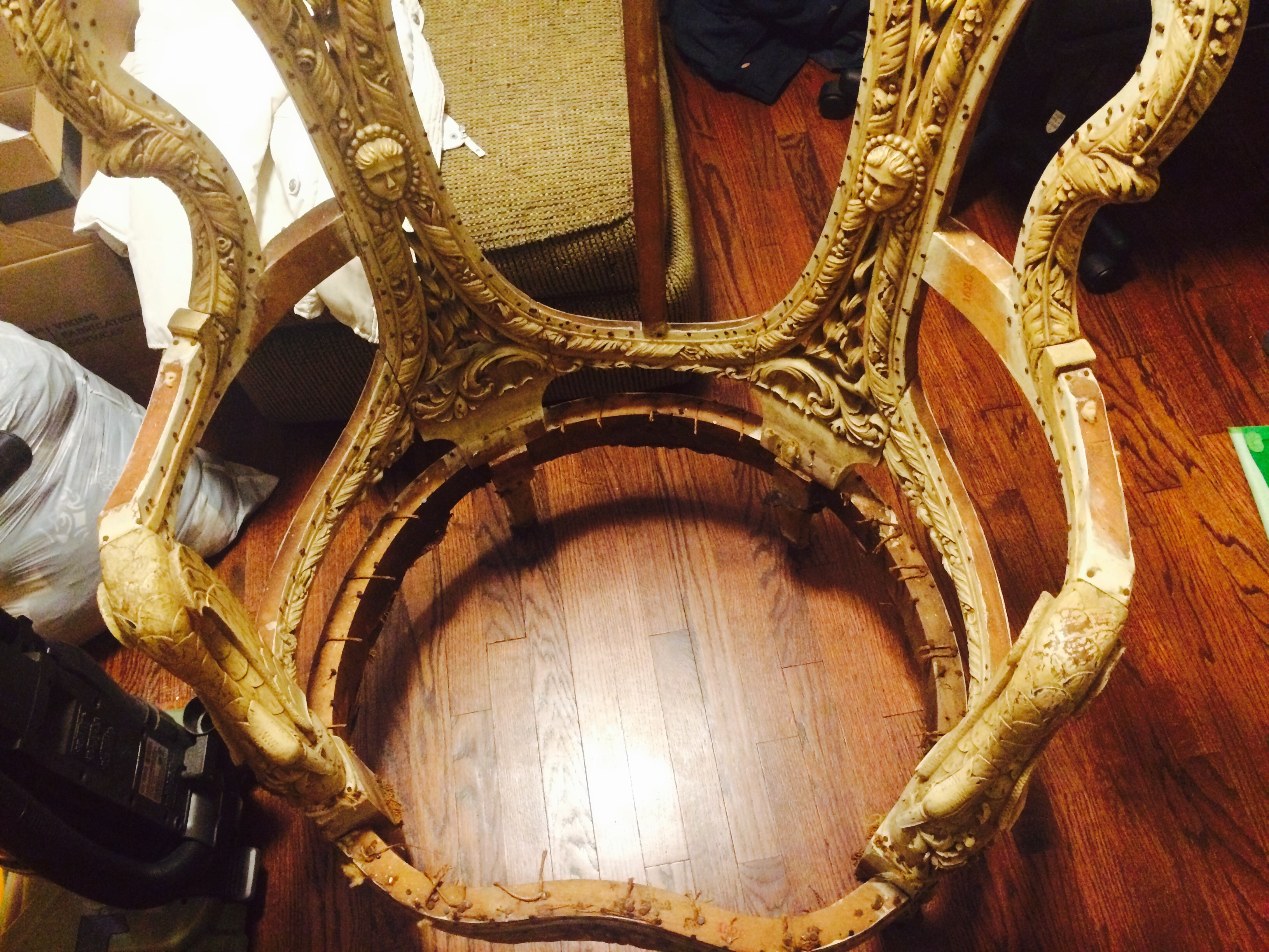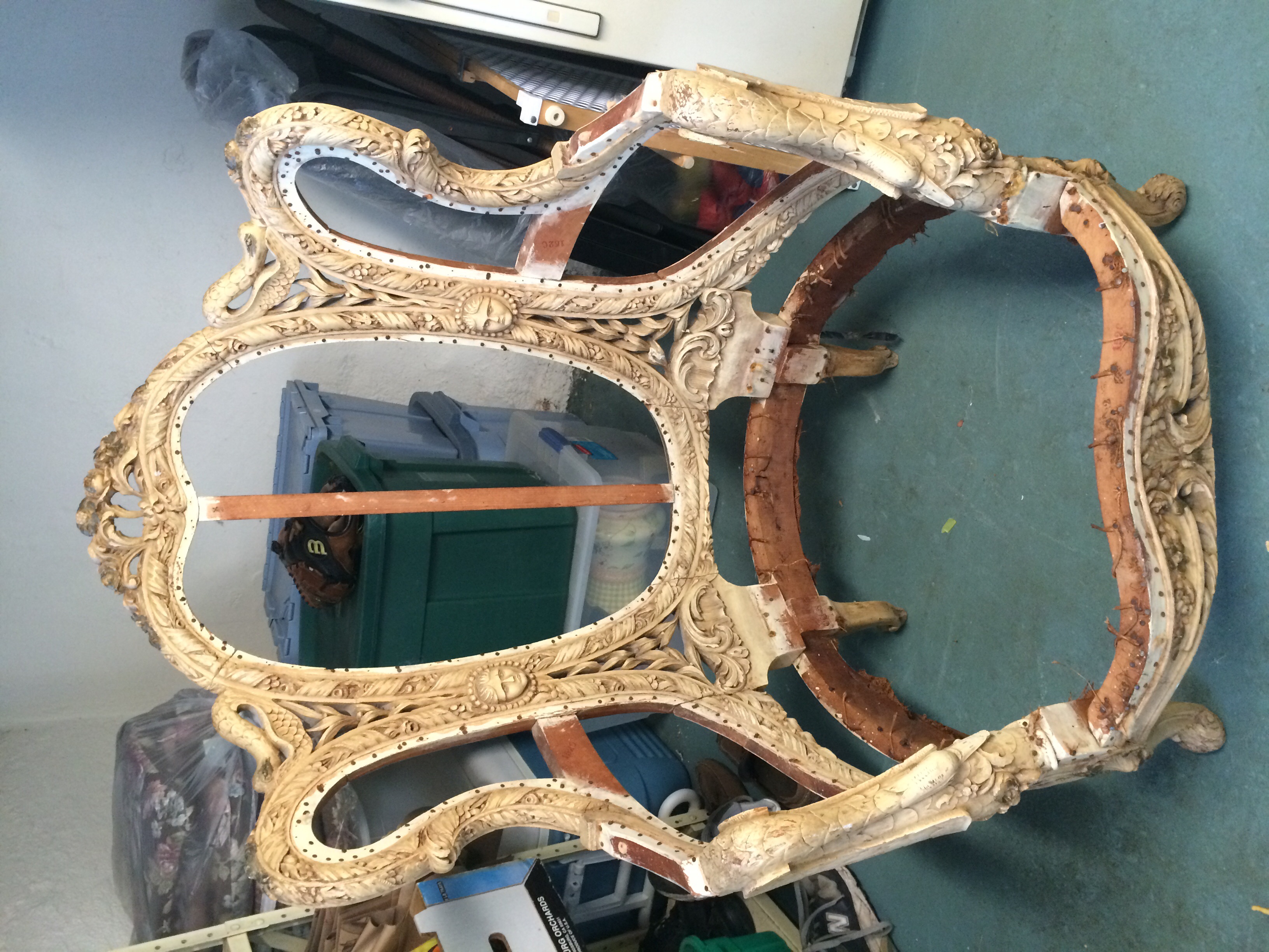 This chair measures a little over 3 feet tall and 2 1/2 feet wide. It has been painted over white and there's no markings that I can tell. The old fabric had a stamp saying ITALY but the condition was far too ruined to salvage. Ideally I would like to know a little more information on this peice so I can restore it.