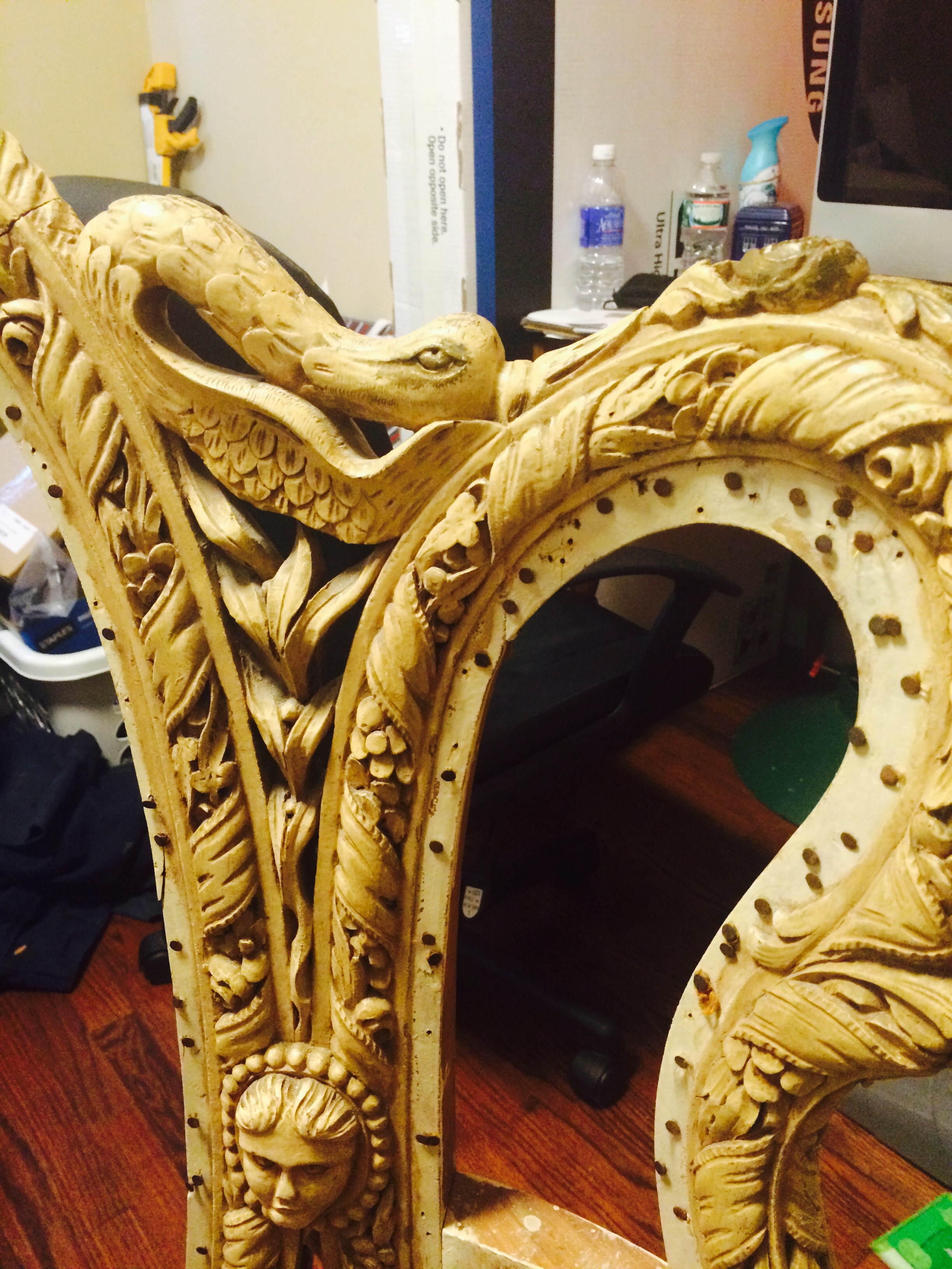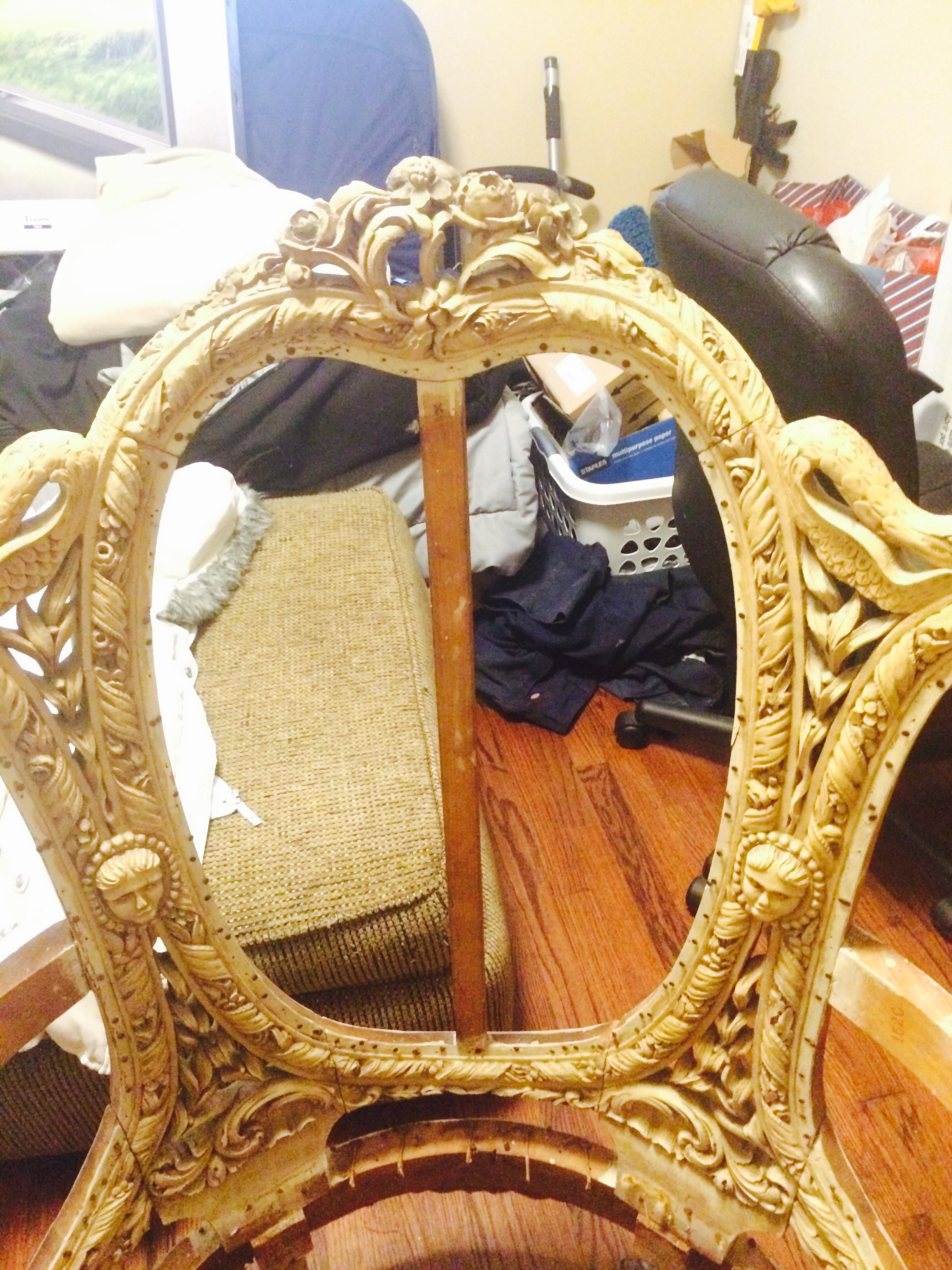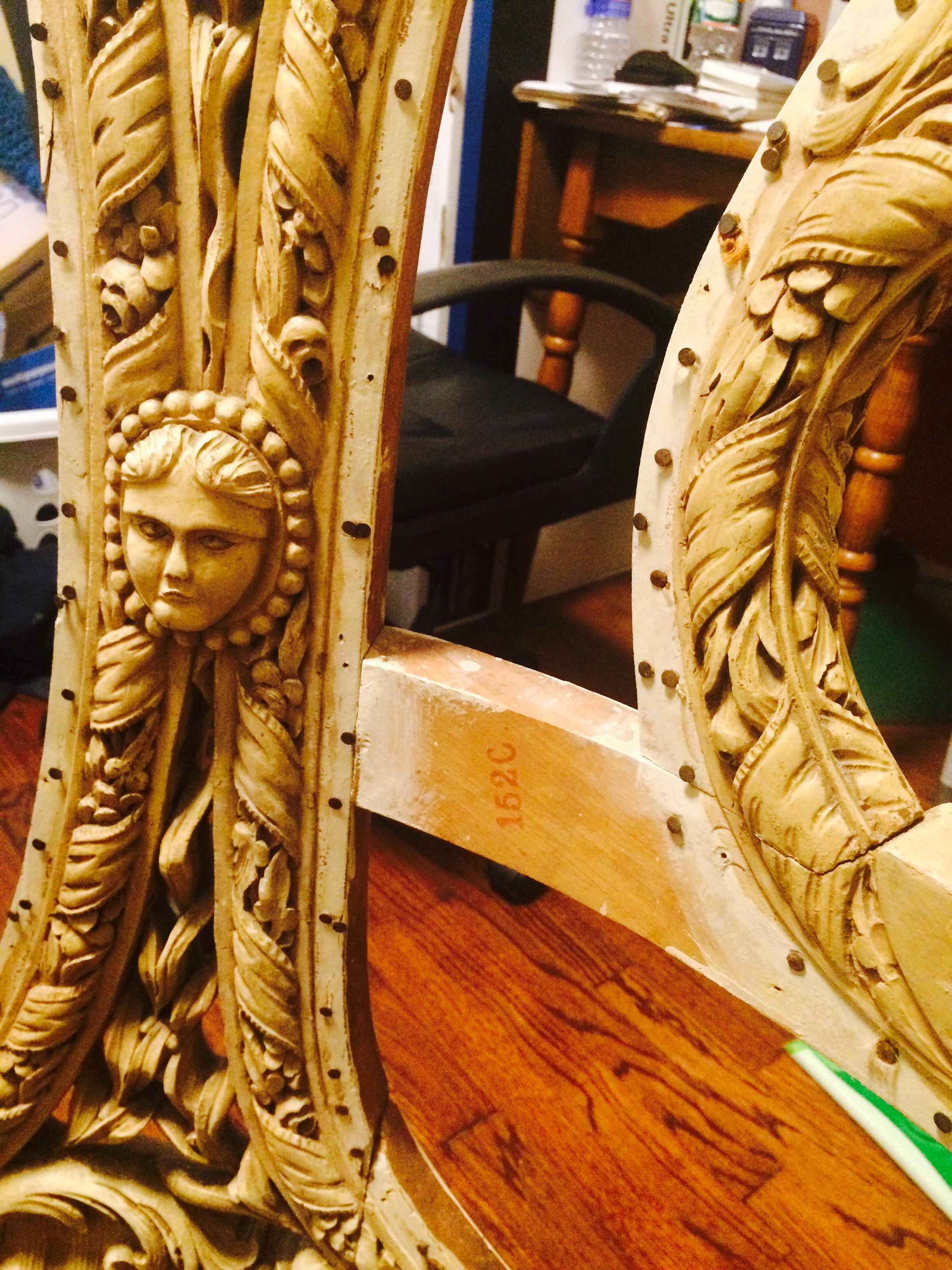 This chair measures a little over 3 feet tall and 2 1/2 feet wide. It has been painted over white and there's no markings that I can tell. The old fabric had a stamp saying ITALY but the condition was far too ruined to salvage. Ideally I would like to know a little more information on this peice so I can restore it.