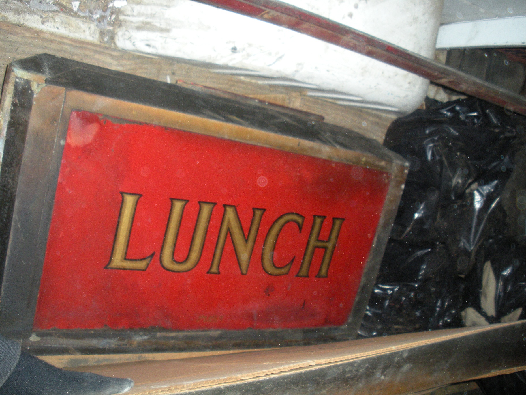 This is an antique glass "Lunch" sign with the metal hanging frame
