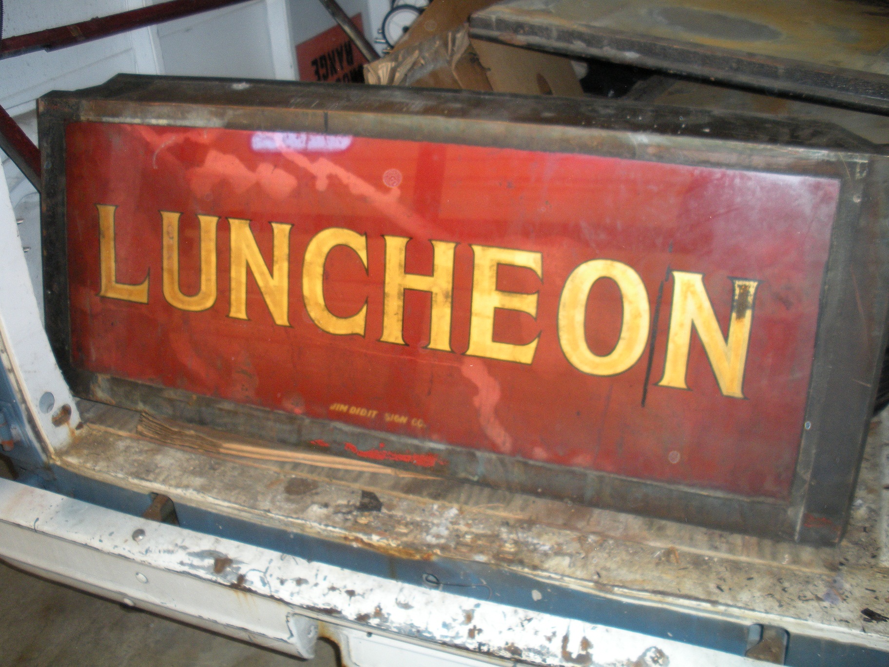 This is a "Luncheon" sign made by the Jim Did It sign company.It's made of glass, and has a chip in the metal frame.