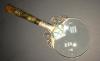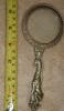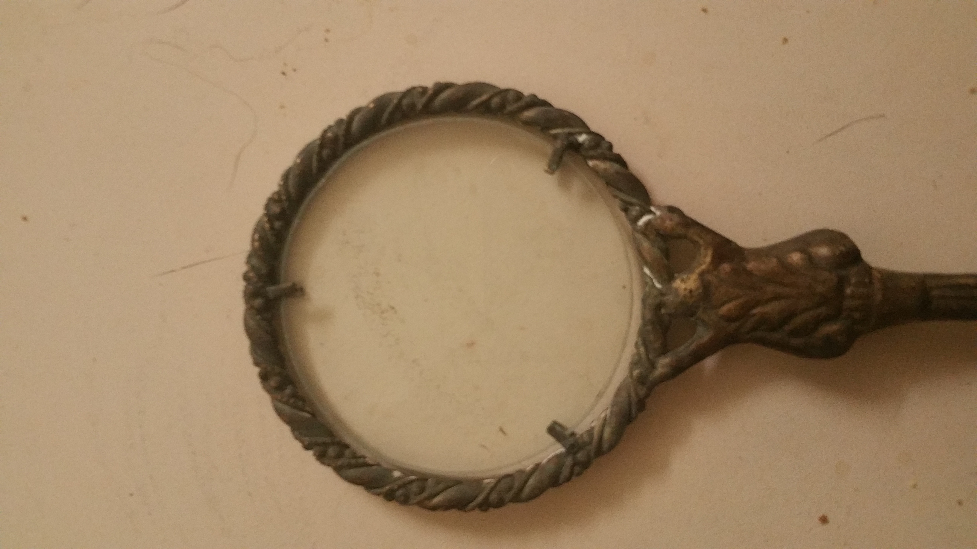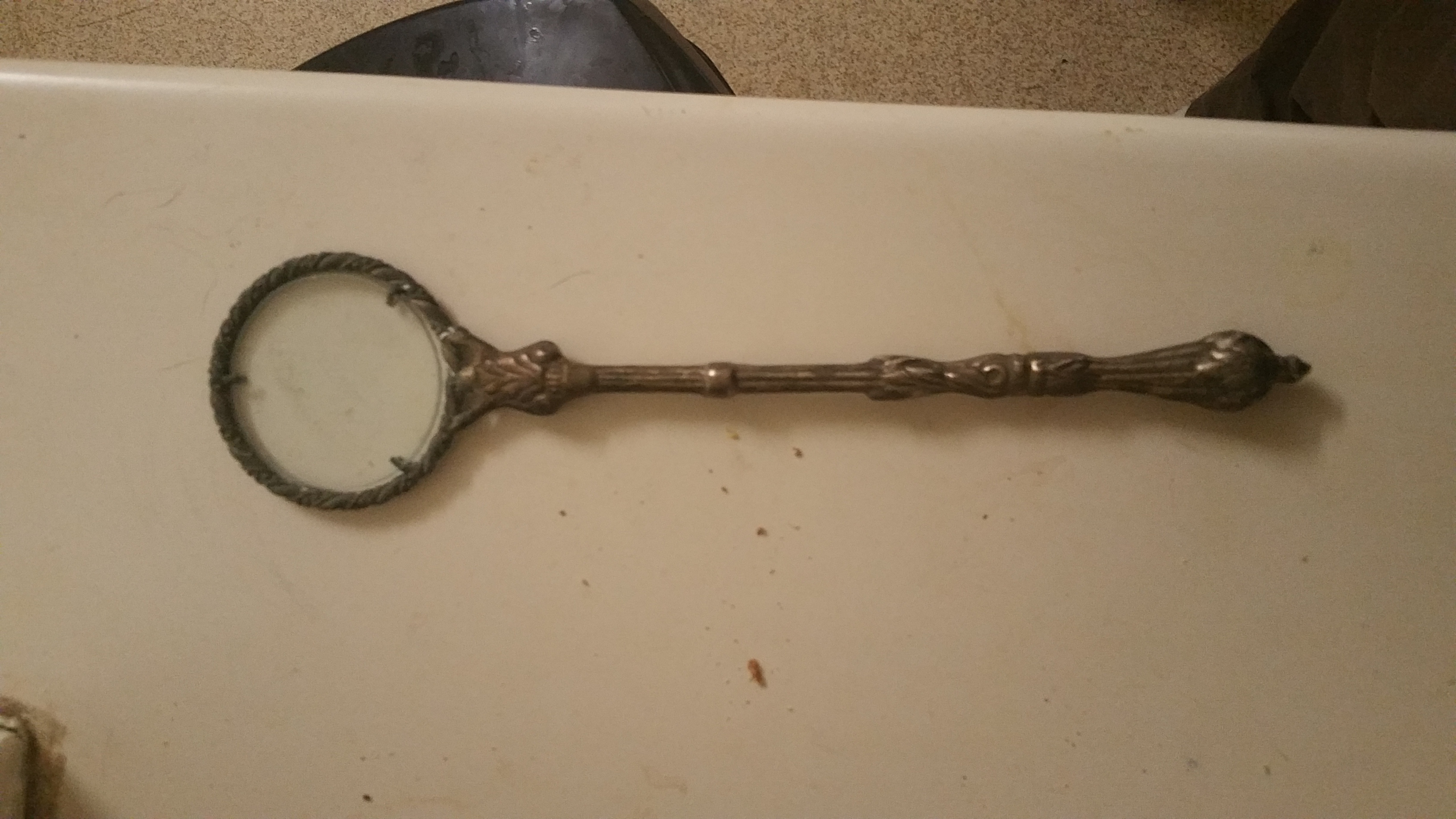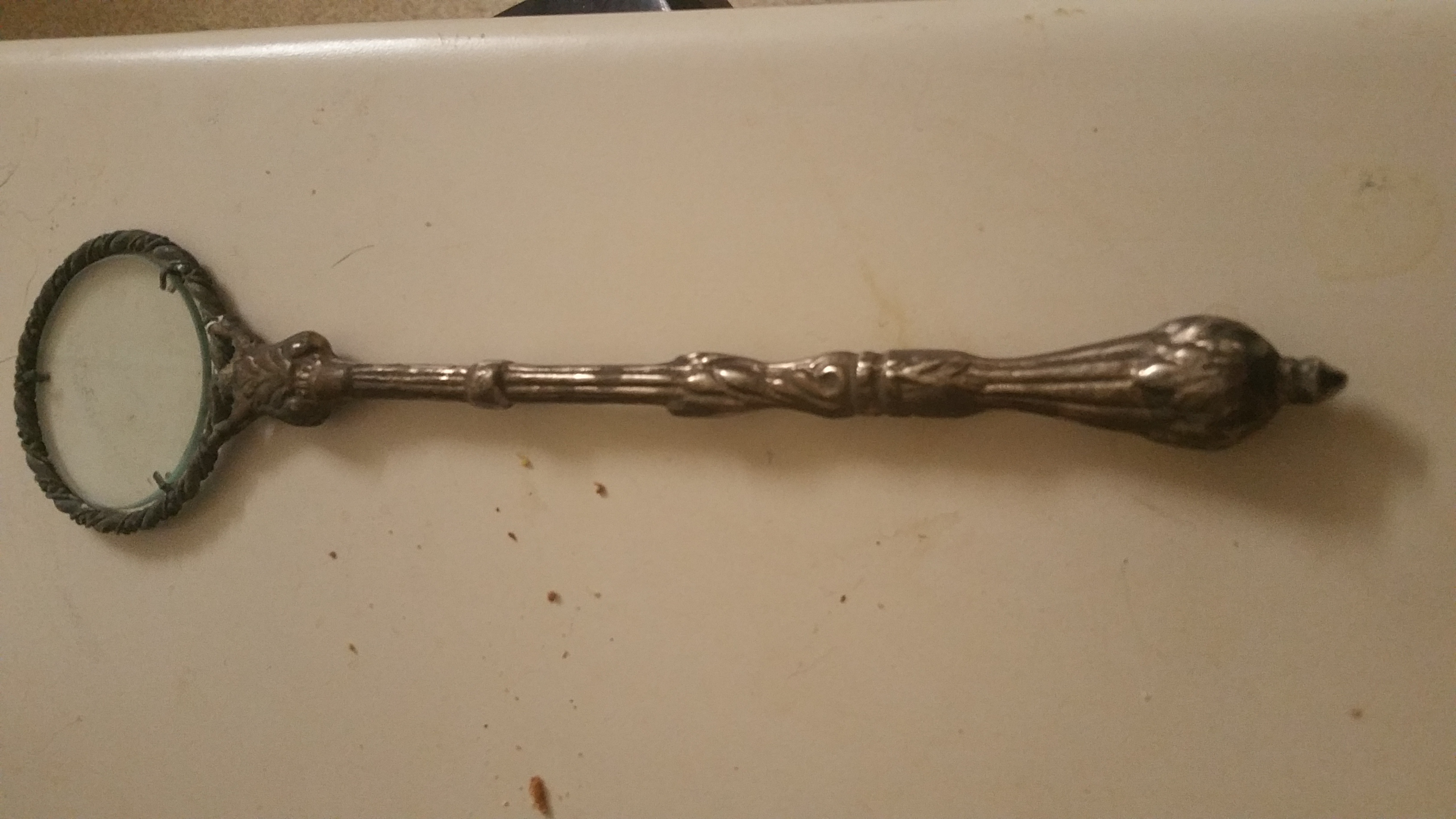 It's about 12 inches long it has no markings, it has a Braided top with three clasps holding the glass in place, it looks to be copper with silver plate.