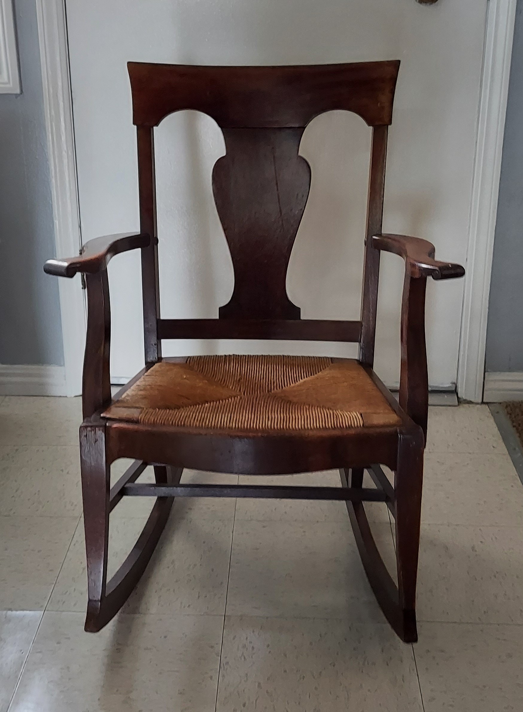 Antique Mahogany rocking chair. Rush caned seat is framed in wood and handwoven. Very solid smooth rocker.