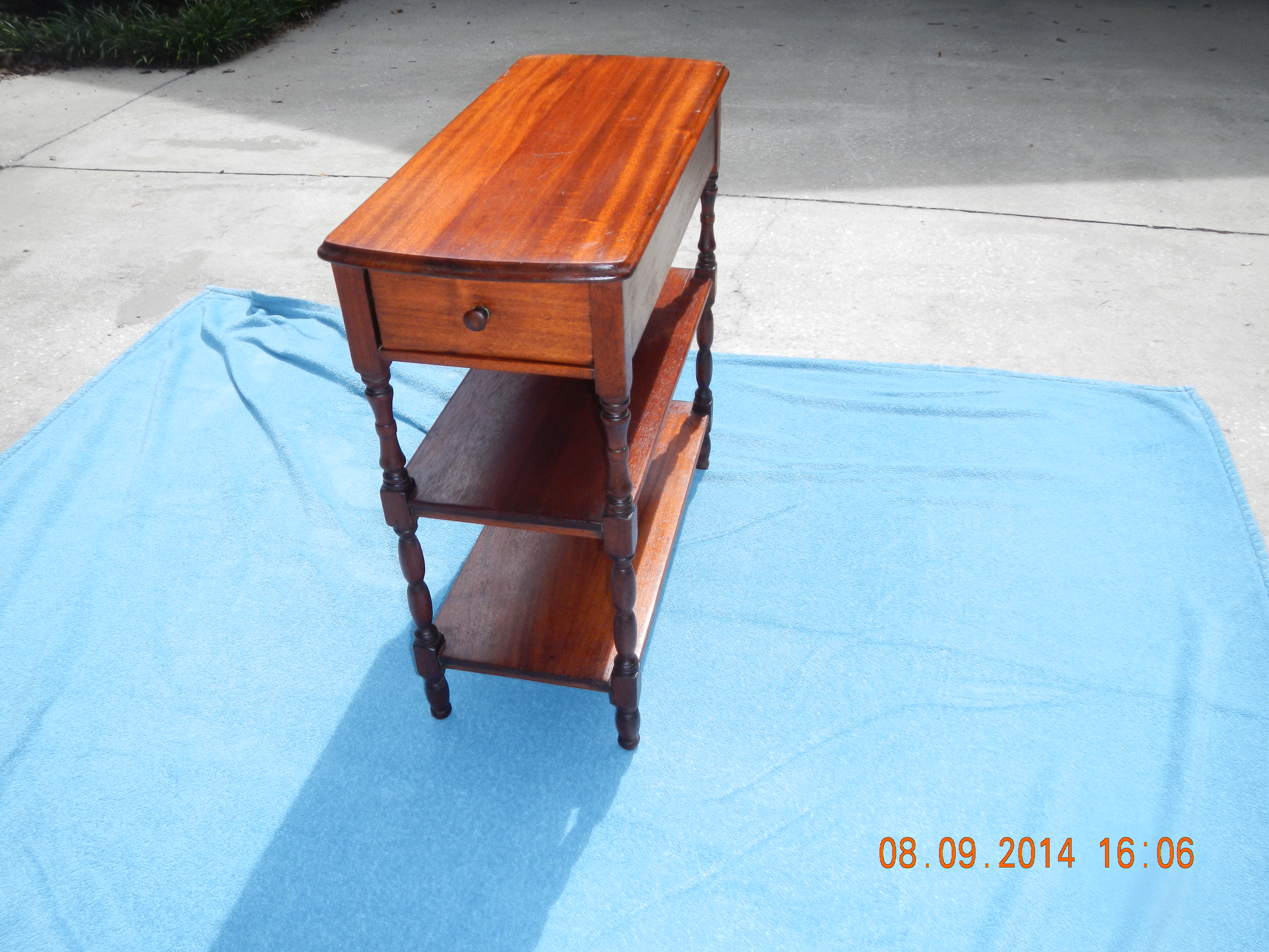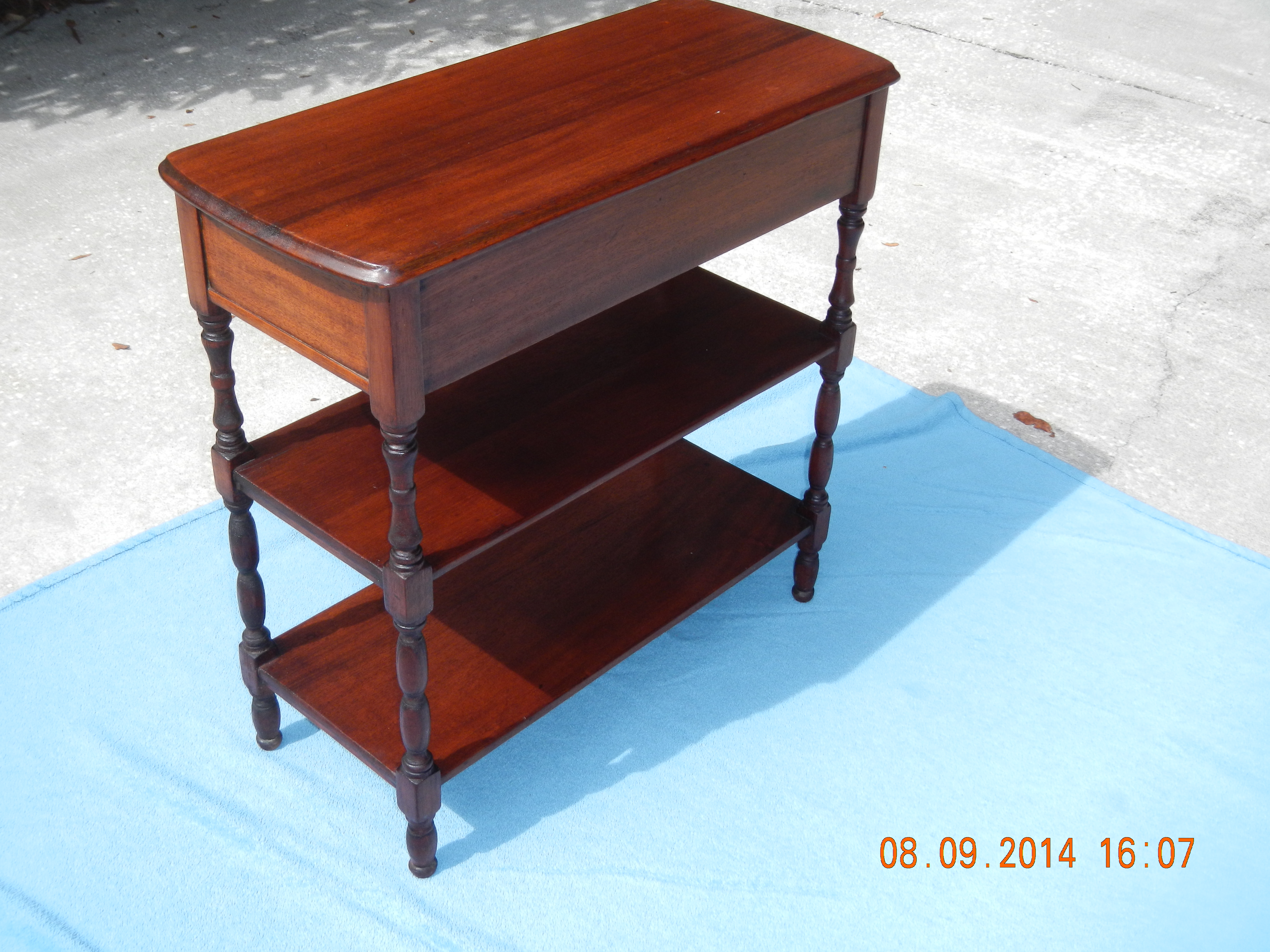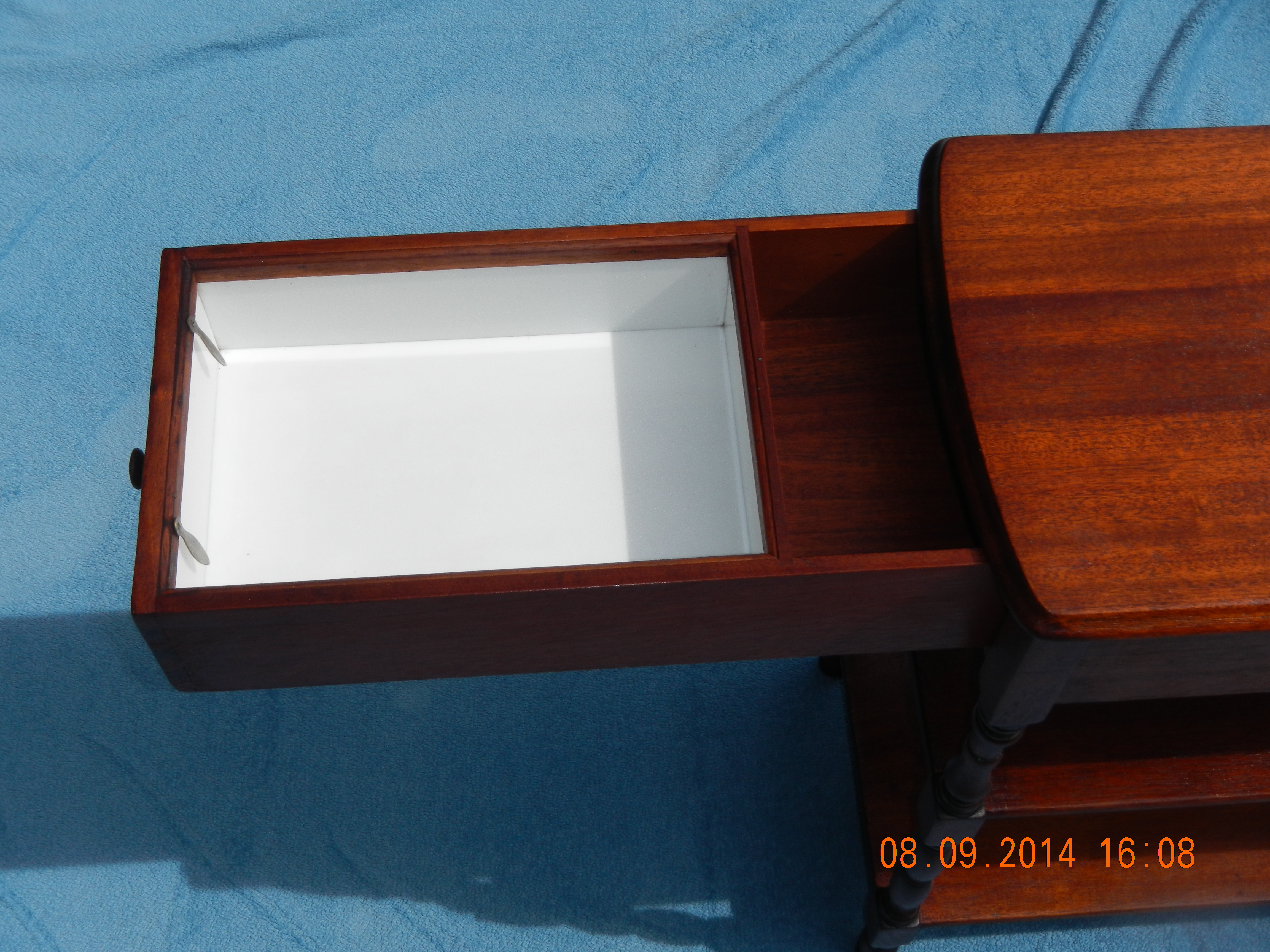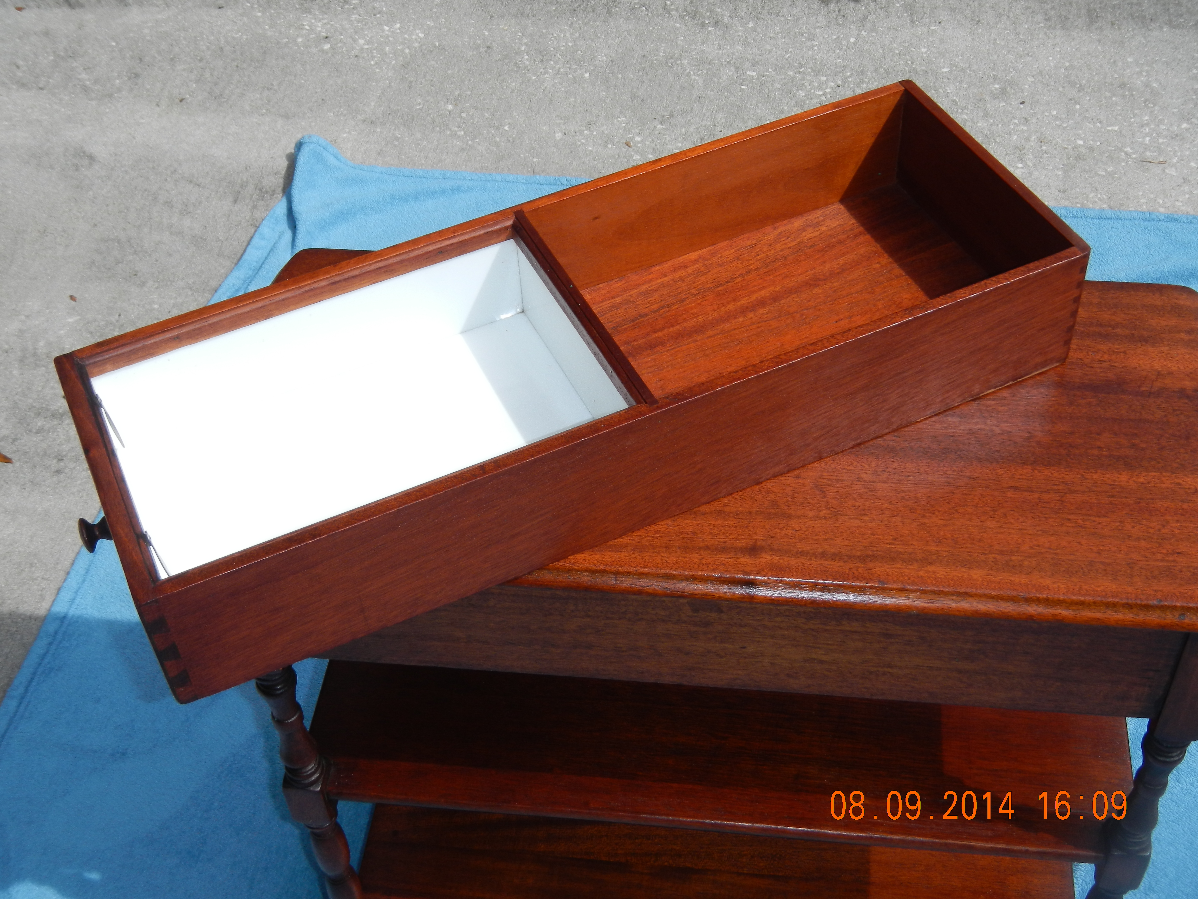 Antique Mahogany Side Table with two shelves and one drawer. Drawer is unique in that it has a front and back half. Initially when you open the drawer you see a section that is lined in a white, shiny, plastic type material. However, if you open further, there is a second half that is not lined. The front lined portion also has two oval metal pieces that rotate freely (look like mini letter openers) that I am not sure what they were for. The spindle legs appear to have been hand carved and the table has no markings. The drawers have excellent dove tailing and the back of the drawers corners are slightly curved. It appears to be a very high quality piece.