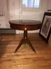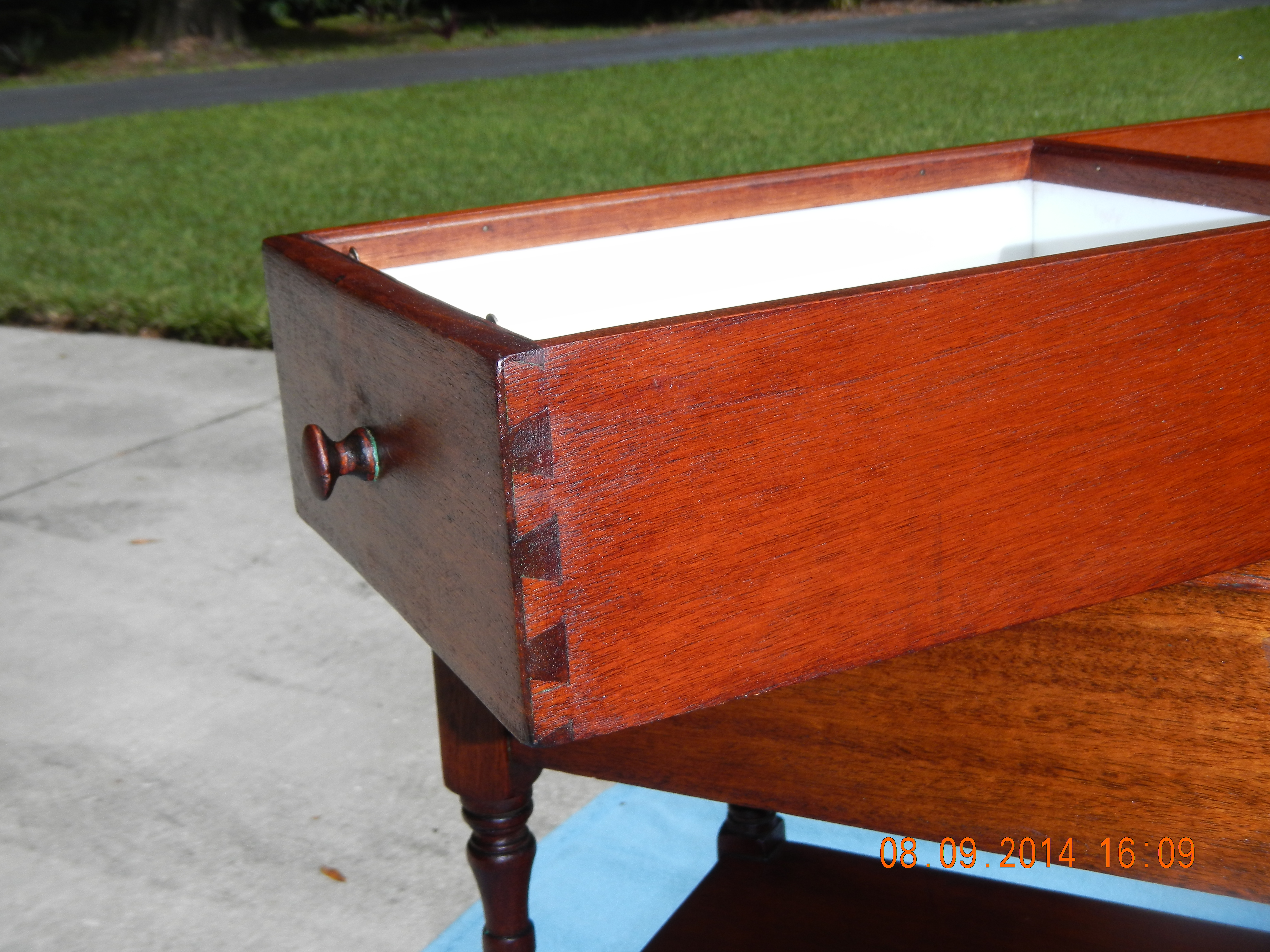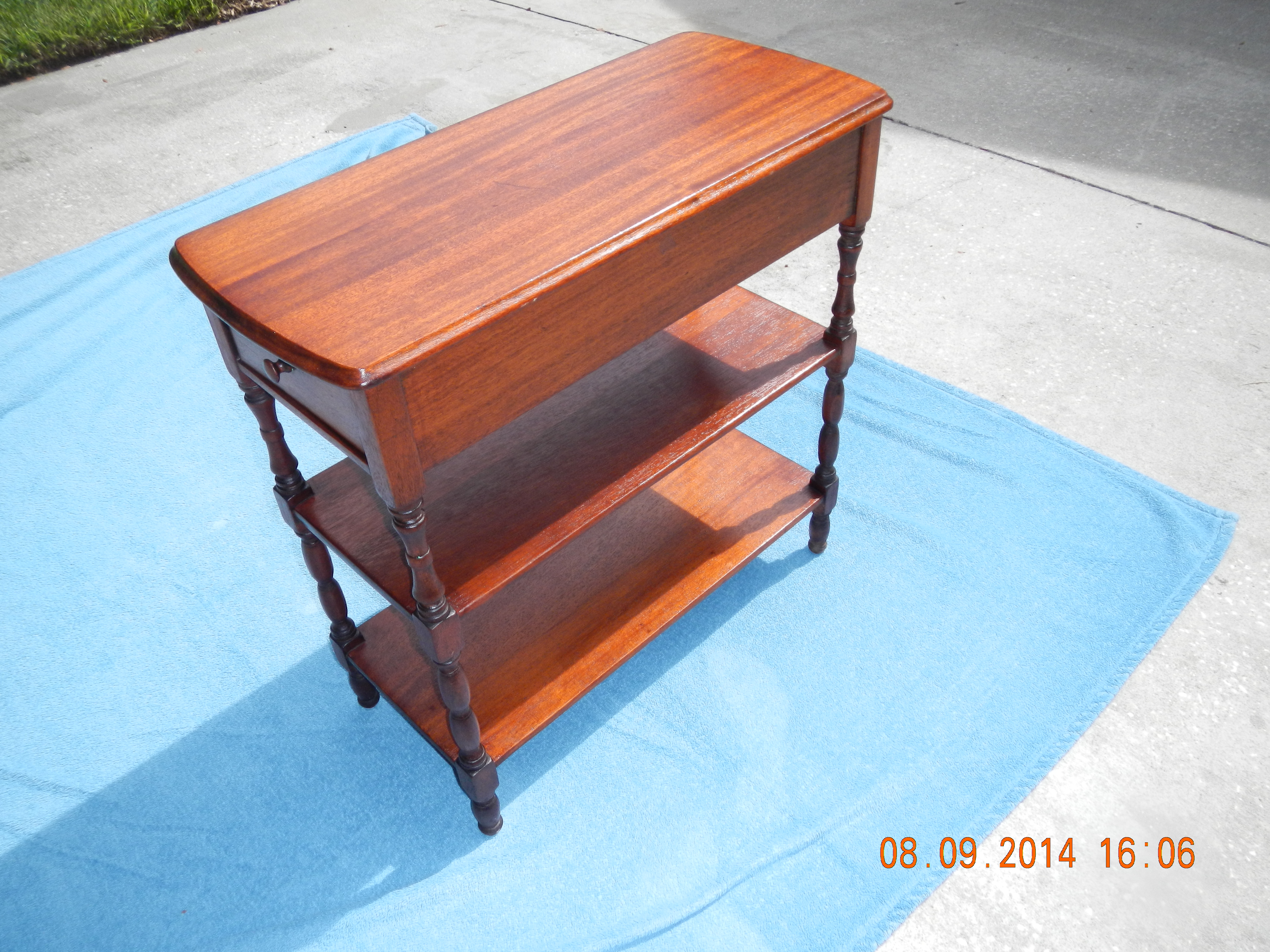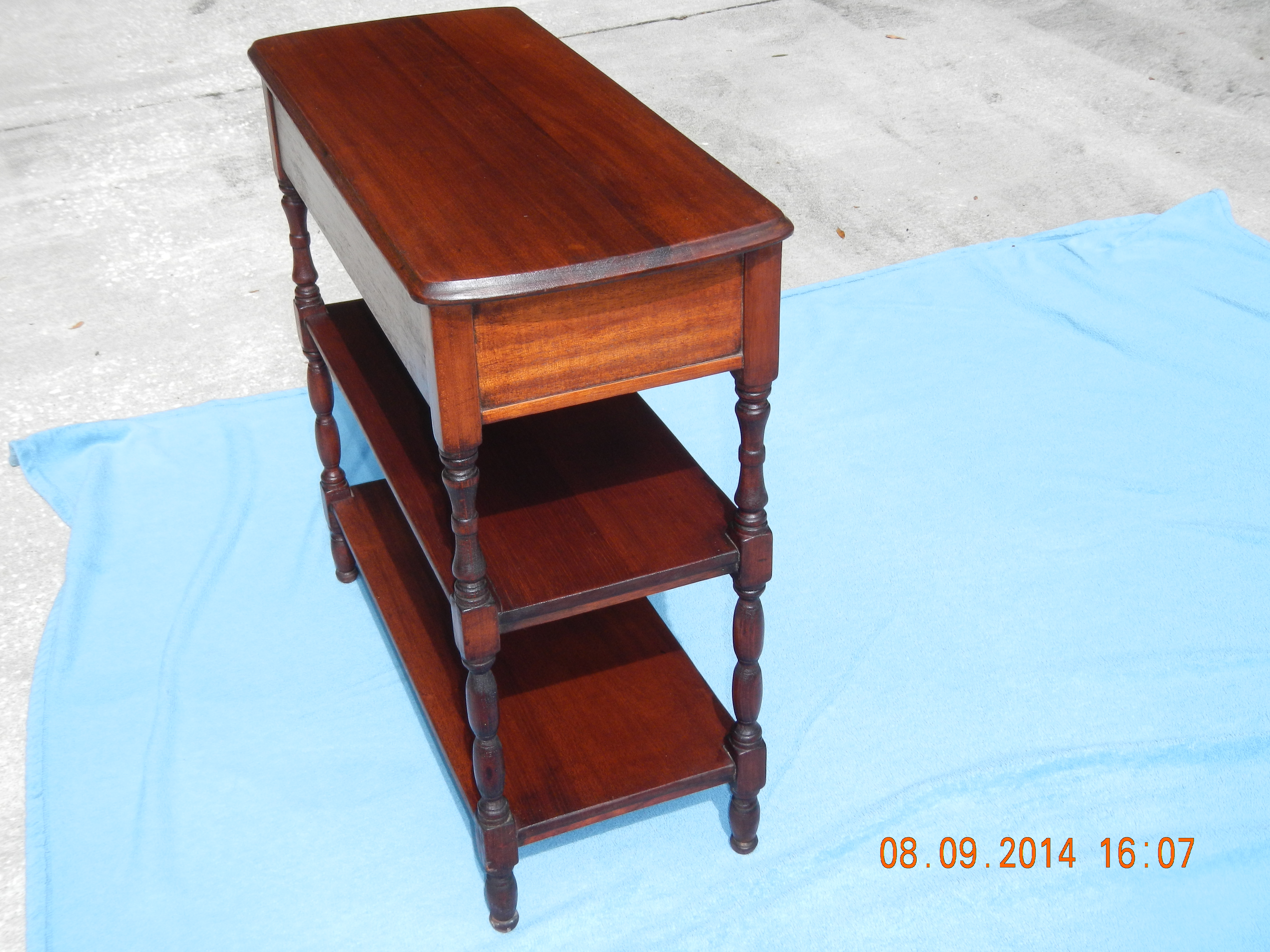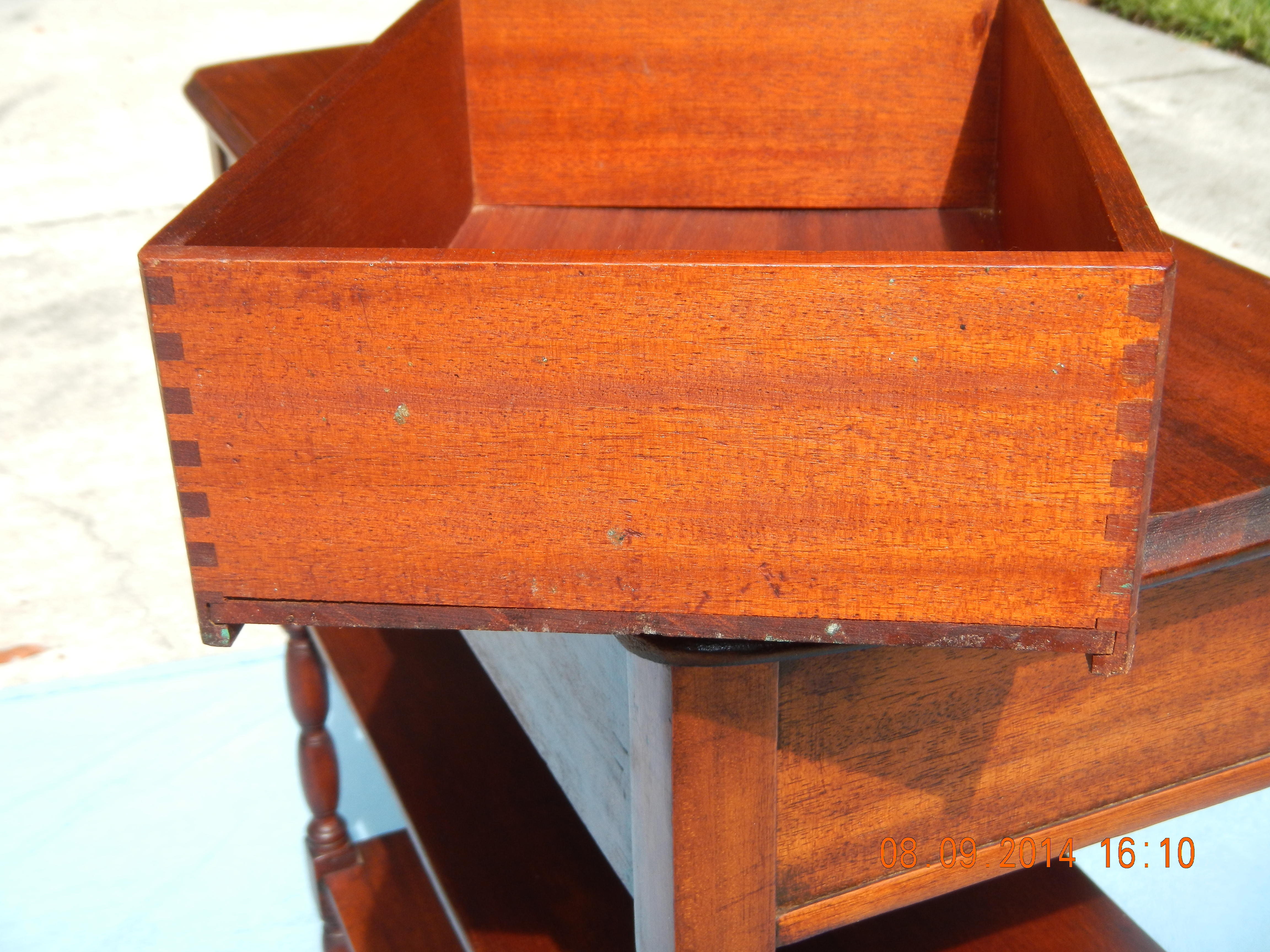 Antique Mahogany Side Table with two shelves and one drawer. Drawer is unique in that it has a front and back half. Initially when you open the drawer you see a section that is lined in a white, shiny, plastic type material. However, if you open further, there is a second half that is not lined. The front lined portion also has two oval metal pieces that rotate freely (look like mini letter openers) that I am not sure what they were for. The spindle legs appear to have been hand carved and the table has no markings. The drawers have excellent dove tailing and the back of the drawers corners are slightly curved. It appears to be a very high quality piece.