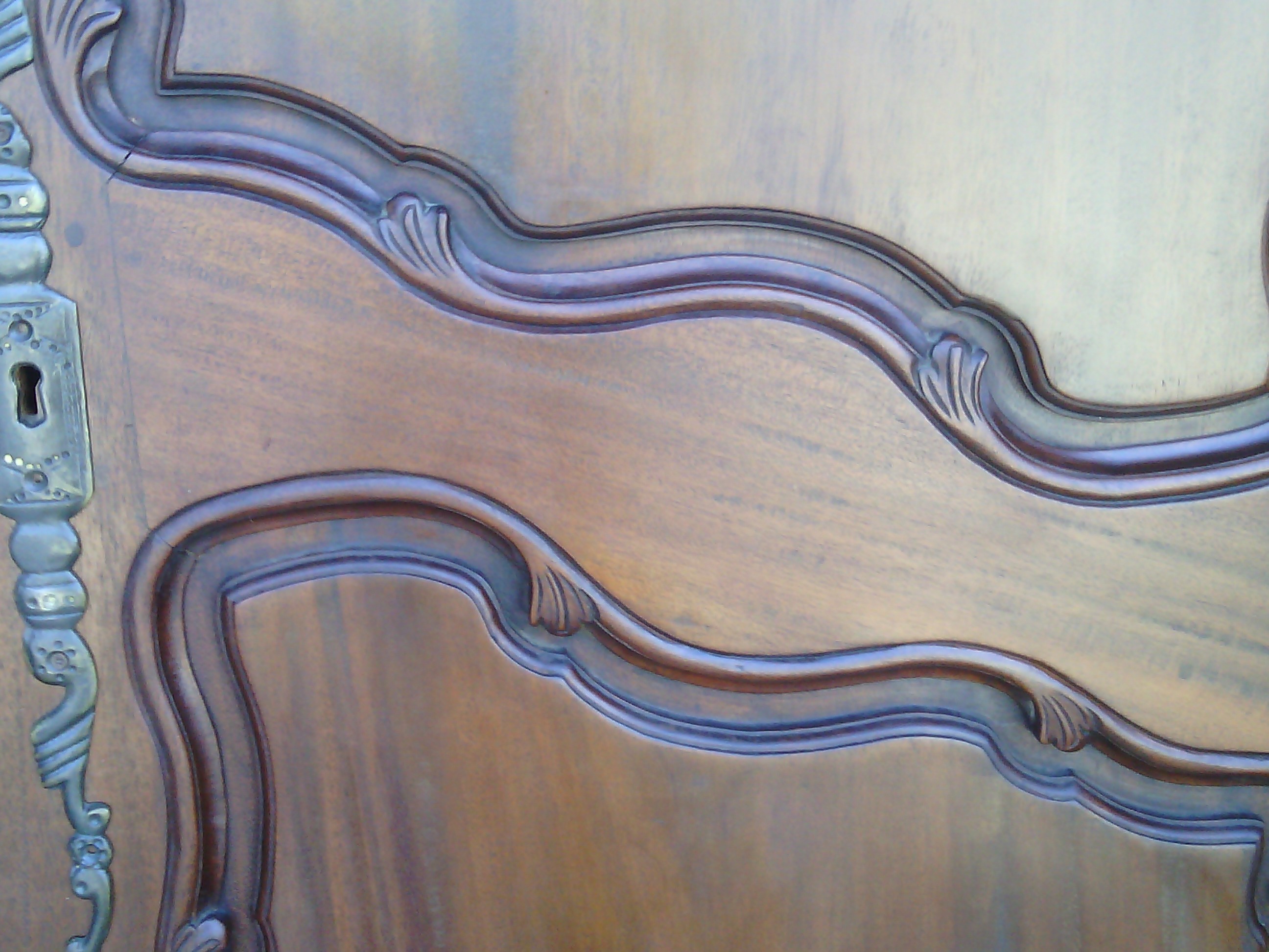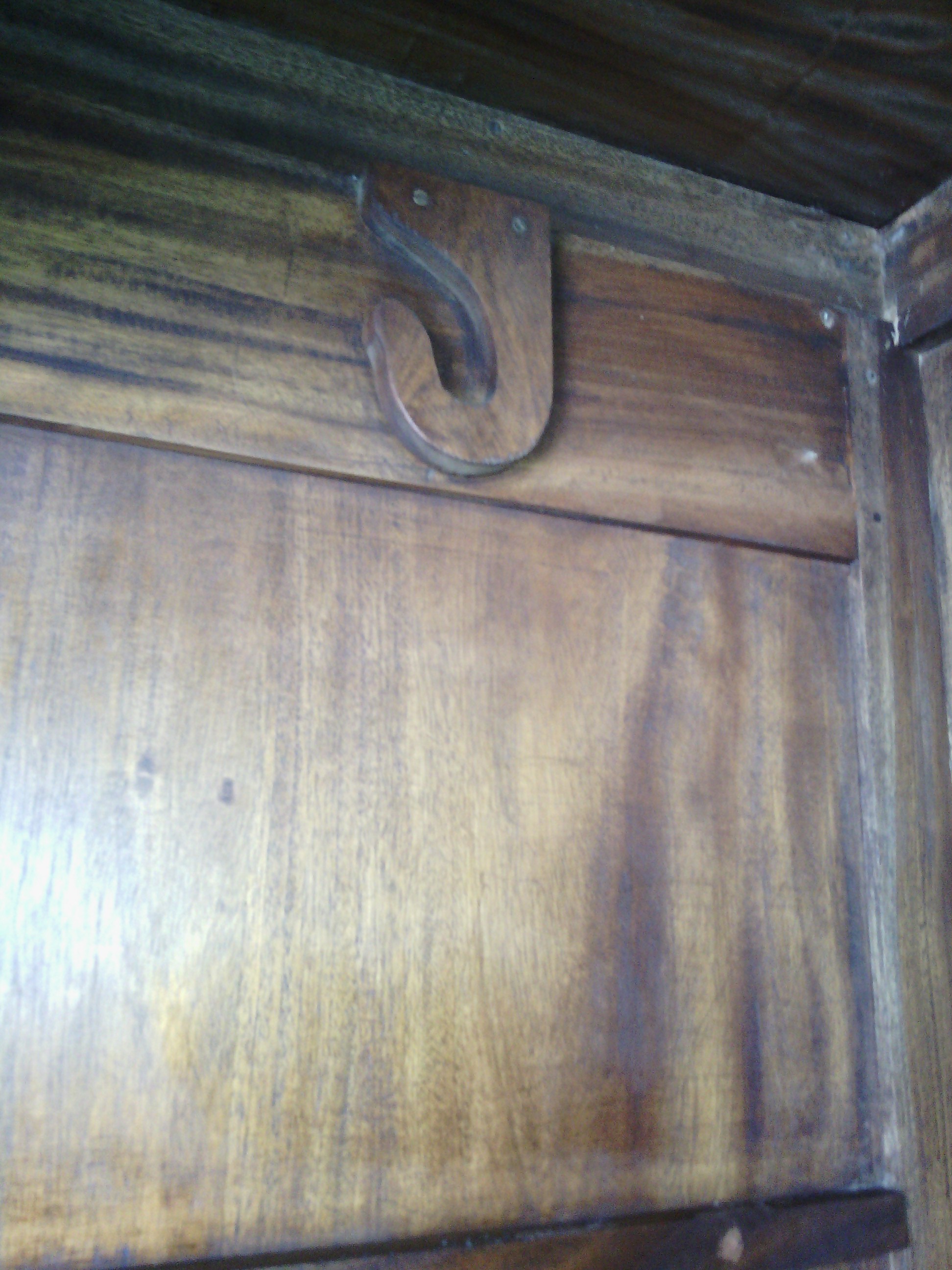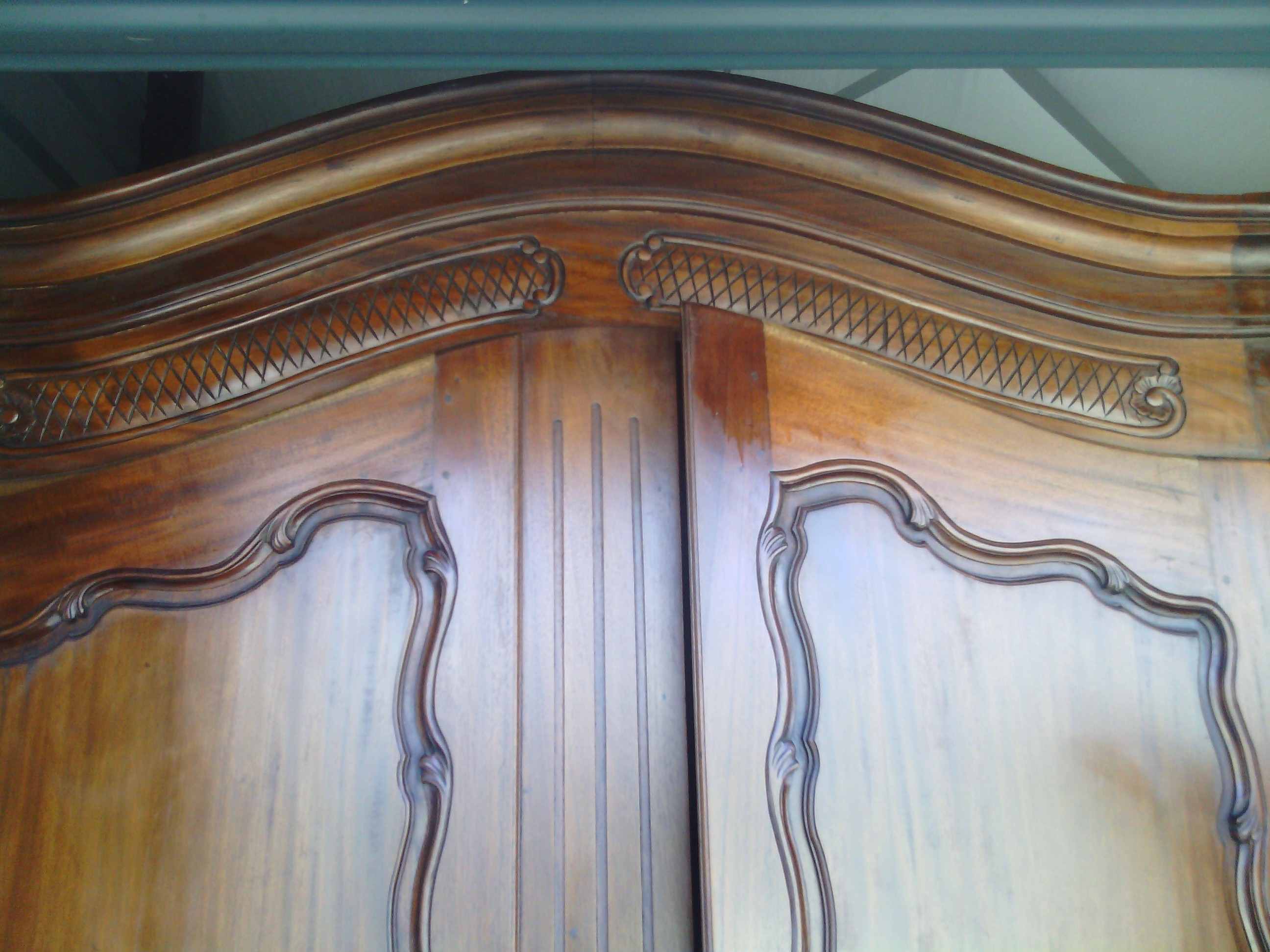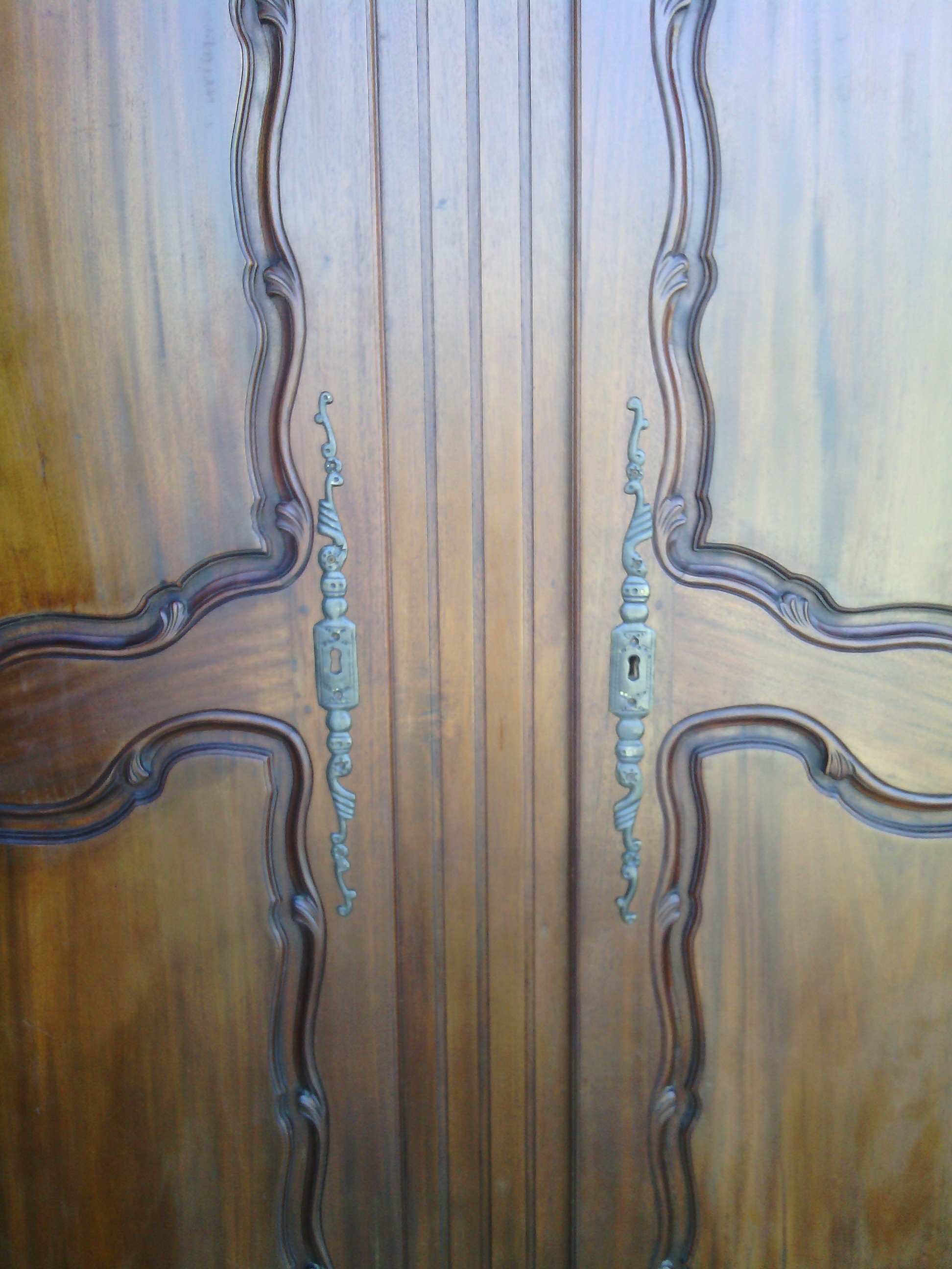 Anitique Mahogany Wardrobe Armoire. Approximate measurements are 7'6" x 4'9" x 2'. There are 2 drawers inside and wooden fixtures for holding a clothes pole. It has beautiful claw feet and waffle and flower carvings. It has an inside metal latch that is stamped "Madico" and a skeleton key lock. All of the screws are flatheads. This armoire is solid, very big and very heavy. It seems to have the original finish which is beautiful and without scratches.