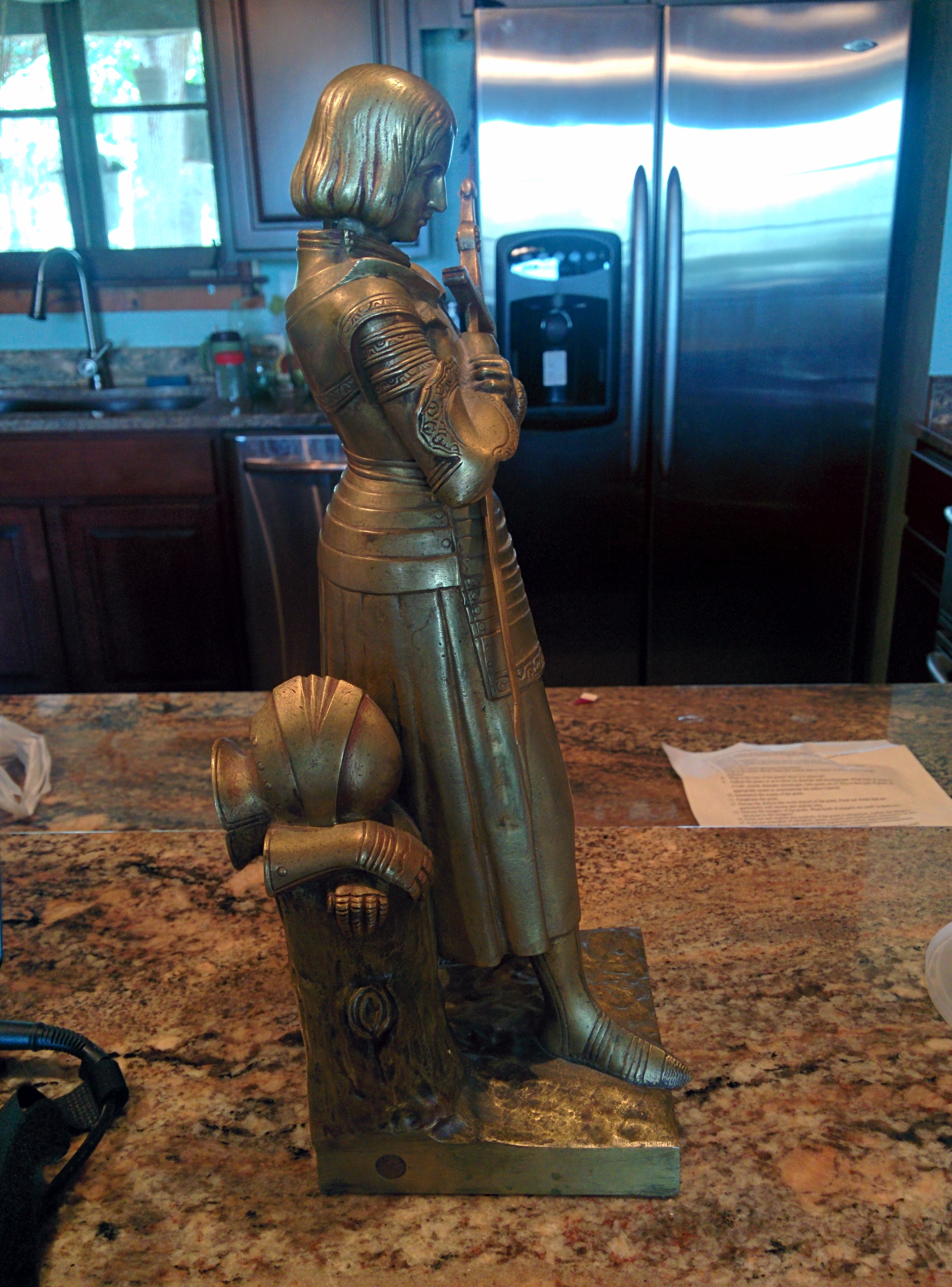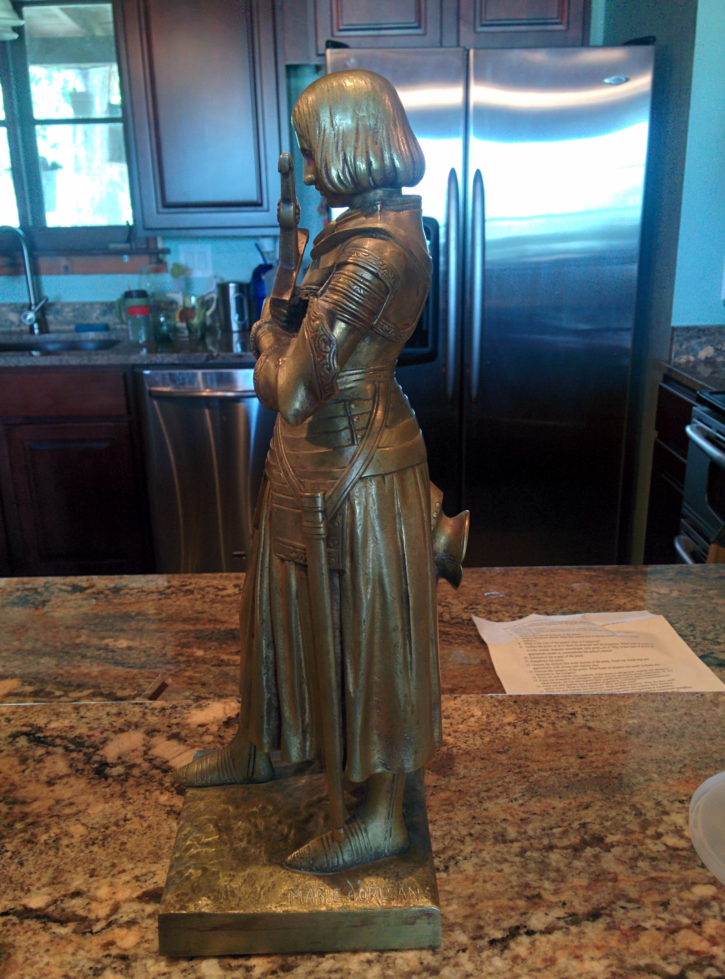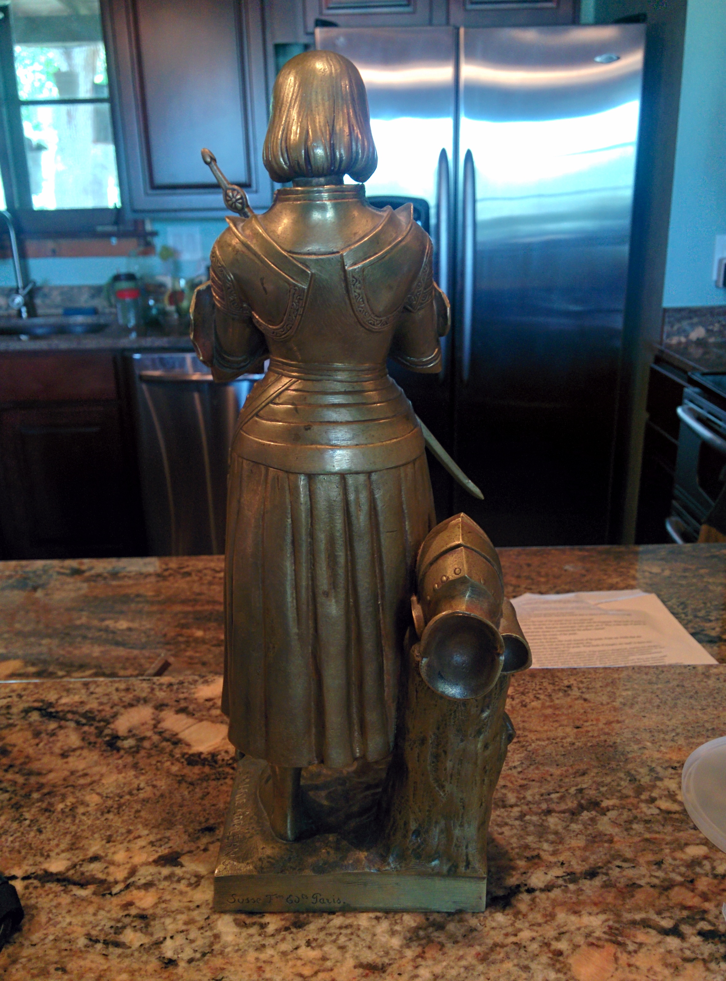 This is a bronze statue done by Susse Freres. This satue depicts the Maid of Orleans also known as Joan of Ark. From what I can tell she's in perfect condition and also has the removable sword, which she holds in her hands. It is inscibed with the Susse Freres foundry mark and Marie D'Orleans. Im sorry that this is all I know.