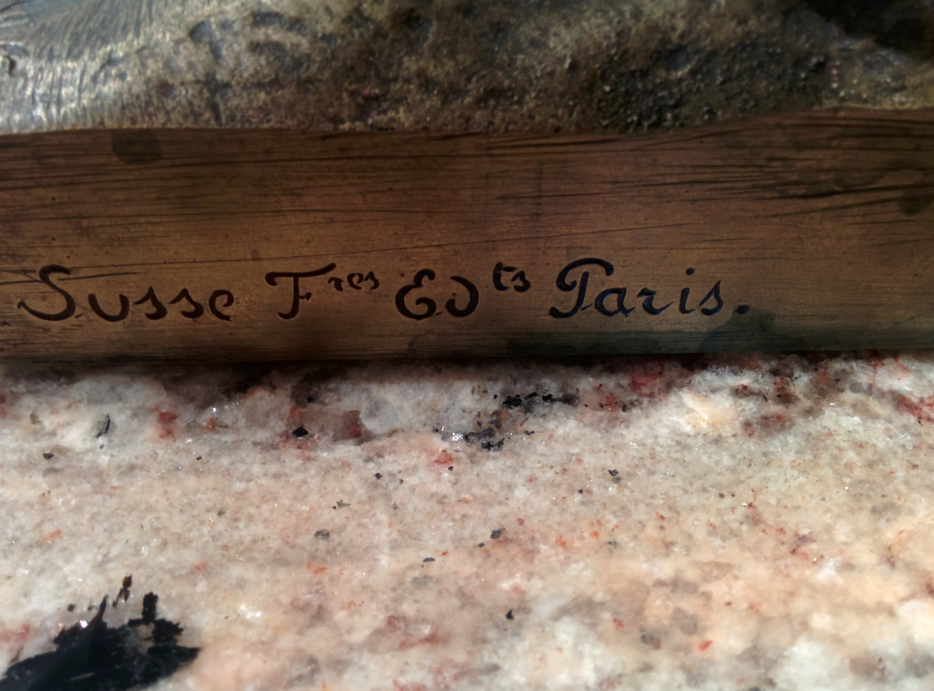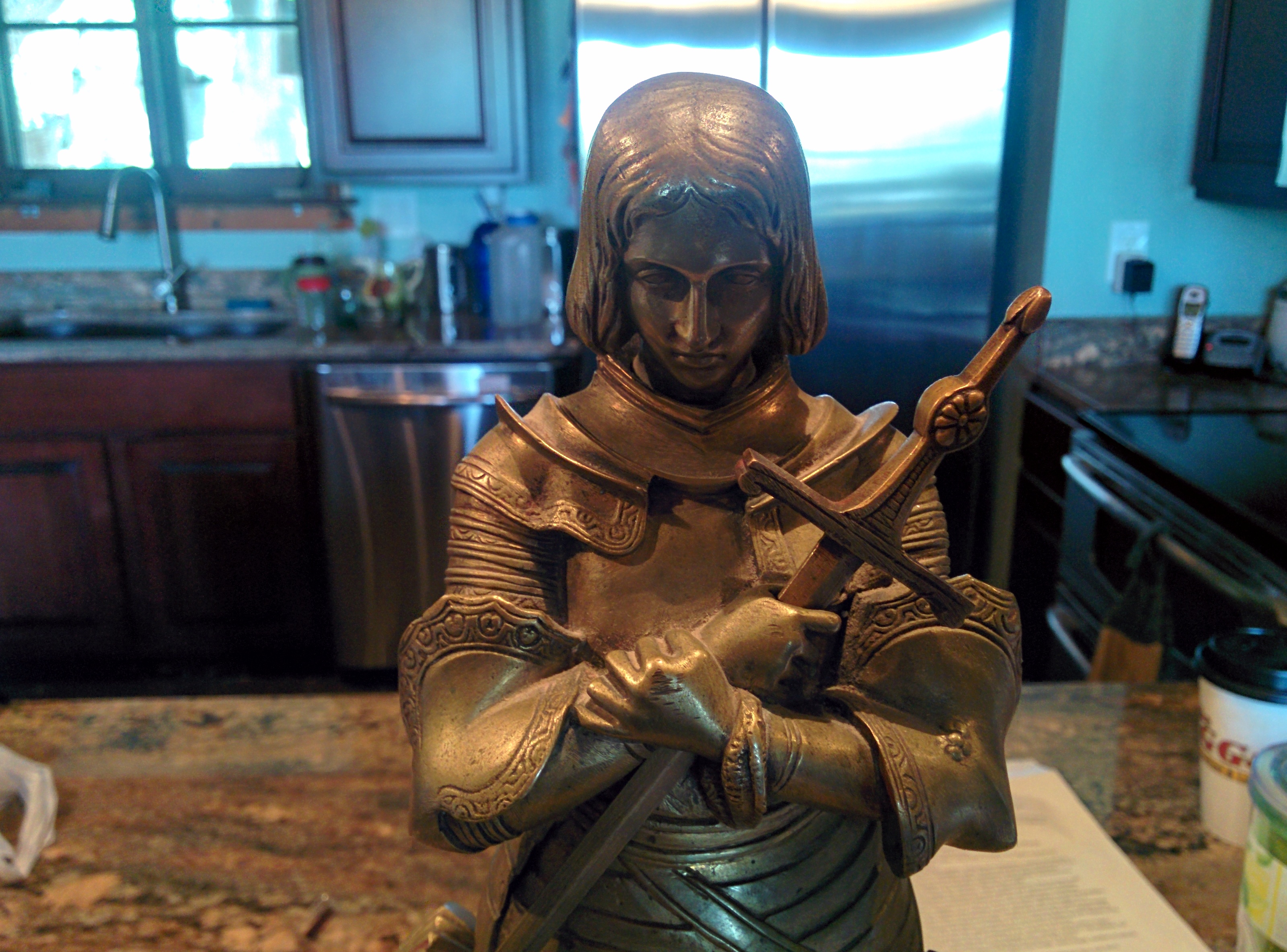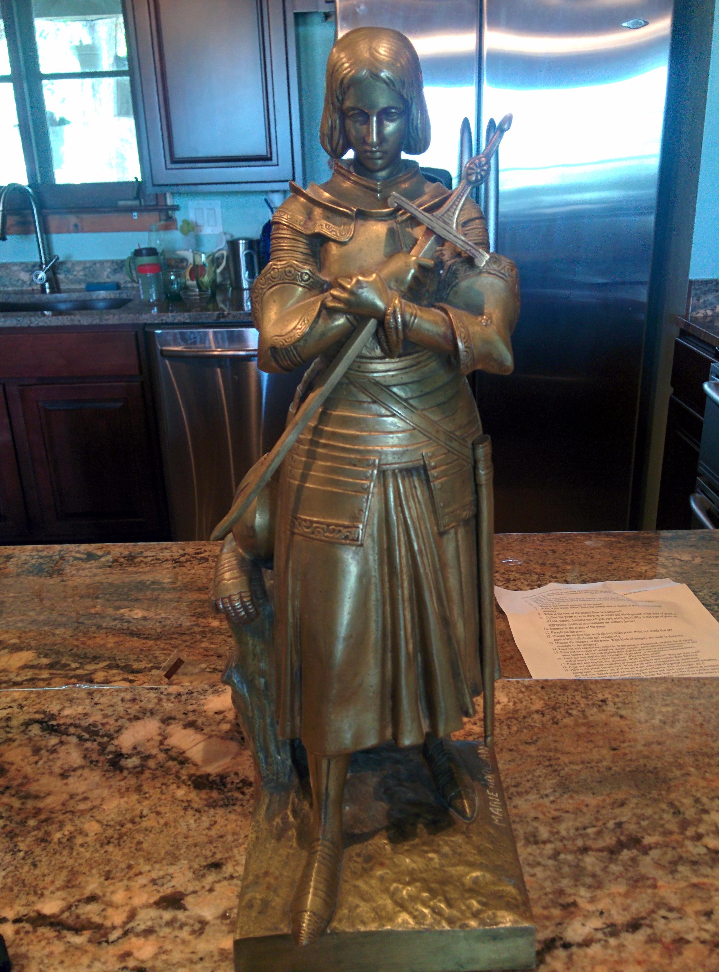 This is a bronze statue done by Susse Freres. This satue depicts the Maid of Orleans also known as Joan of Ark. From what I can tell she's in perfect condition and also has the removable sword, which she holds in her hands. It is inscibed with the Susse Freres foundry mark and Marie D'Orleans. Im sorry that this is all I know.
