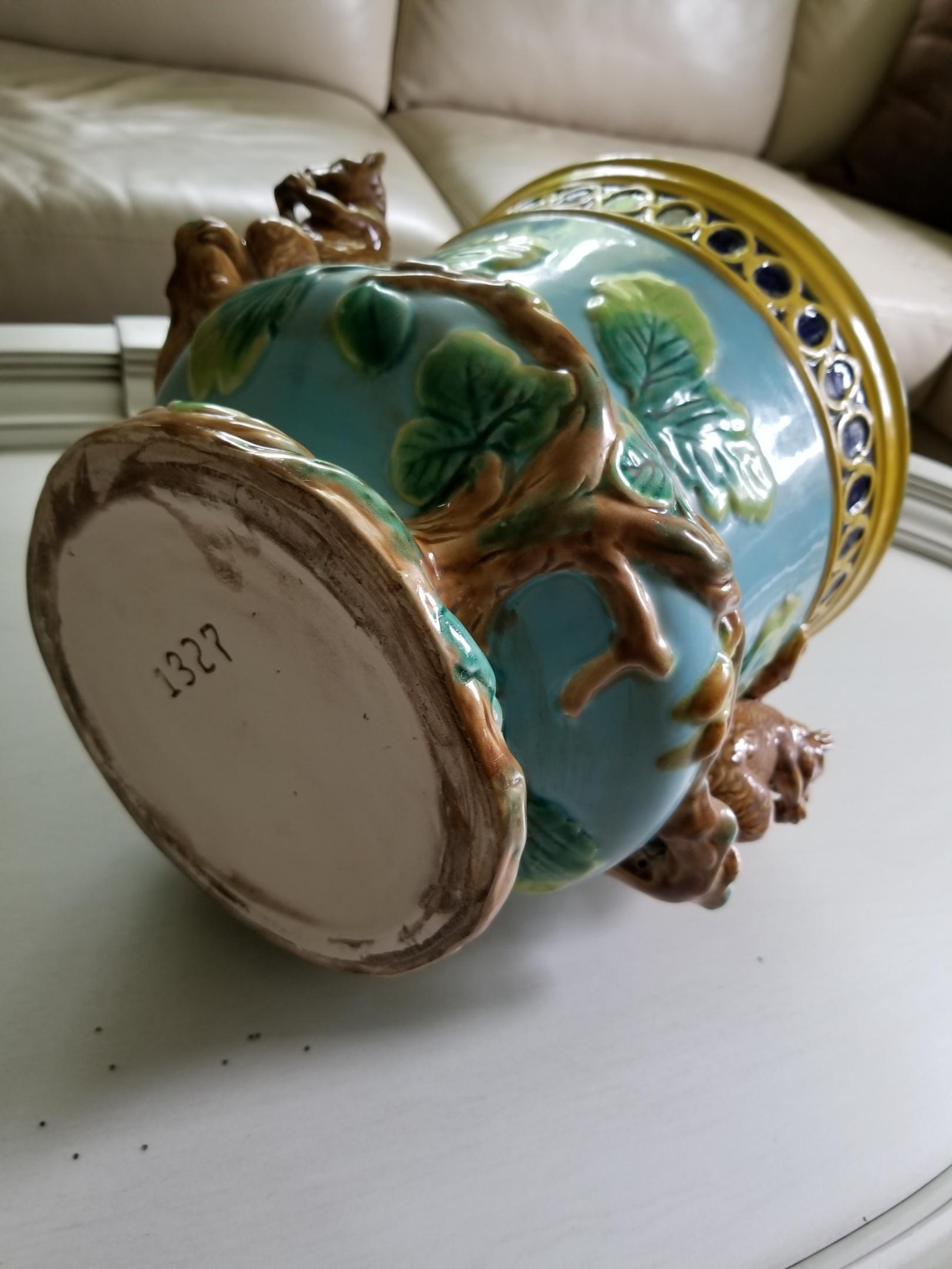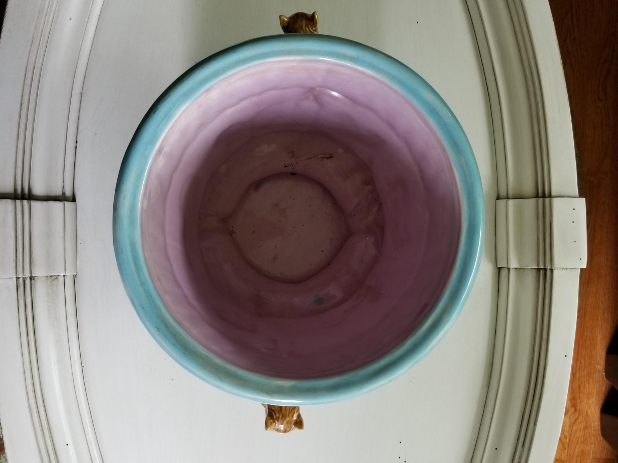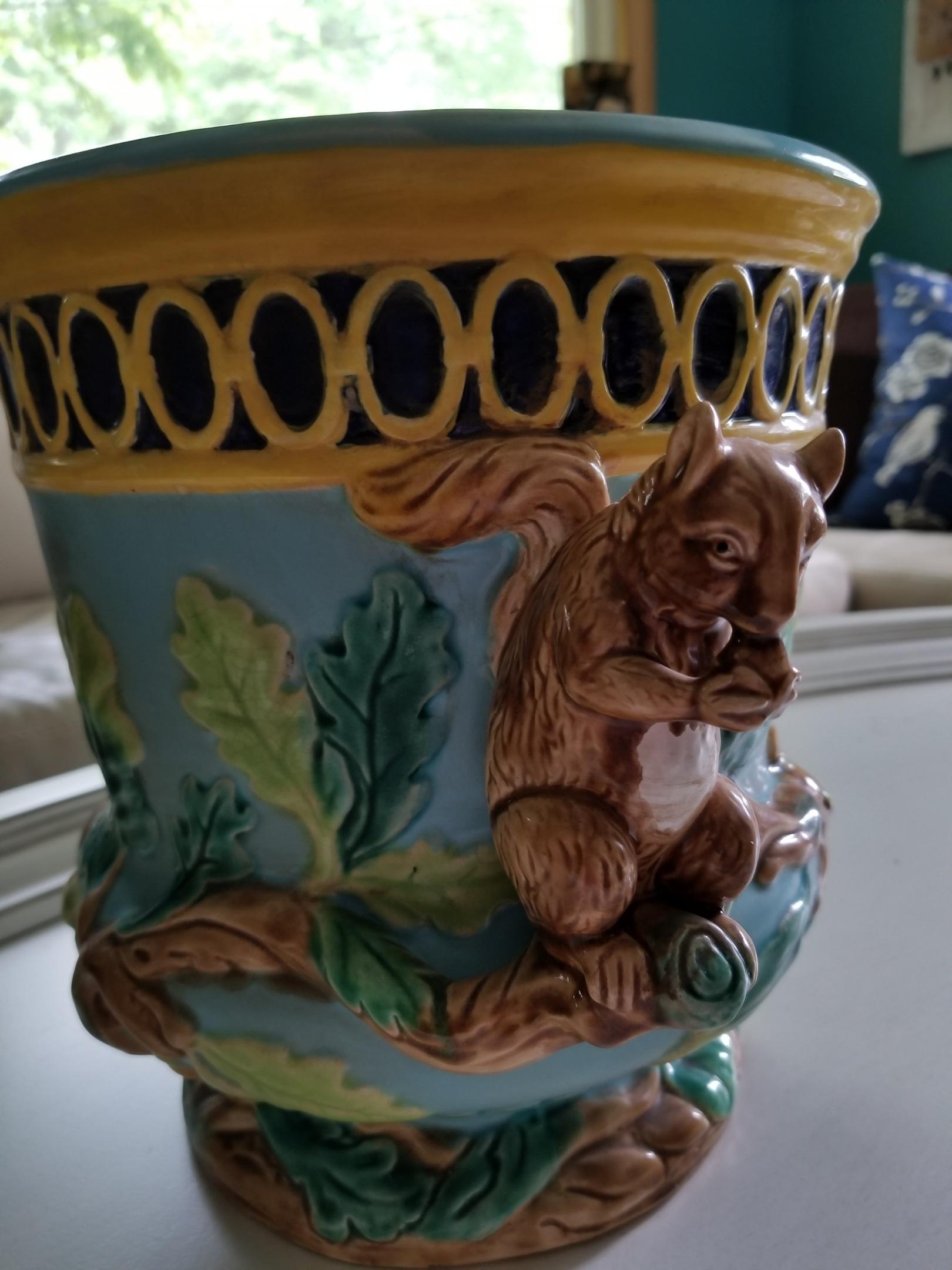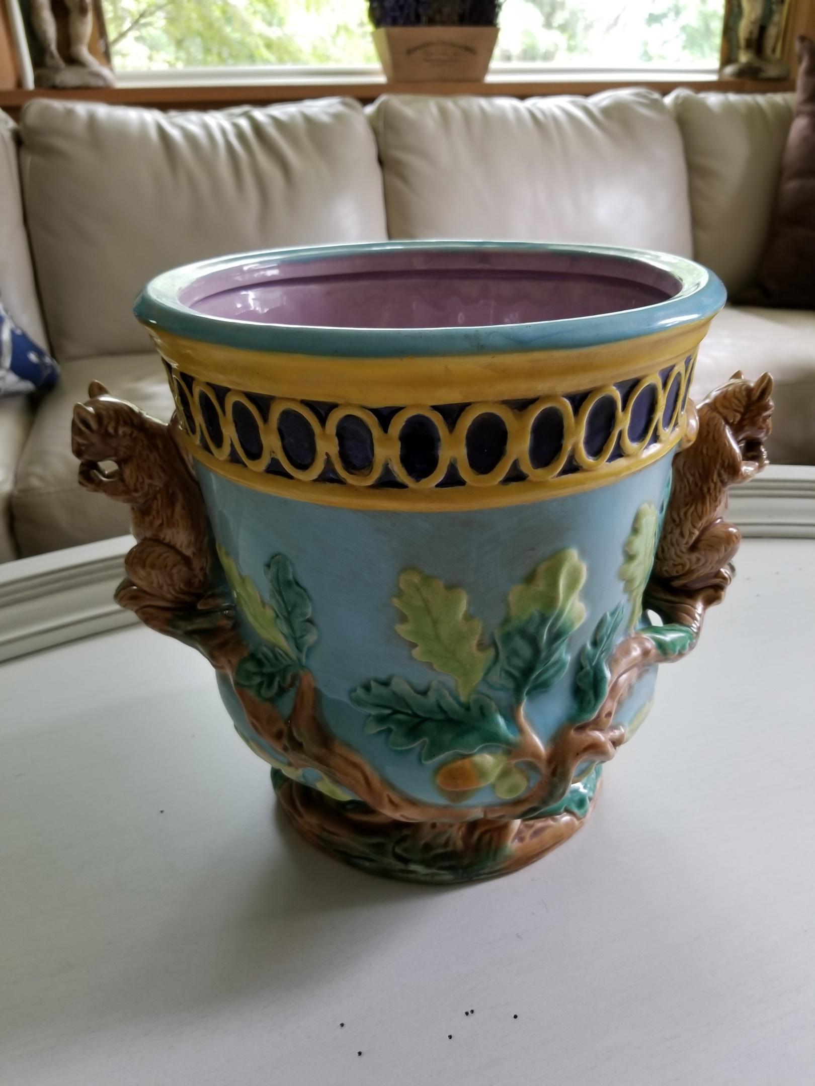 1800's cache pot planter. Colors include Lavender Interior and Yellow, Cobalt Blue, Light Blue with shades of green and of course the squirrels are brown.Pot weighs 9 lbs. and measures 10.75 inches tall, 13 inches wide from squirrel to squirrel and 9.5 inches wide from outer rim to outer rim.Excellent condition with no chips, cracks and little to no crazing. Marked 1627 on bottom. |