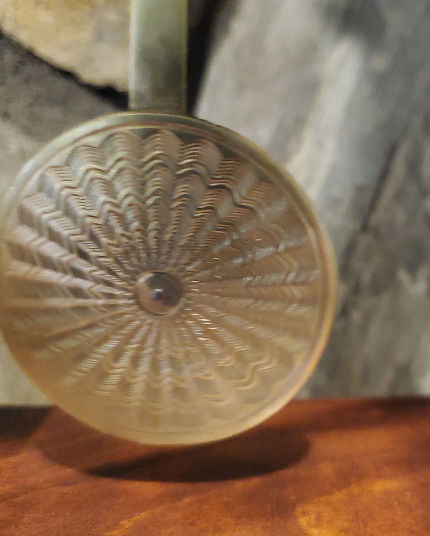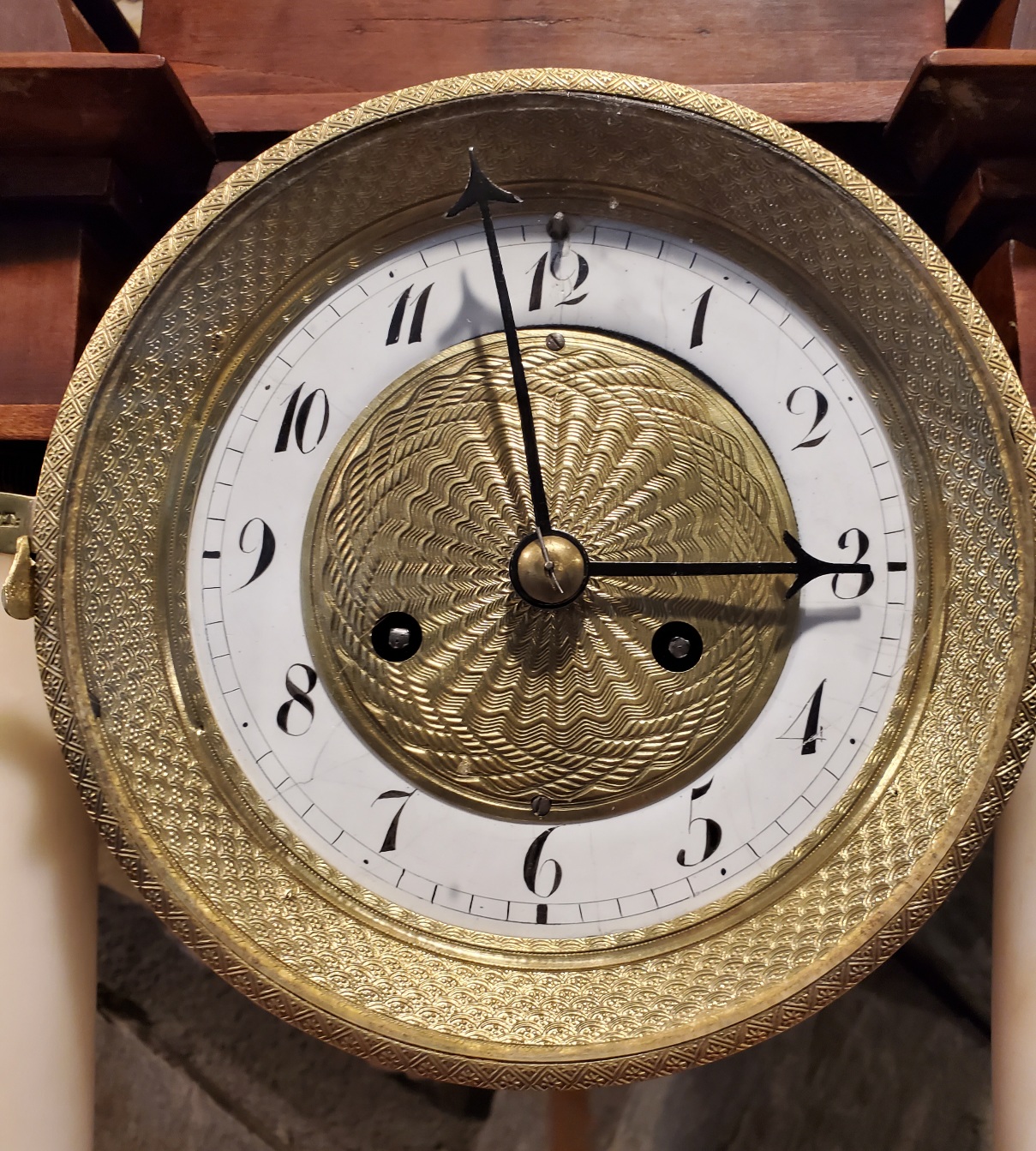 The repair man cleaned the metal face and pendulum. He had to replace the main spring in the mechanism.