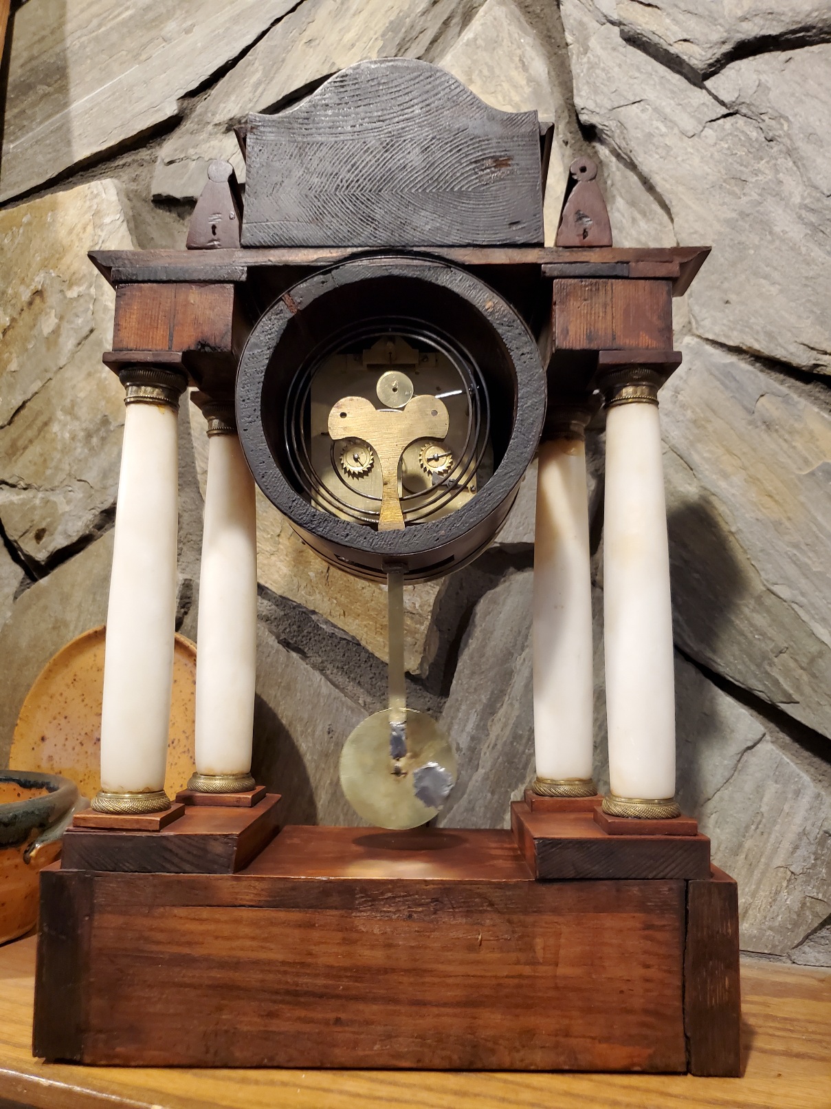 My Grandfather bought this clock at an Auction in May of 1953 in South Dakota. At the site of the Pactola Dam. The town of Pactola was flooded to create Pactola Lake. The auction was held before the town was flooded.