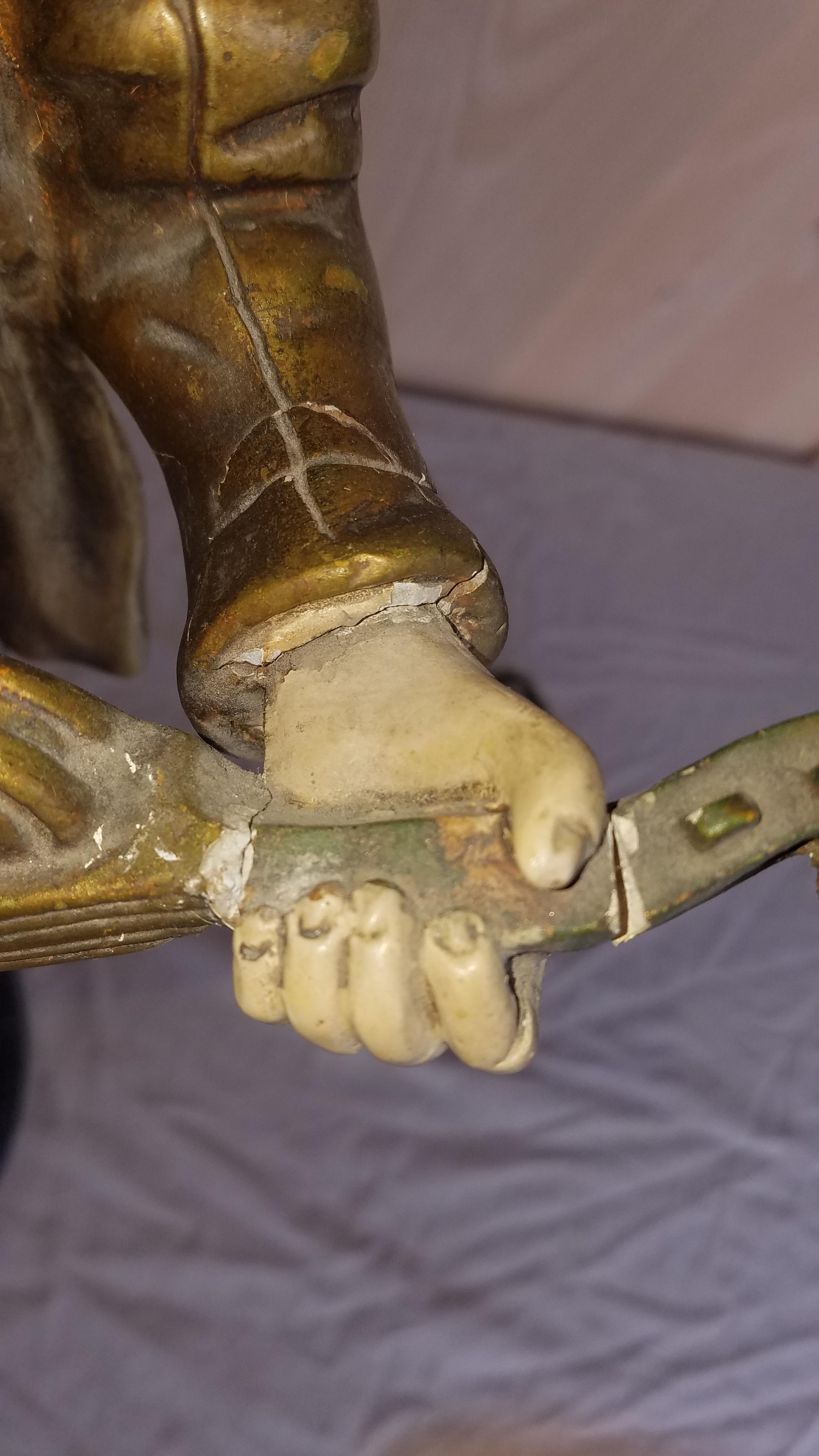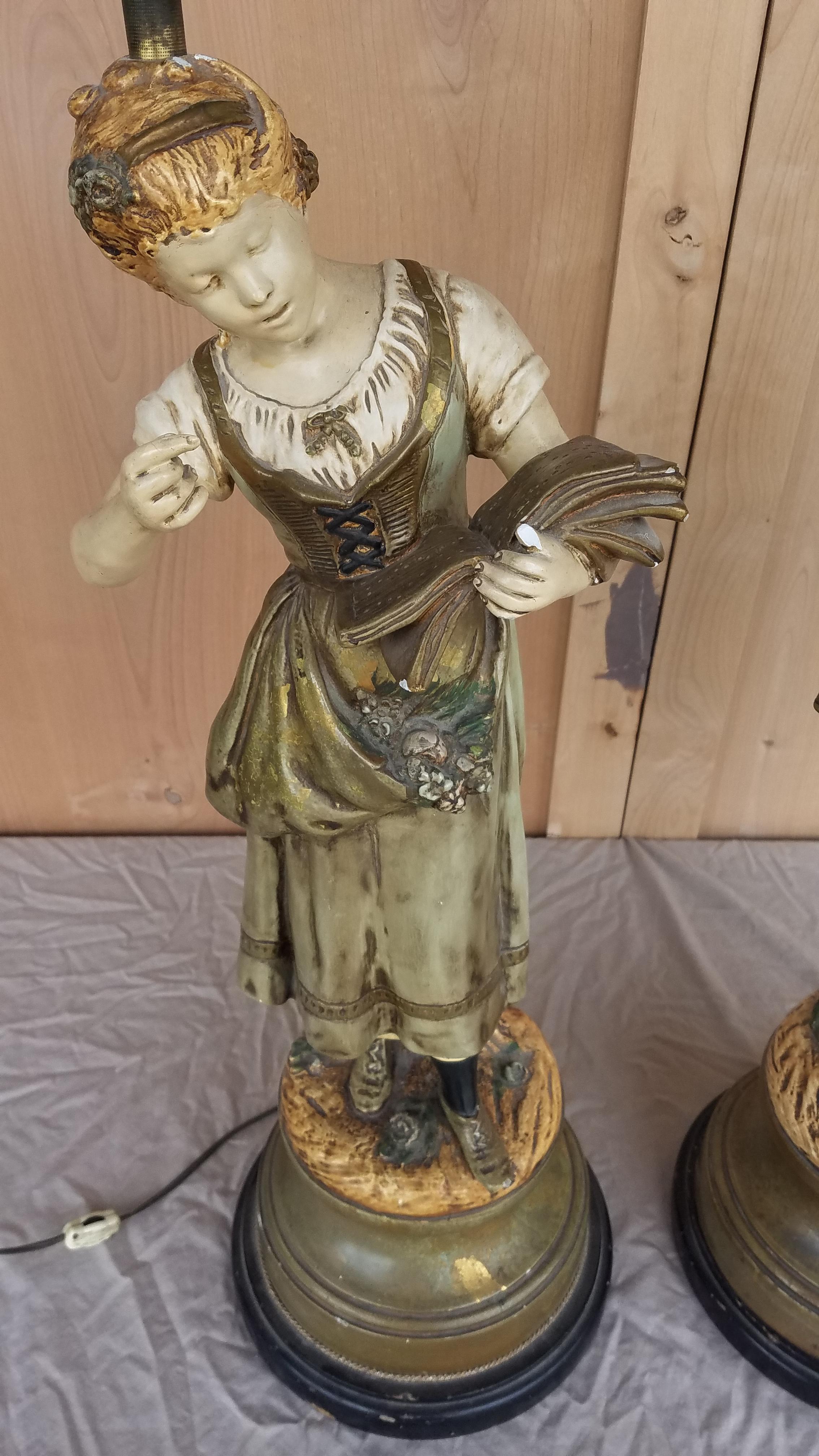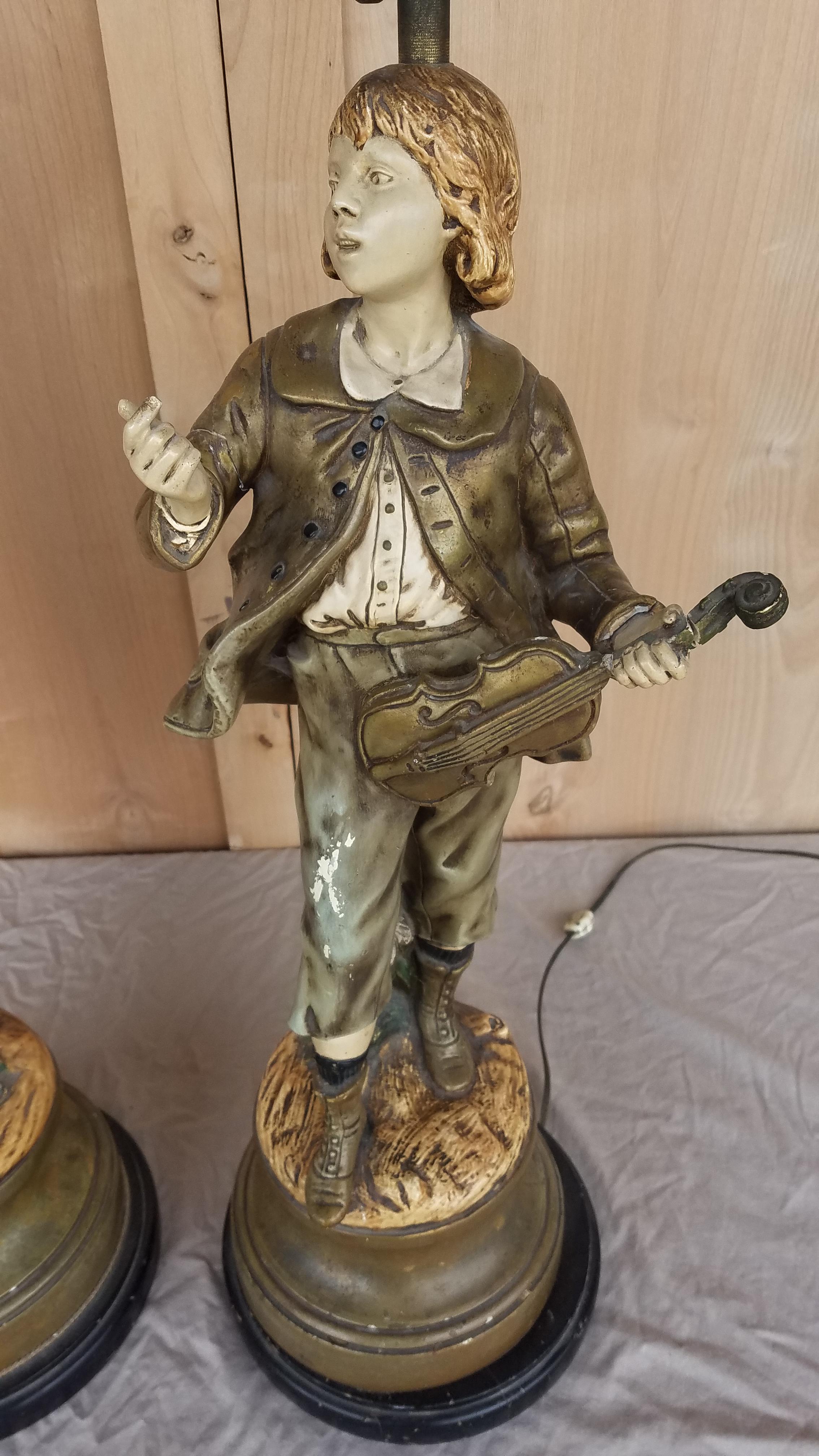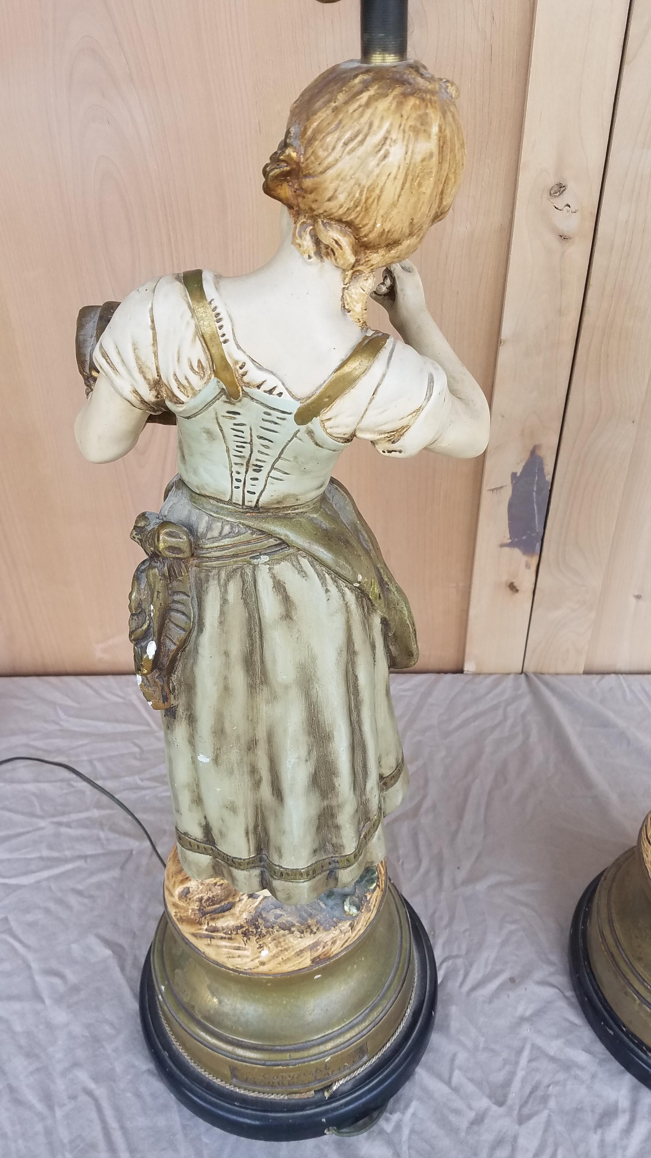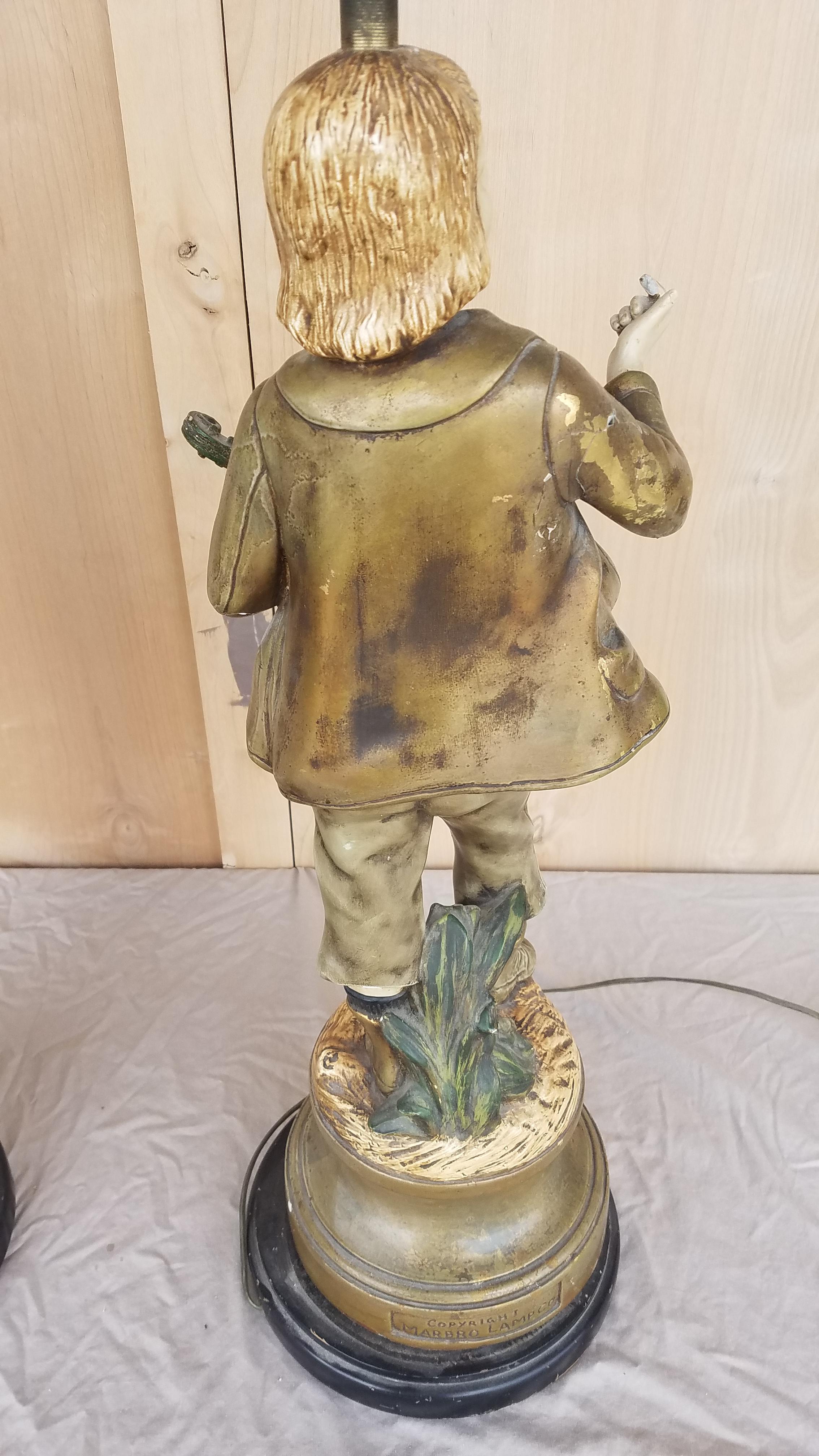 These are from the Marbro company. They do not have lamp shades. Basically there is just a little paint touch up on both lamps along with one of the boys arms where he is holding the book looks chipped and would need to be fixed. Other than that they are in great shape.