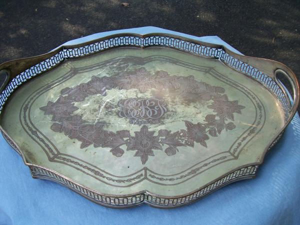 This tray looks like silverplate with some copper showing through, and I was told it was a meat tray. Engraved in the middle of the plate are three initials and Sept. 5, 1905. There is a small mark on the back of the tray that I cannot read. The tray has four feet.