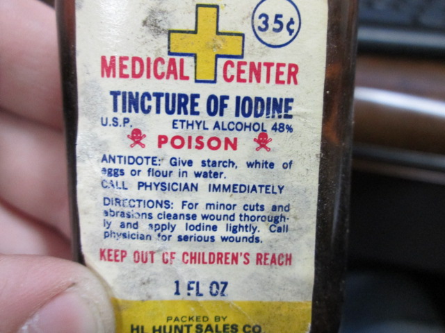 The first bottle is brown glass with a white lid, the label states: 35cents MEDICAL CENTER TINCTURE OF IODINE U.S.P. ETHYL ALCOHOL 48% * POISON * ANTIDOTE: Give starch, white of eggs or flour in water. CALL PHYSICIAN IMMEDIATELY DIRECTIONS: For minor cuts and abrasions cleanse wound thoroughly and apply iodine lightly. Call physician for serious wounds. KEEP OUT OF CHILDREN'S REACH 1FL OZ Packed by HL HUNT SALES CO DIV. OF HUNT OIL CO., DALLAS, TEX. 75202 U.S.A in red stamped numbers at the bottom are: 731016A on the bottom of the bottle it says 0 B with a circle around it 20 and there is no liquid left inside.