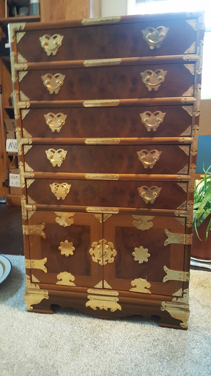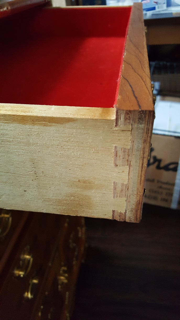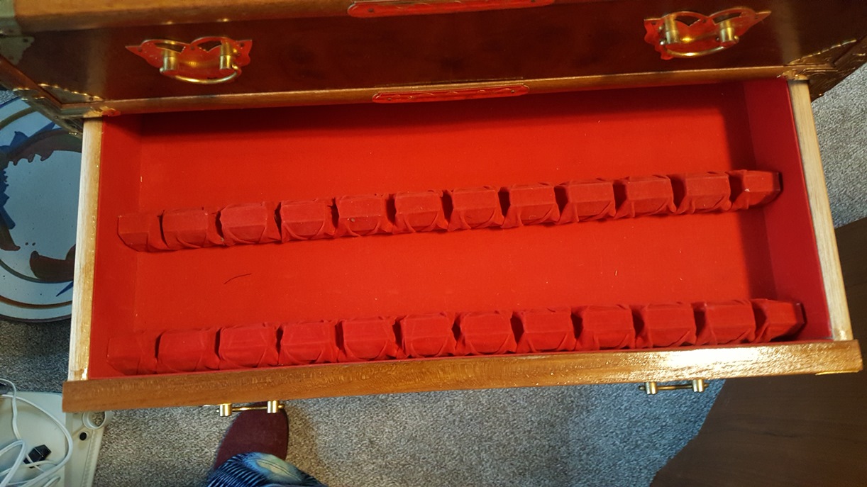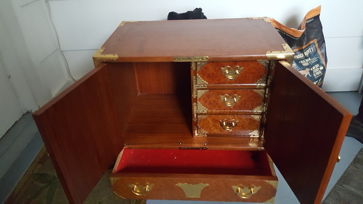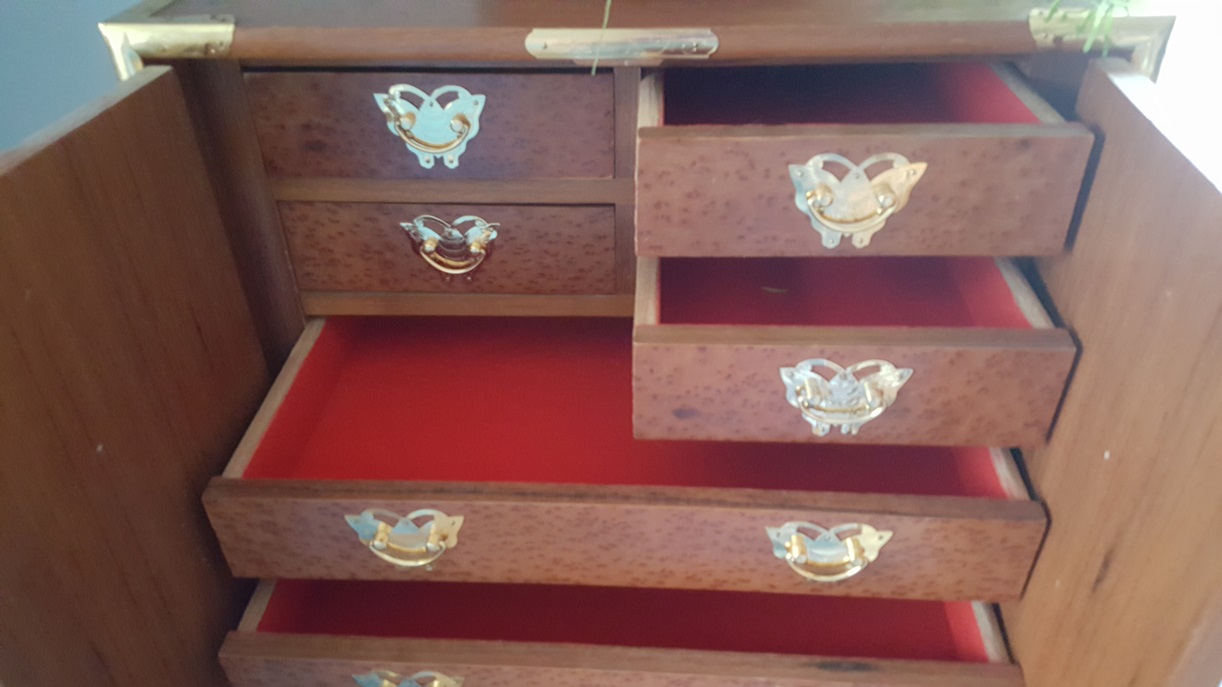 We picked these up at an auction. The auctioneer called them men's traveling something. Excellent condition. Made In Taiwan sticker on bottom. Joints are dovetailed. Bottoms have white round plastic glides. All drawers are lined with red fabric. Different kinds of wood on each piece. Dimensions: Tall: 51"H x 22"W x 15.5"D Mid-Size: 34"H x 20"W x 14.5"D Short x 2: 22.5"H x 22"W x 14"D Looking for any information: Who made them? What were they used for? What were they made of? When were they made? Thank you.