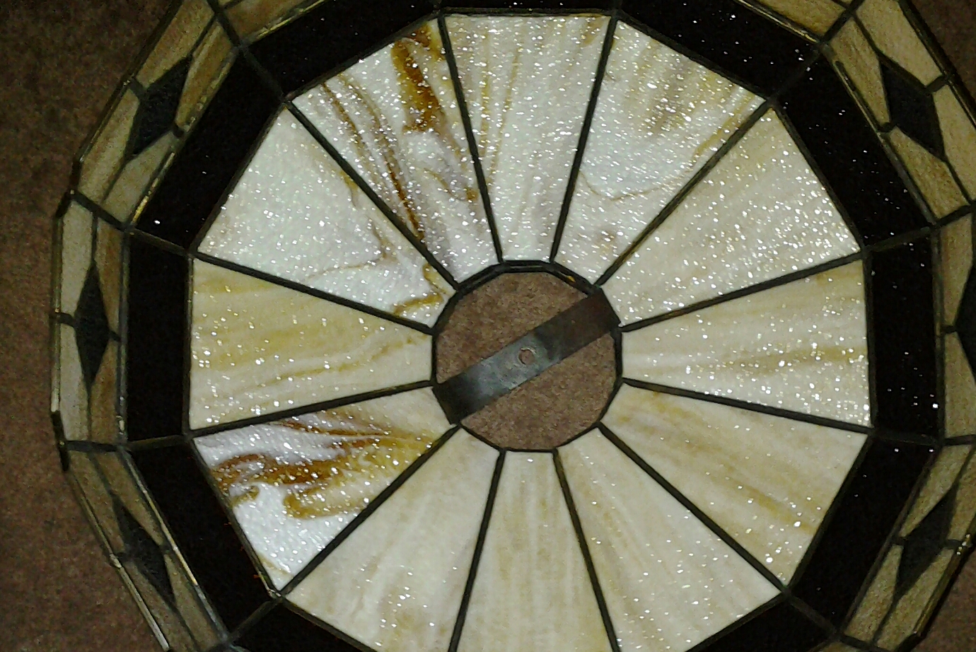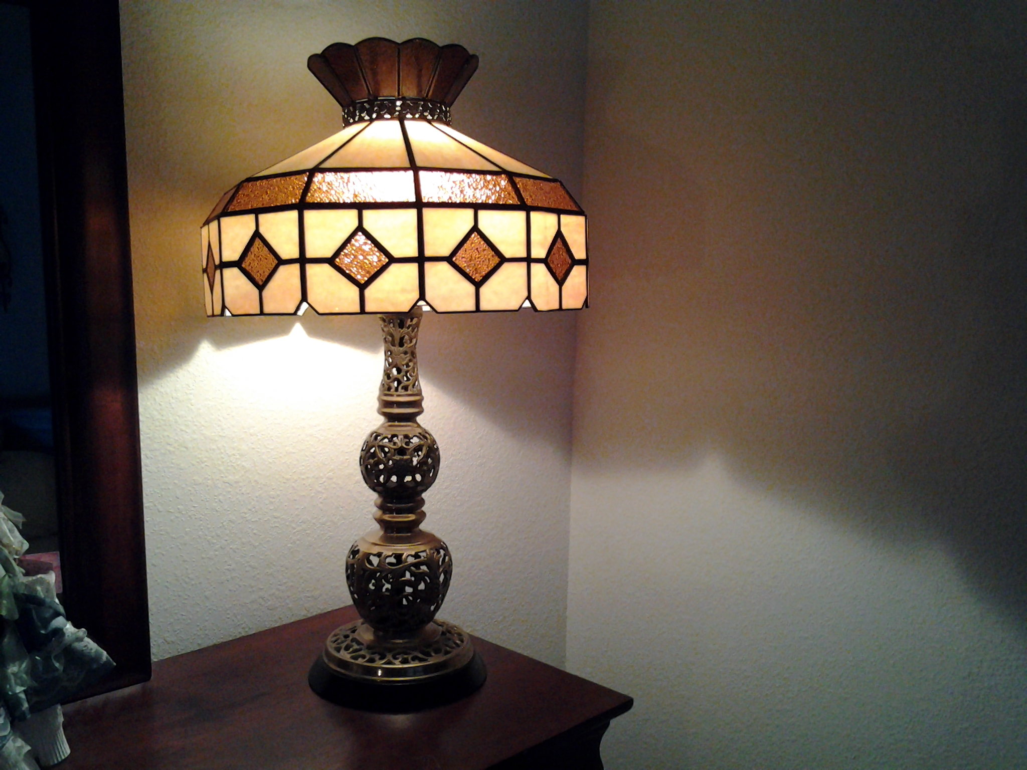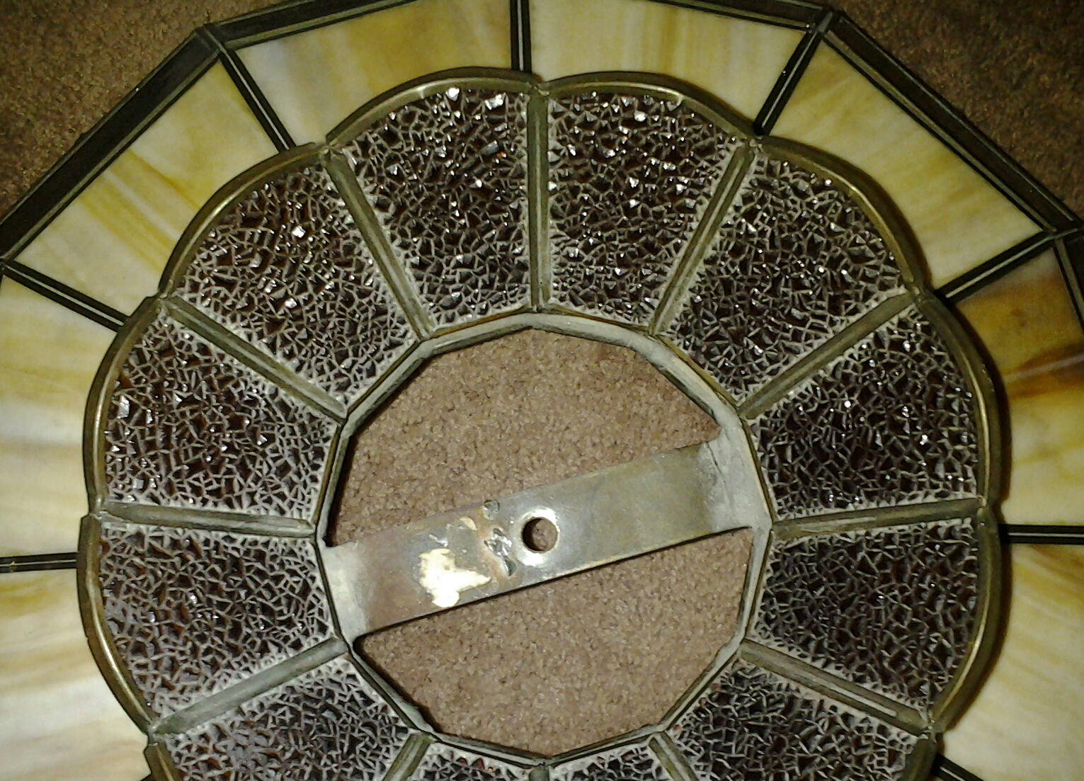 This lamp is very heavy. Each piece shade and base are also very heavy indivisually. Similar shades on line call this butterscotch slag and amber glass. The metal base has carvings of flowers and decorative lines that are etched right on the surface of the metal. Some of the carvings seem to be fading away and Im not sure why. The edges of the open spaces in the base are rough, sharp, and jagged which makes me think it was manually created that way with hand tools not a machine. I dont believe the shade and base were made to go together. I always find similar shades on line but they are always hanging lamp shades and they never exactly match the pattern of my shade. I have never seen another base like this one and I have searched for years, even the antique dealer I purchased it from has no idea.
