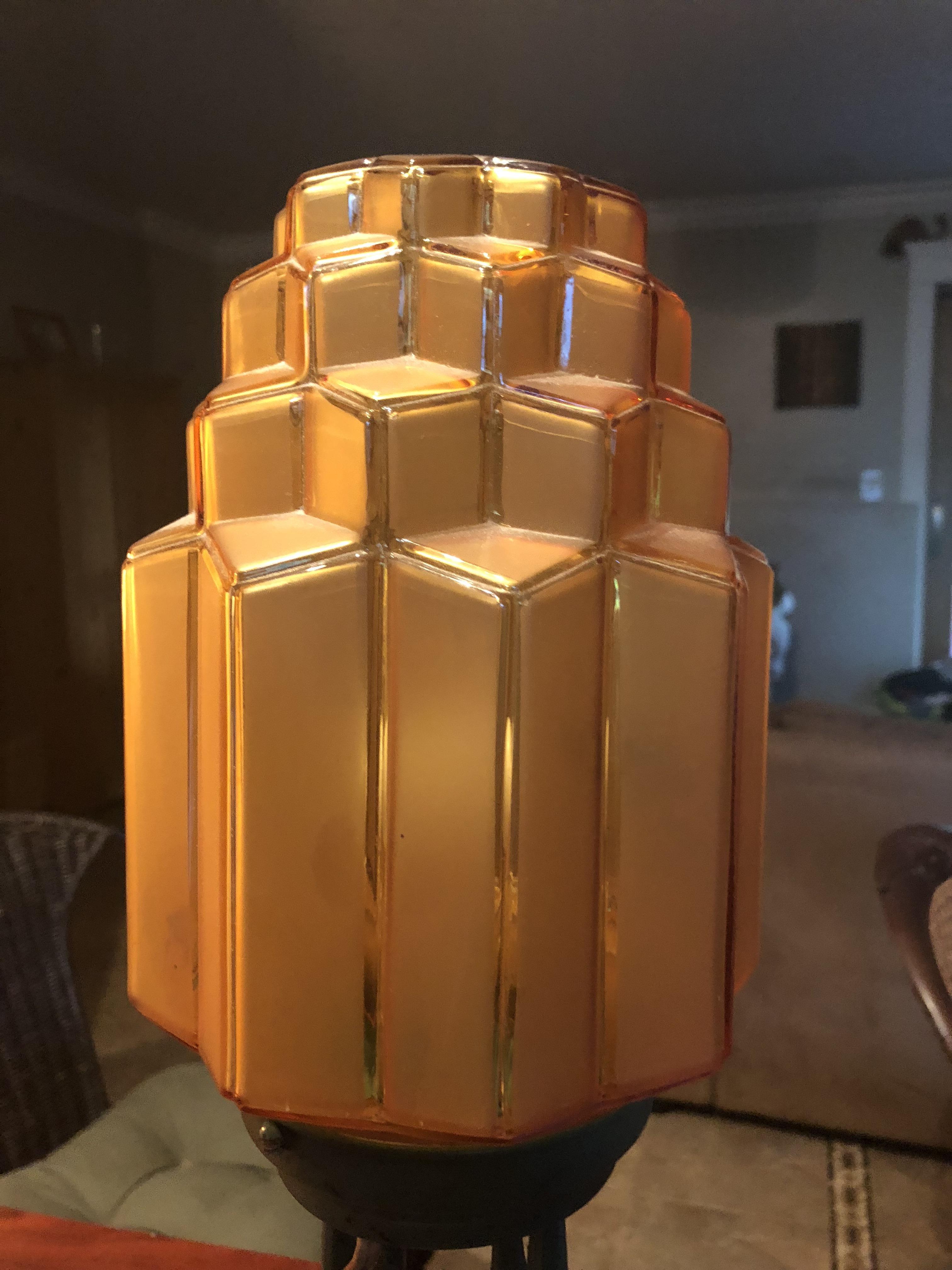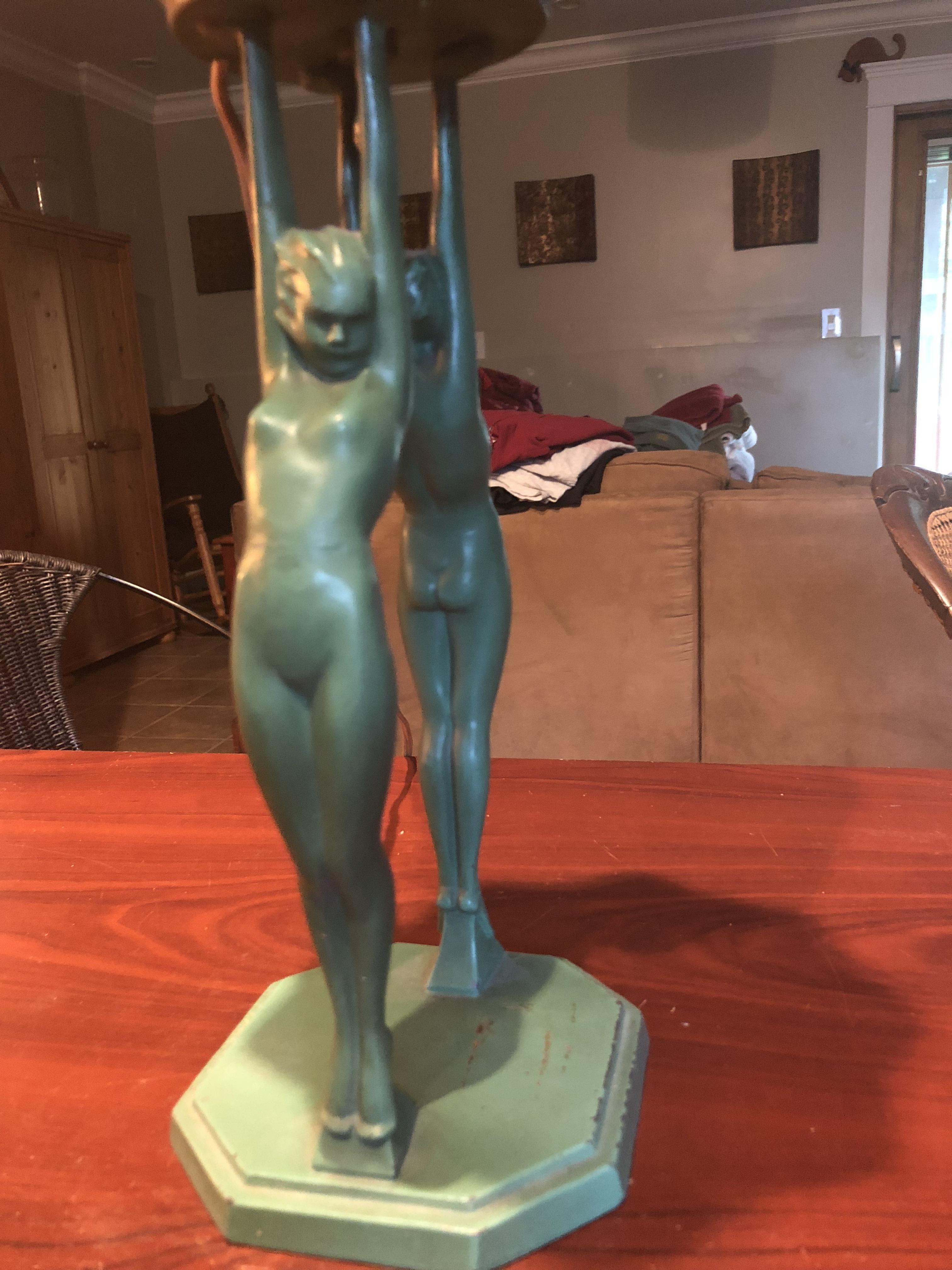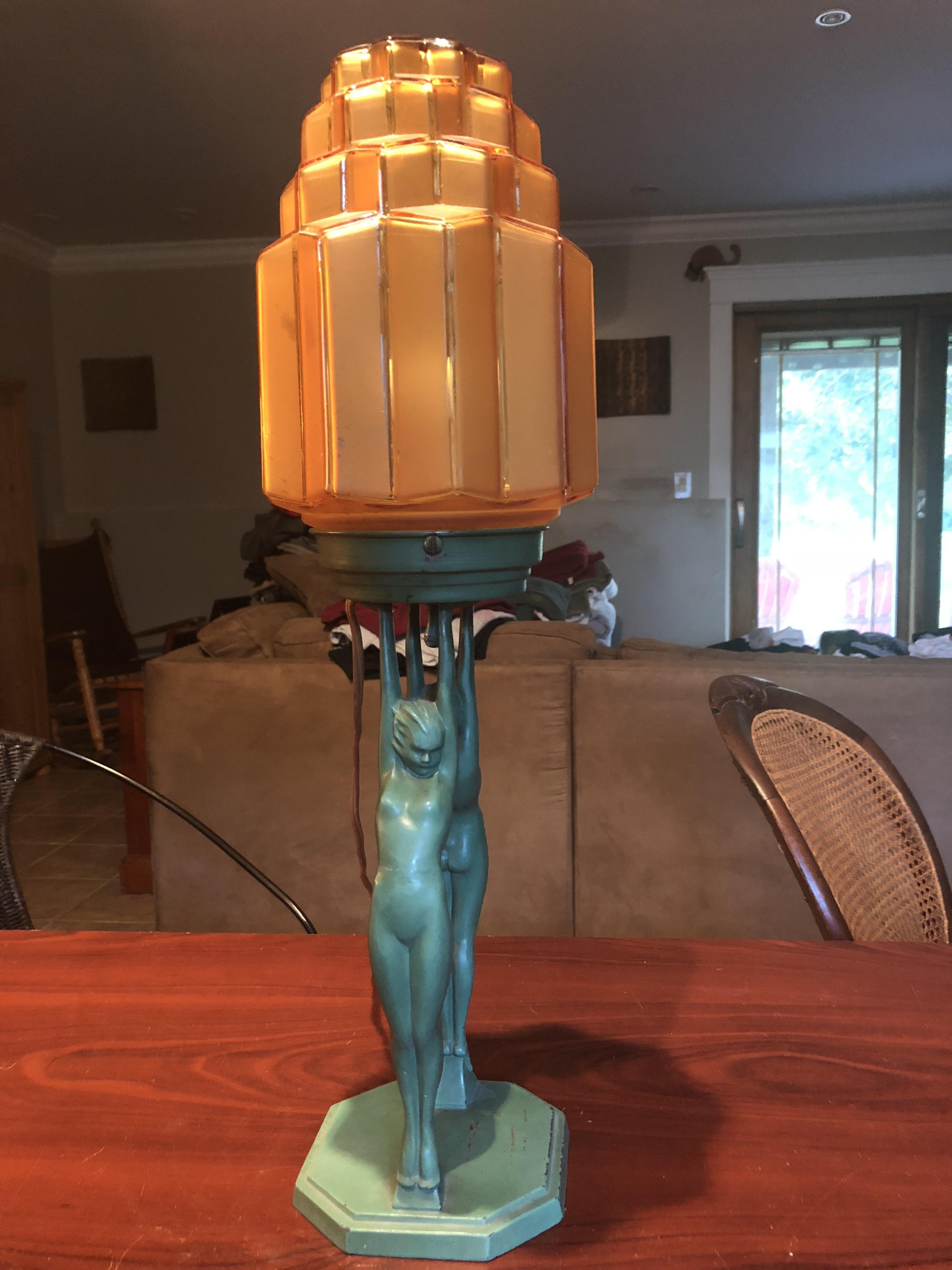 Part of an estate. This is a metal lamp painted green with female figures holding up the light. The lamp cover is amber colored glass. The lamp is in working condition.