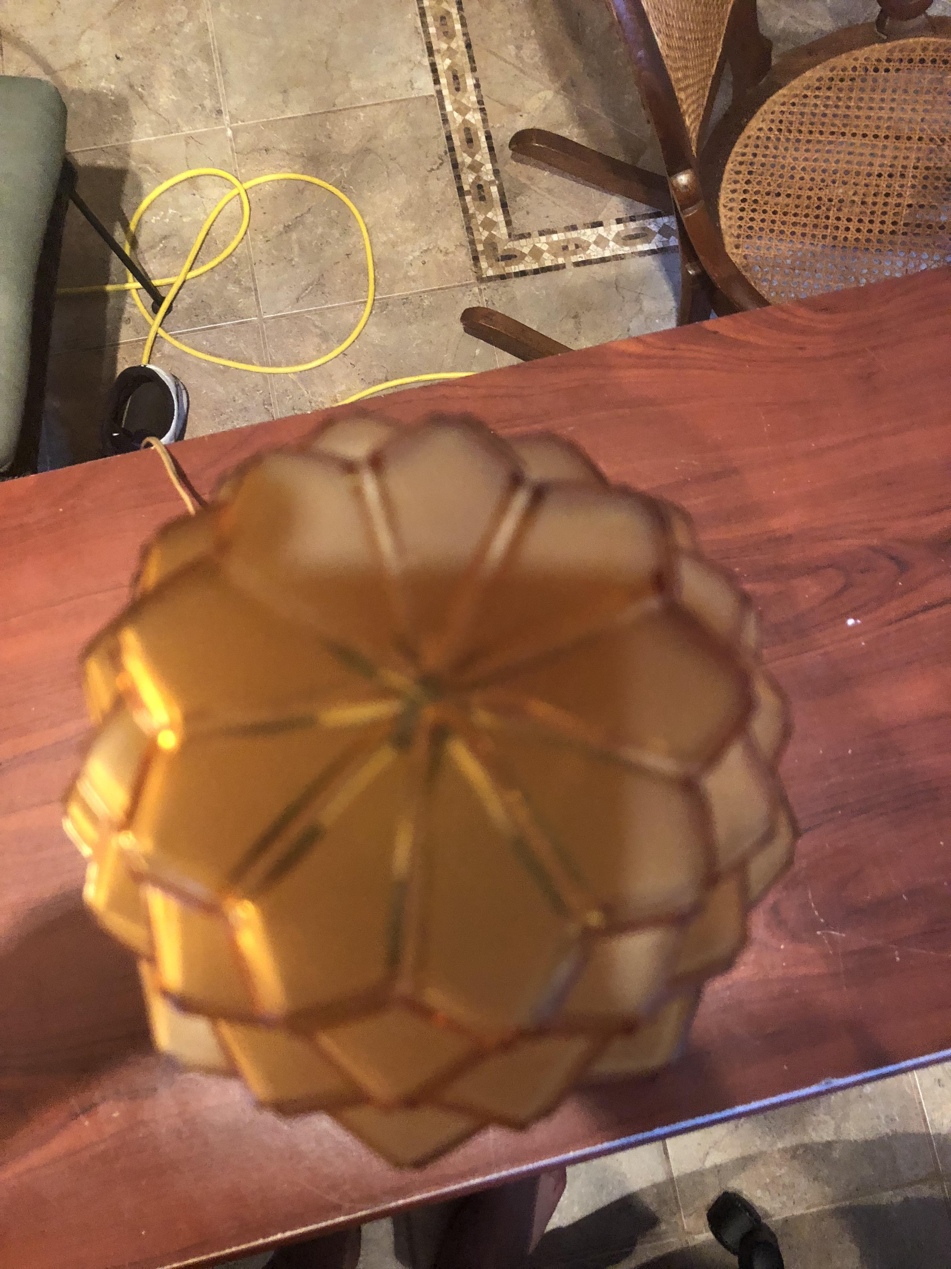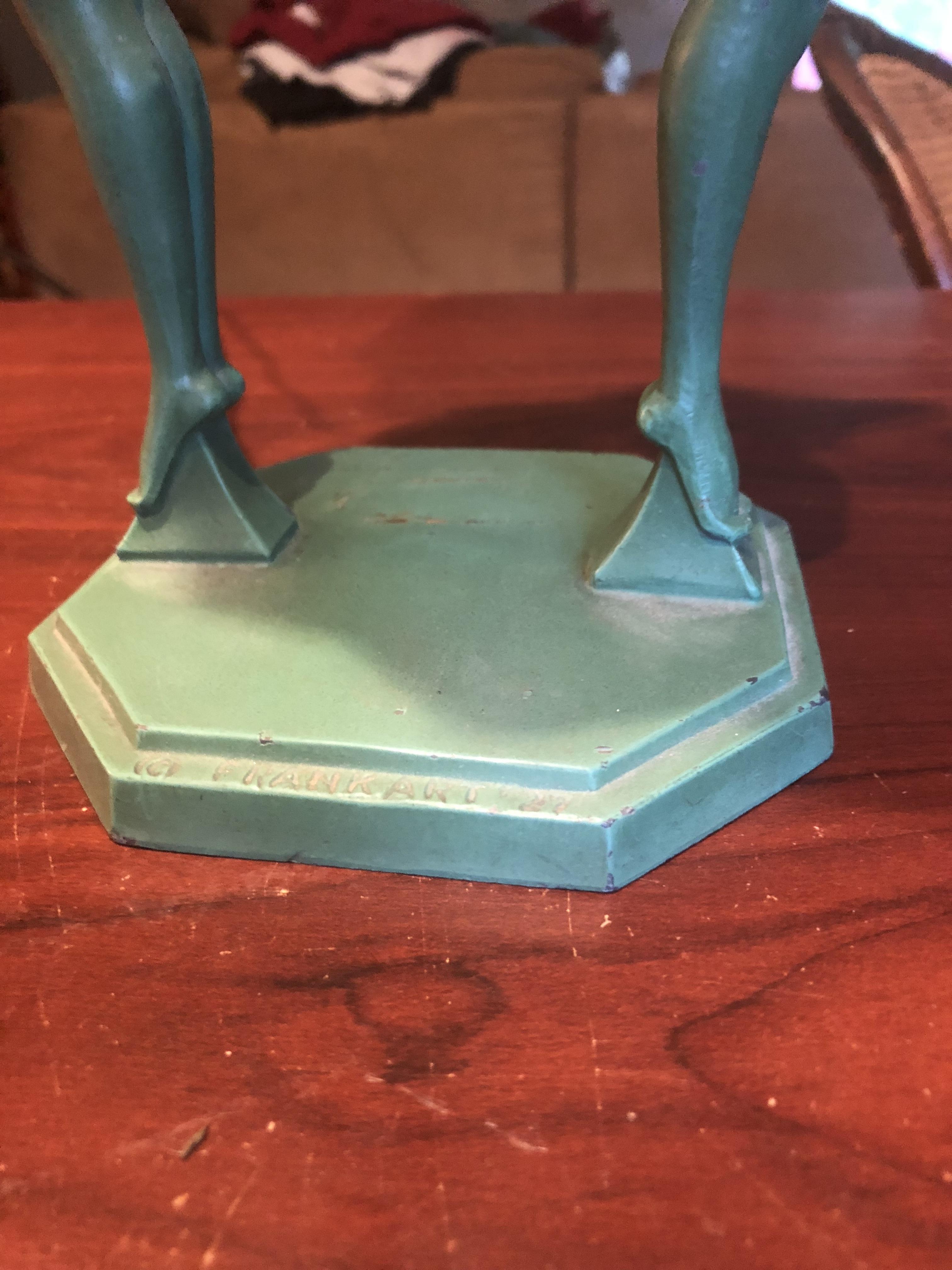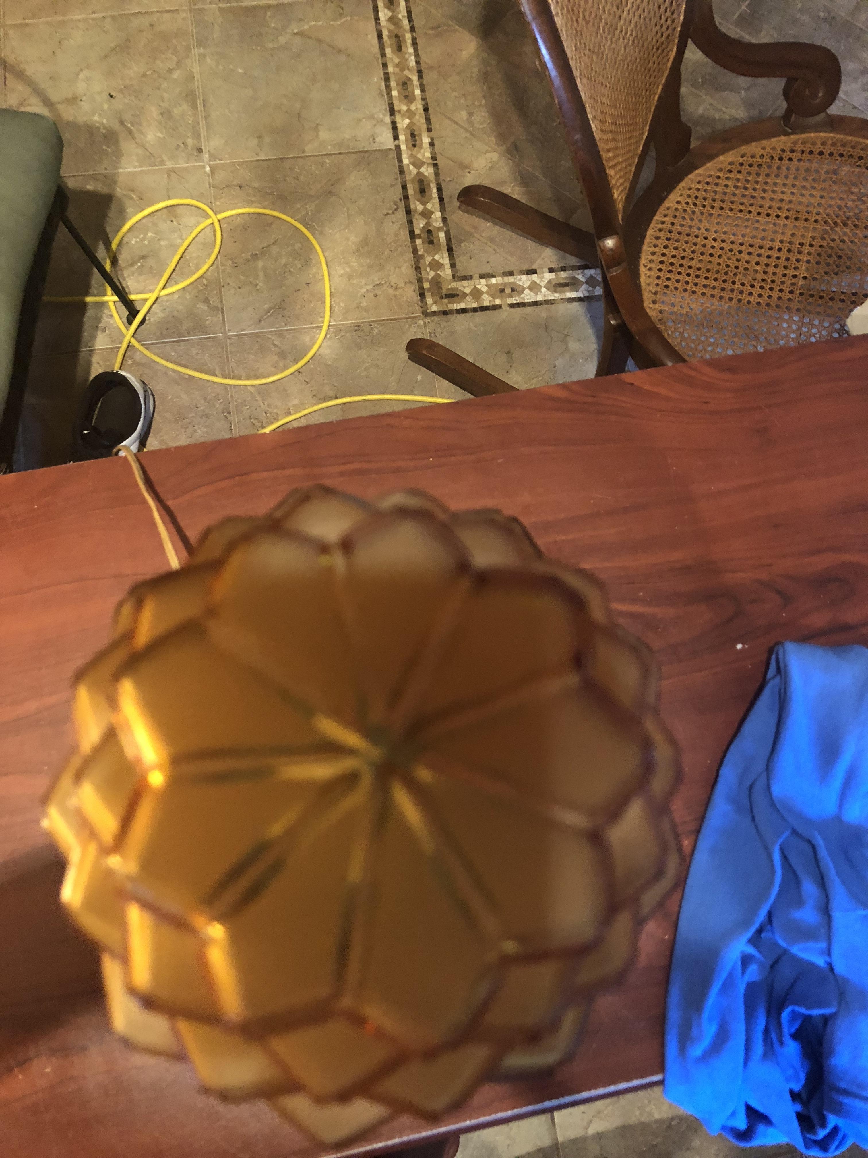 Part of an estate. This is a metal lamp painted green with female figures holding up the light. The lamp cover is amber colored glass. The lamp is in working condition.