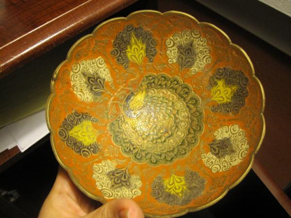 Heavy metal dish; multi-colored enamel (I assume) paint. Peacock designs are etched/textured inside and out. Could possibly be of Asian nature.