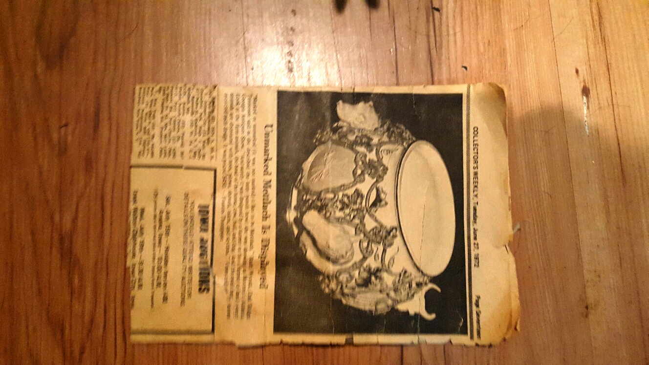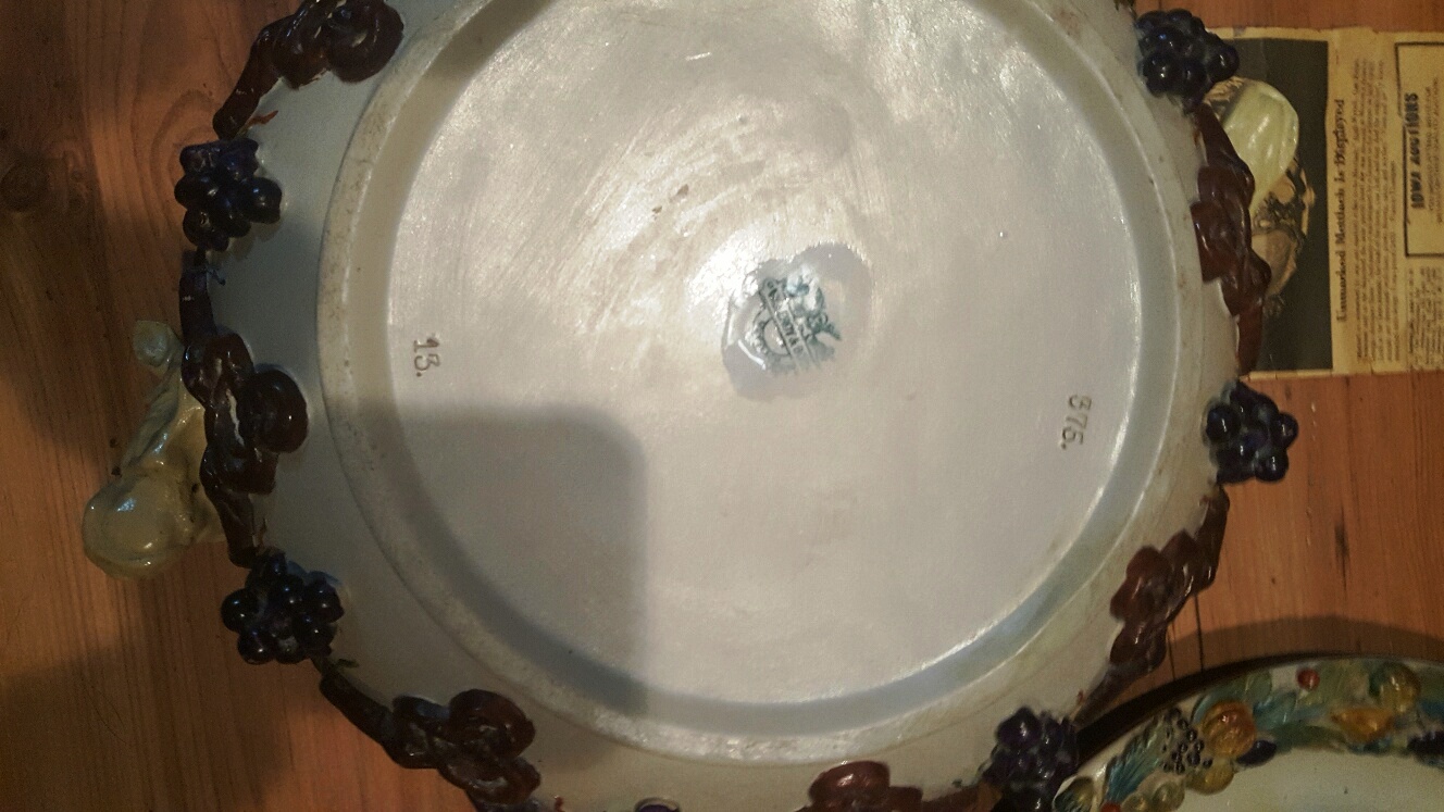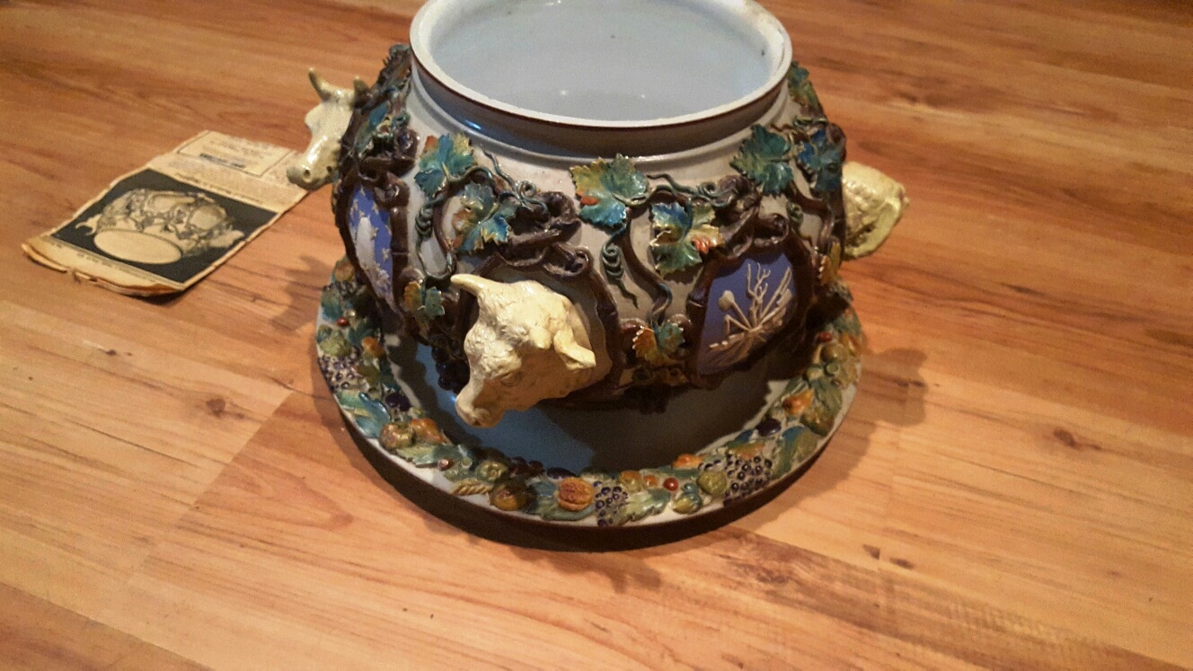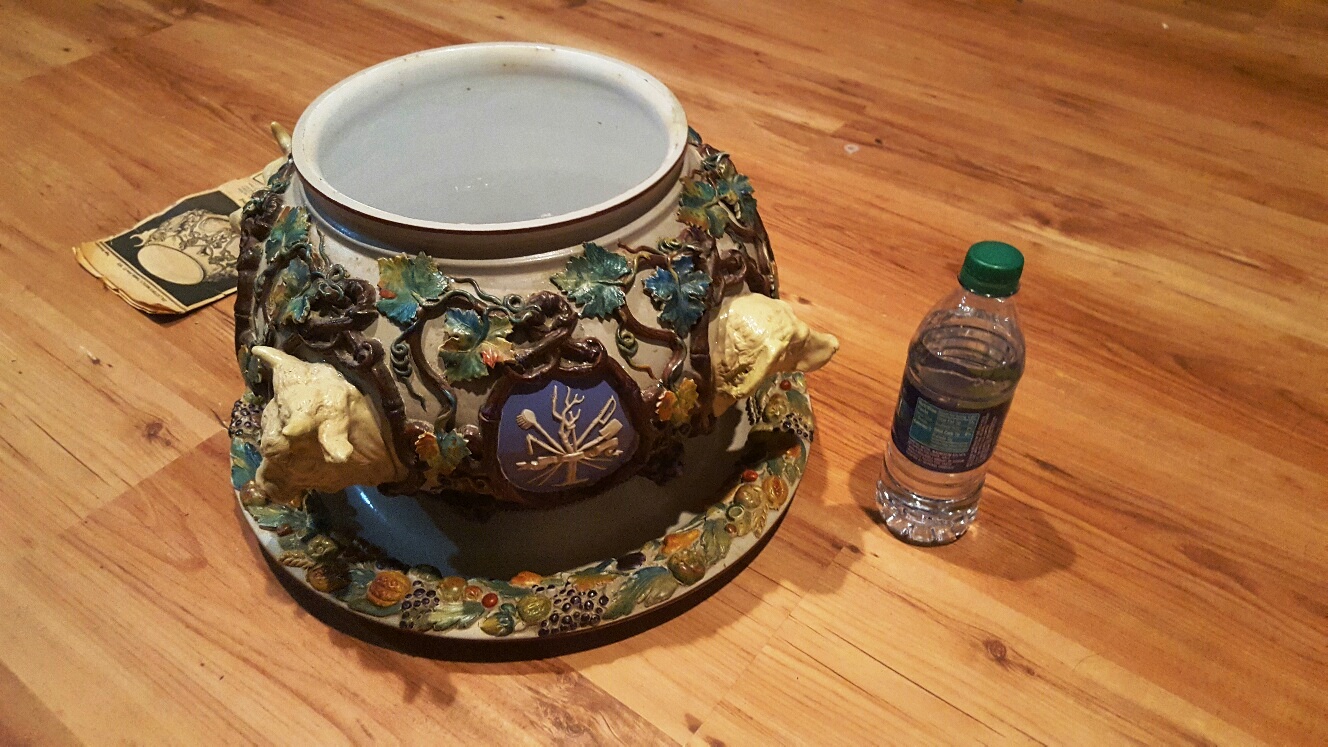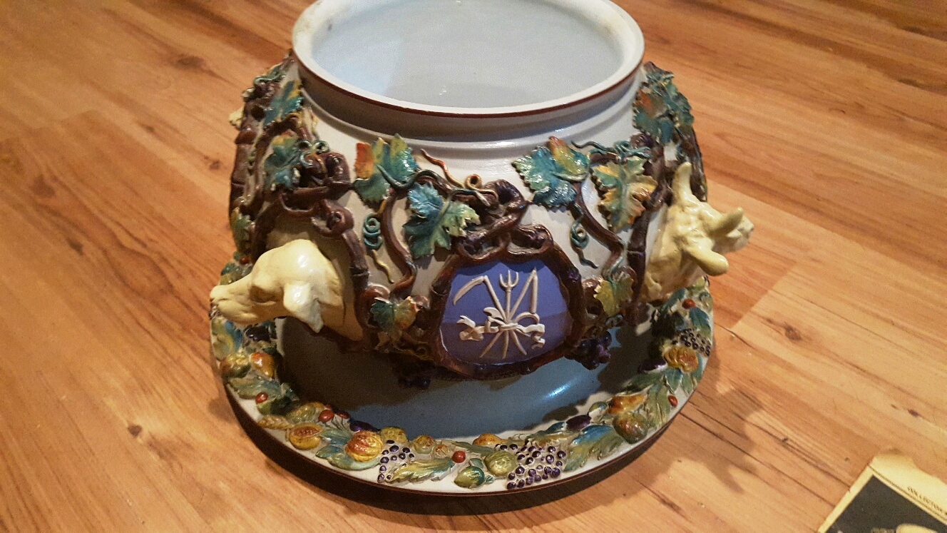 Large Mattlach Punch Bowl with animal heads, Cows and dogs.  Large base plate inwhich bowl sits, Minor chips,Good Condition.  I have a news paper clipping from 1979 with photo talking about a similar bowl.