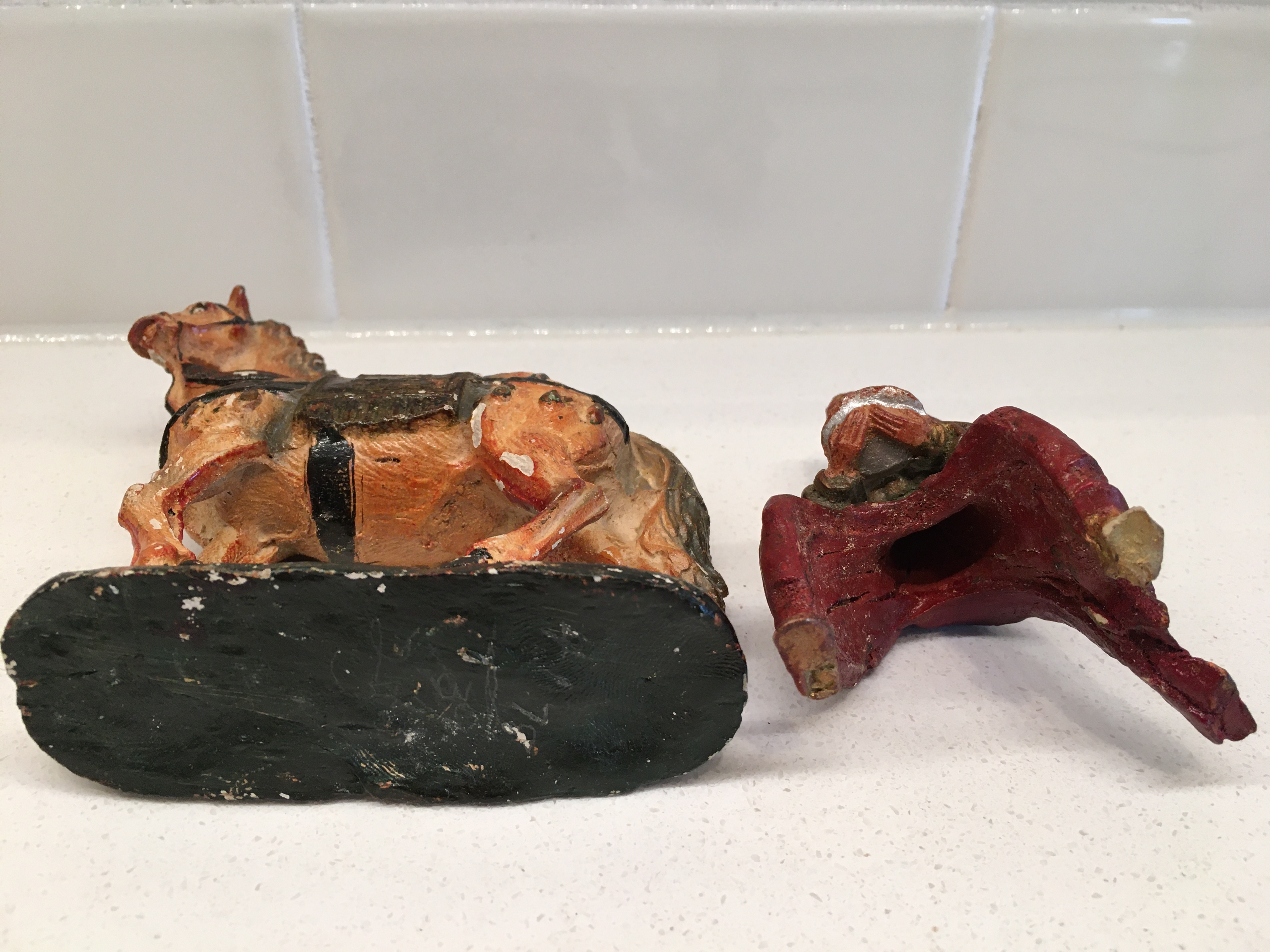 Physical Description: This statue depicts a Middle Eastern man riding a horse, crafted from what appears to be chalkware. The dimensions are approximately 4 inches tall and 3.5 inches wide, with a combined weight of 8 ounces for the horse and rider. The figure is painted in vibrant colors, including reds and browns, with notable detailing on the horse's harness. There are no visible distinguishing marks.