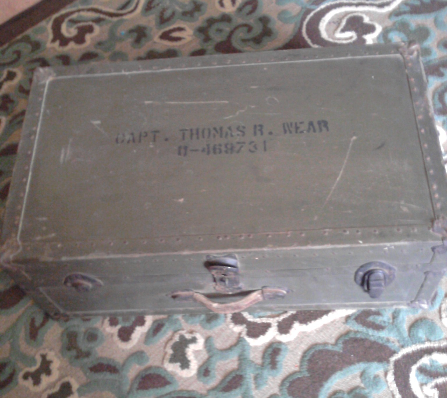 antique military green trunk....name stamped "Capt. Thomas Wear"