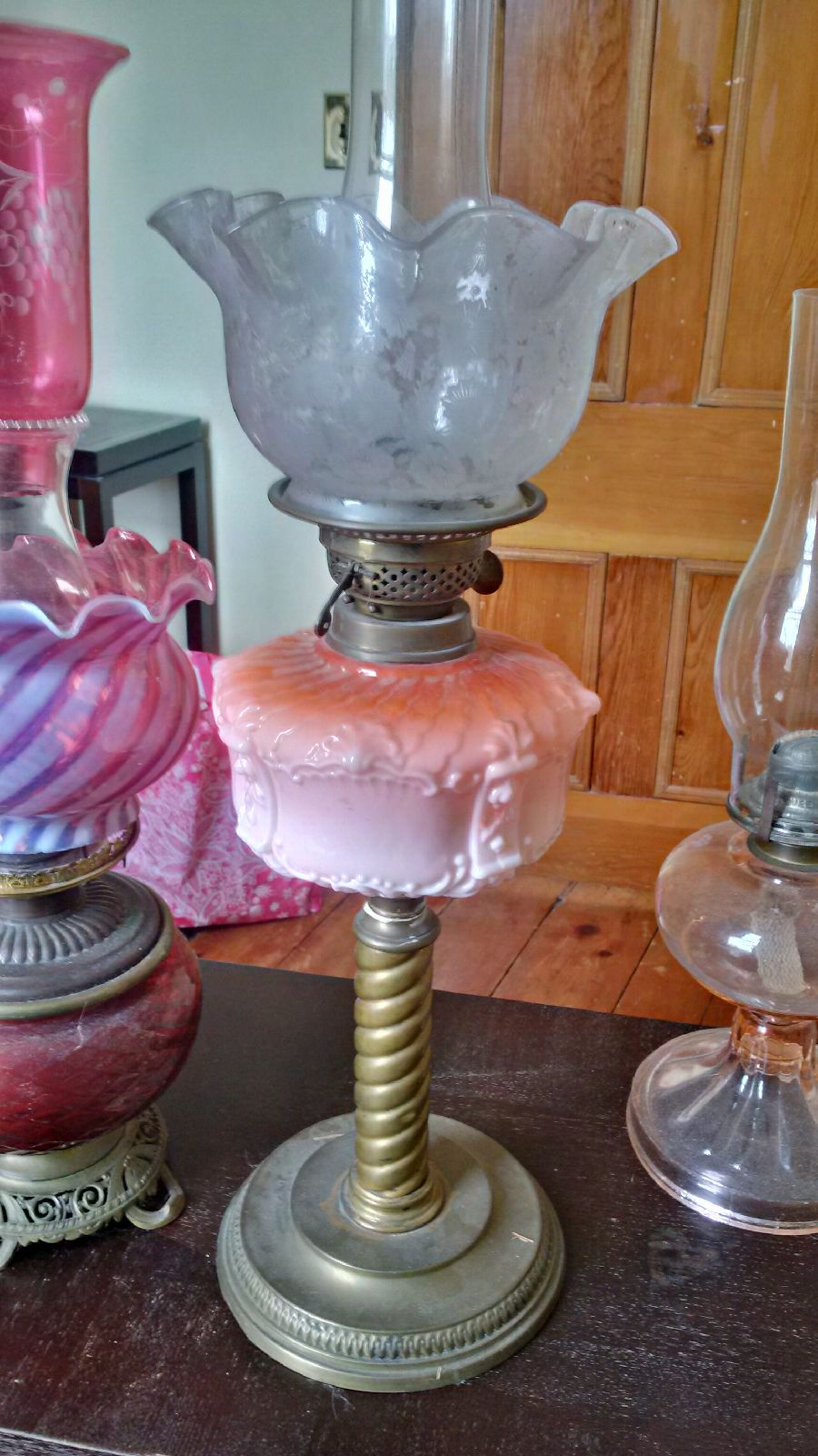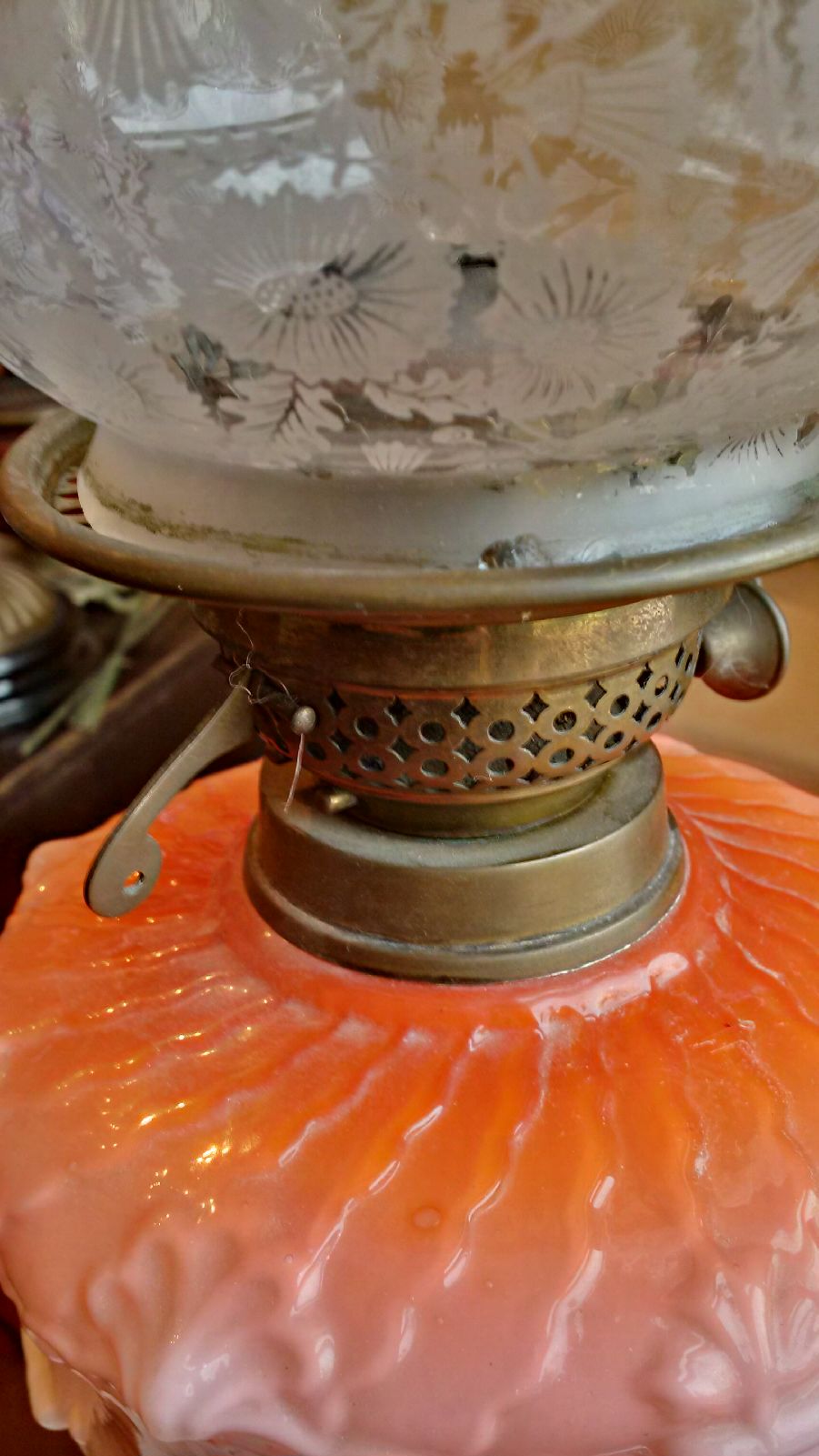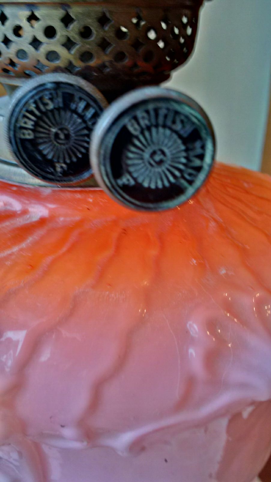 Oil Lamp stands about 21 inches, glass globe with floral pattern, knobs are marked British, presuming it is milk glass but it may also be Berlin Pink Glass, not sure, my family has a small collection and because of the uniqueness of each lamp (and lack of markings) I am finding it difficult to place a value on it