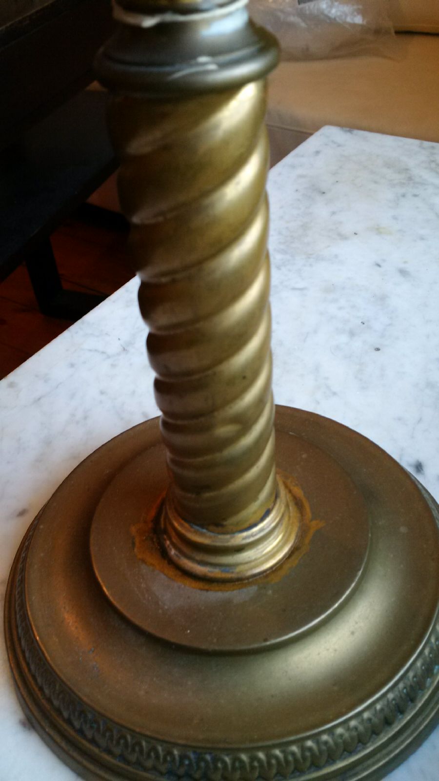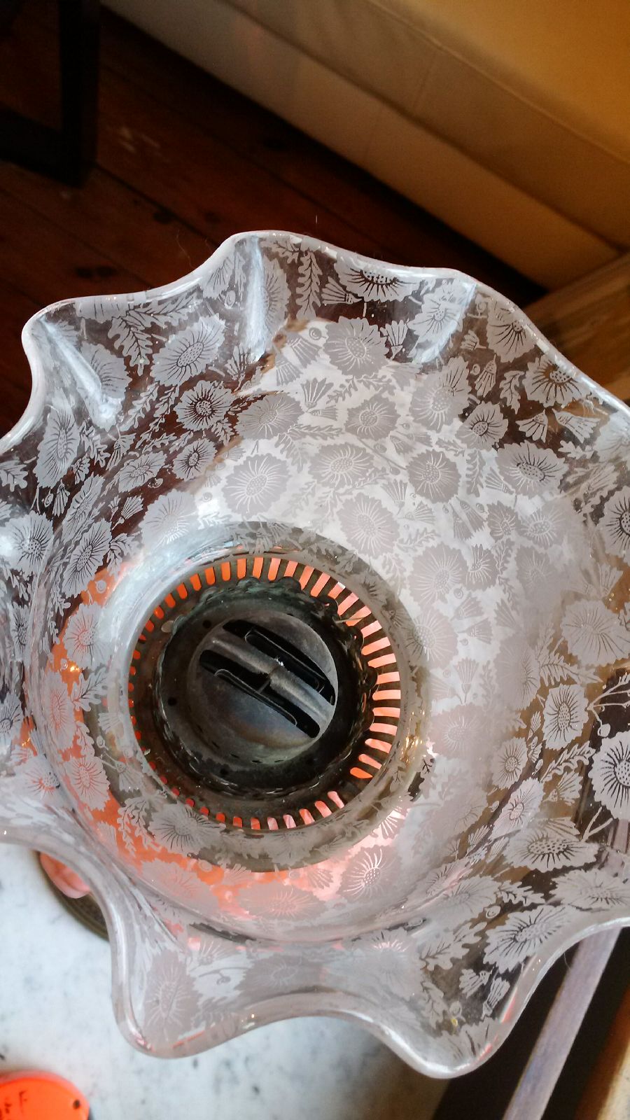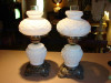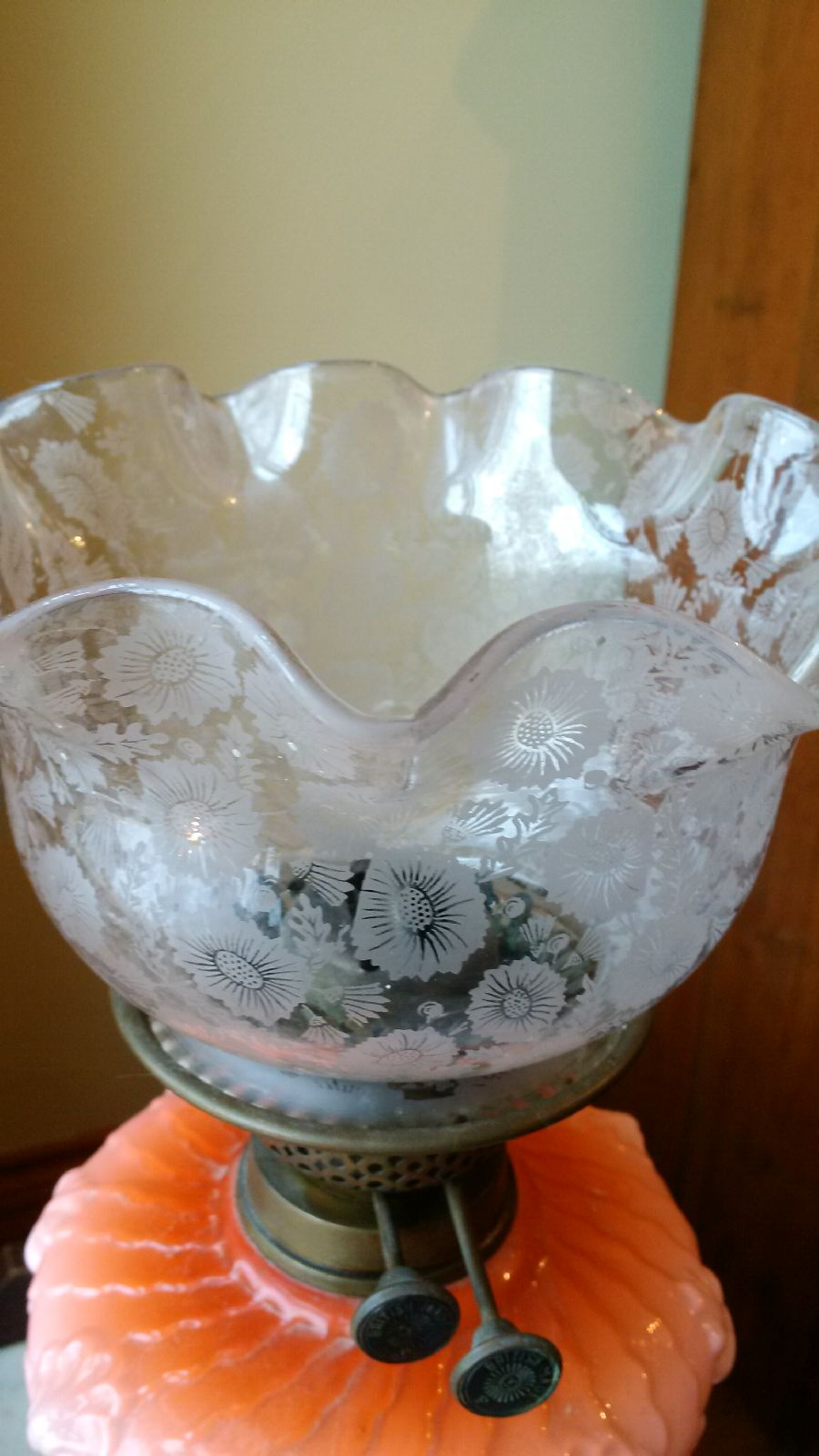 Oil Lamp stands about 21 inches, glass globe with floral pattern, knobs are marked British, presuming it is milk glass but it may also be Berlin Pink Glass, not sure, my family has a small collection and because of the uniqueness of each lamp (and lack of markings) I am finding it difficult to place a value on it