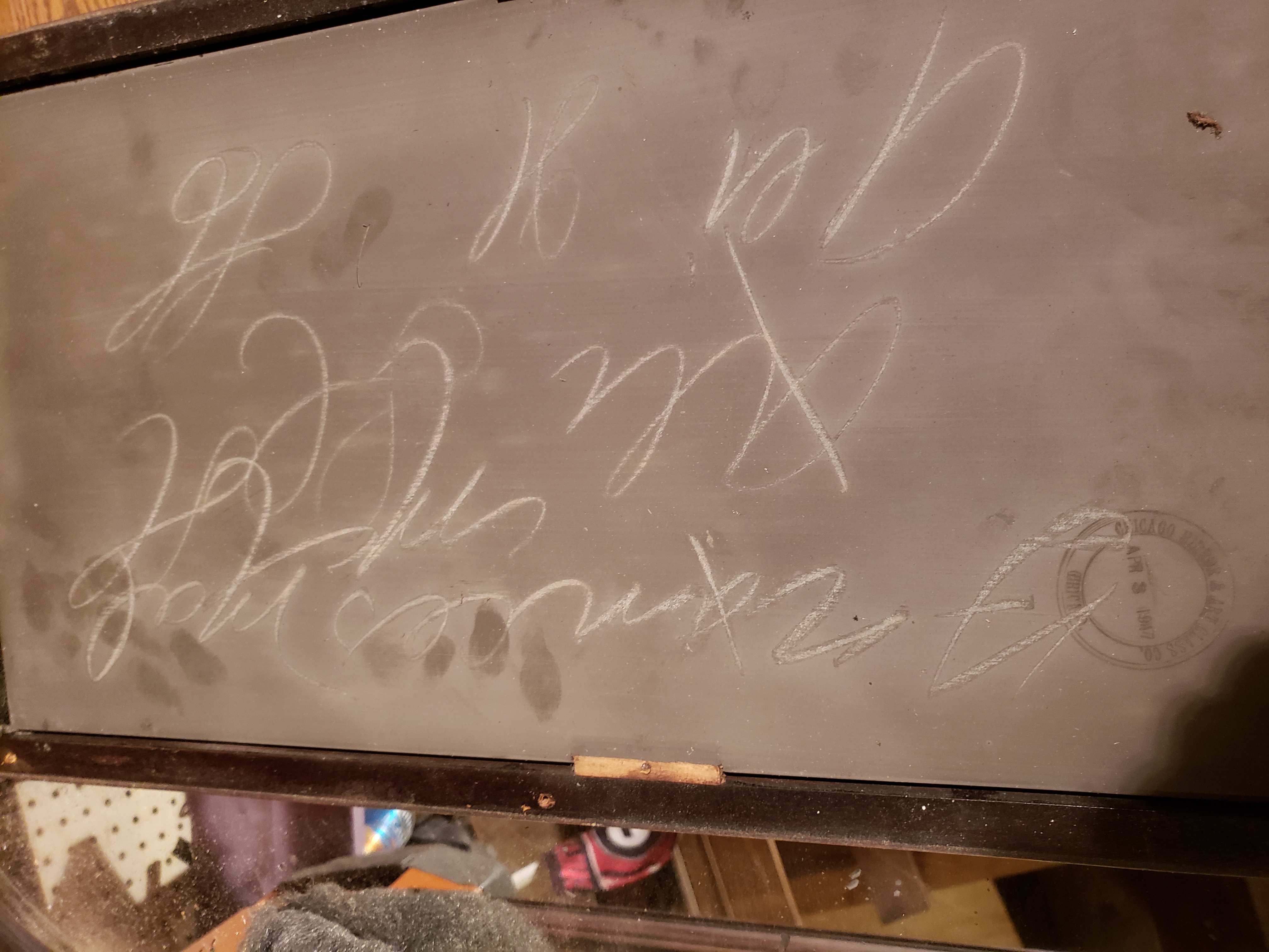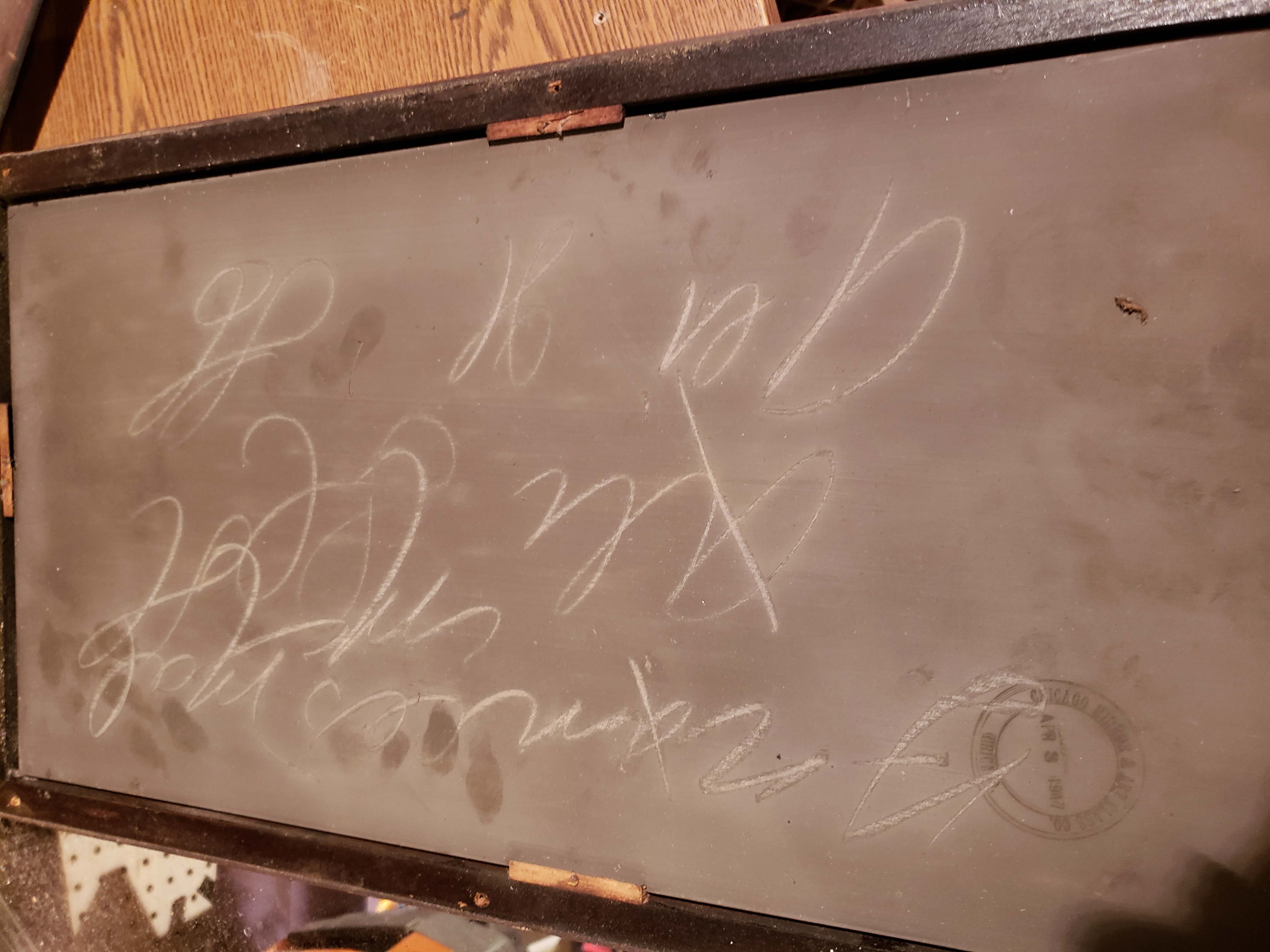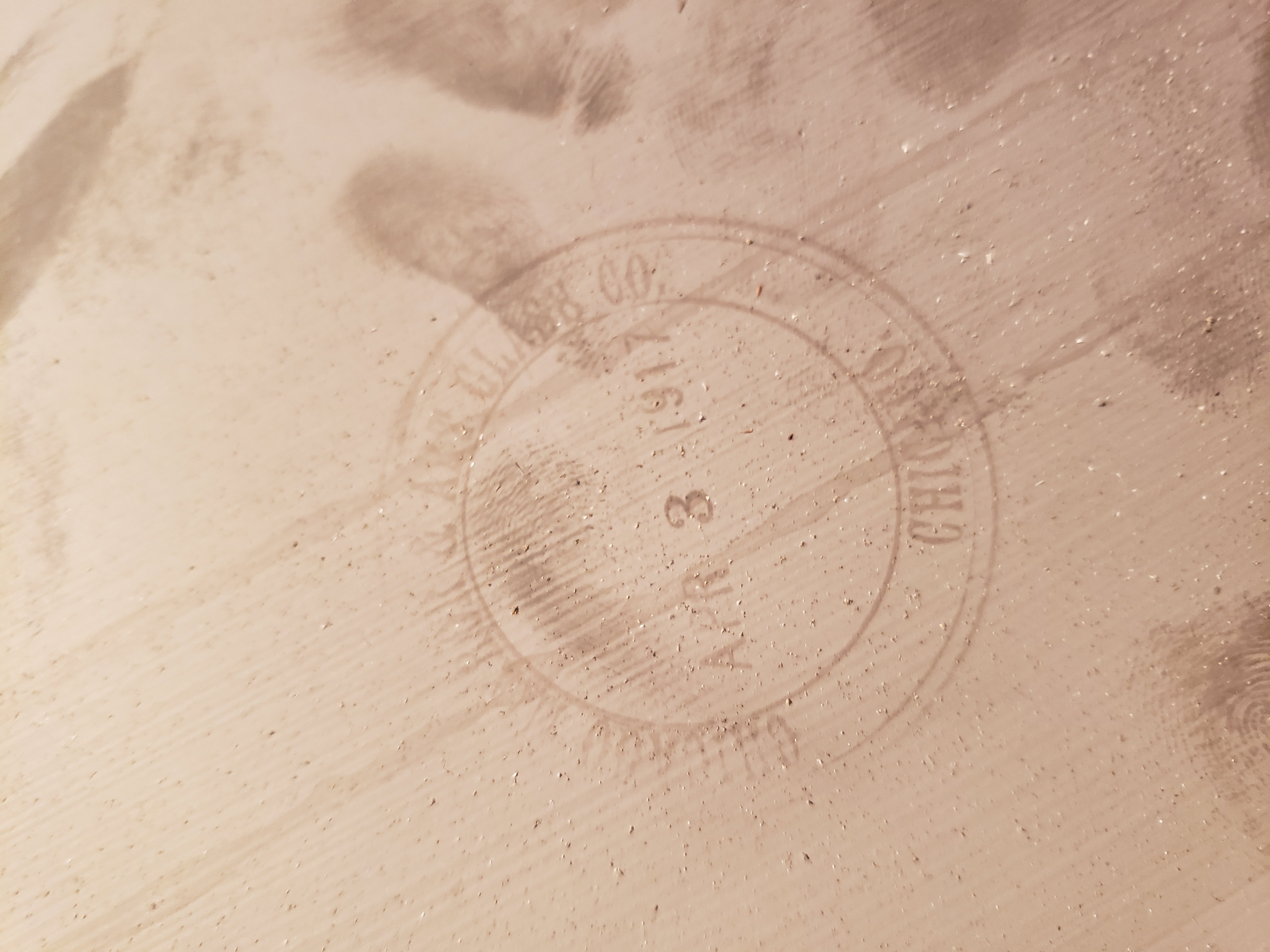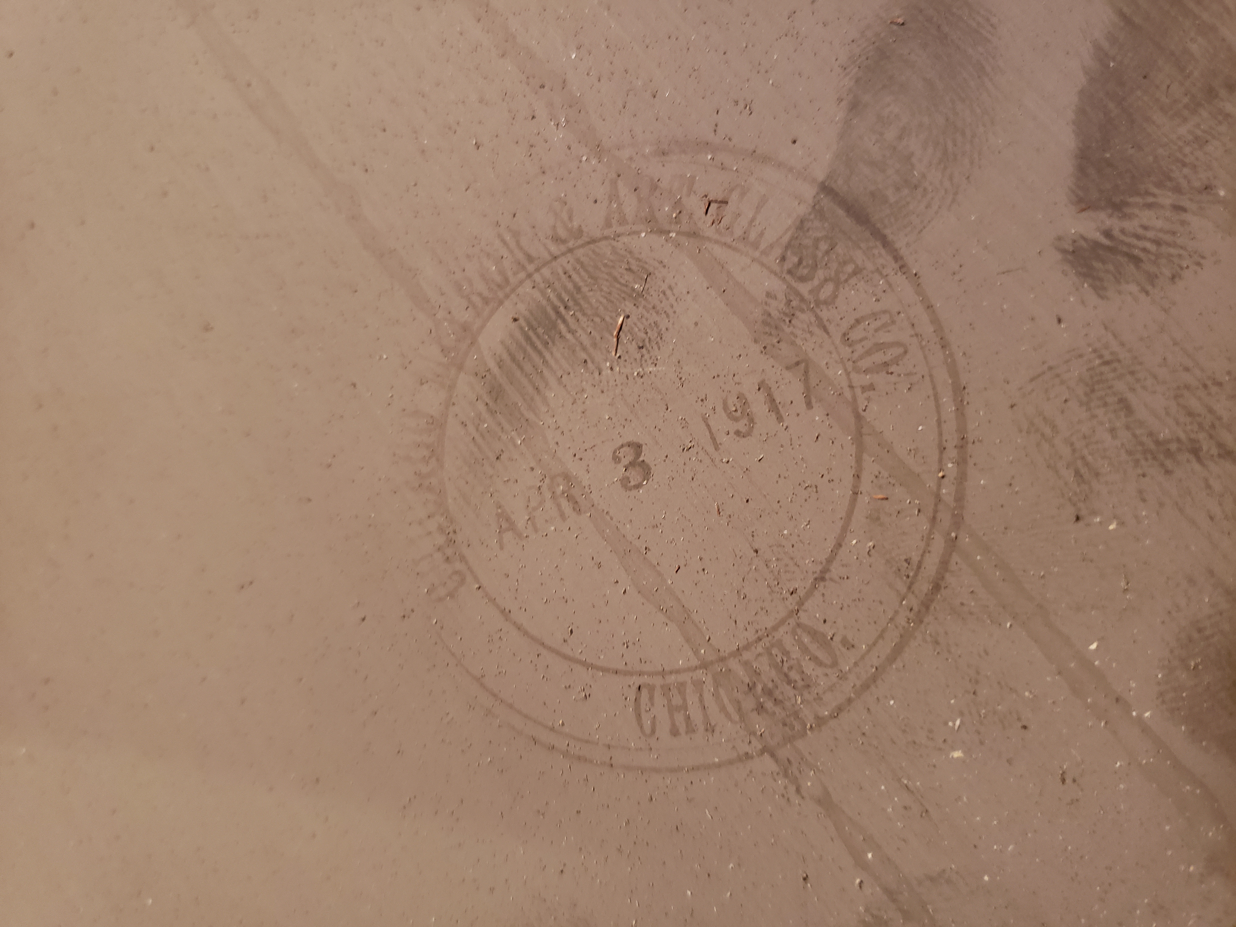 I took apart a old mirror because I was trying to clean the glass and it wasn't working. On the back of the mirror looks to be written in chalk but it has bled through and you can see some of the writring when you look through the glass. It has a stamp saying Chicago Mirror & Art glass co. April 3 1917. I can't seem to make out the writing or find the company online and was hoping you could help.