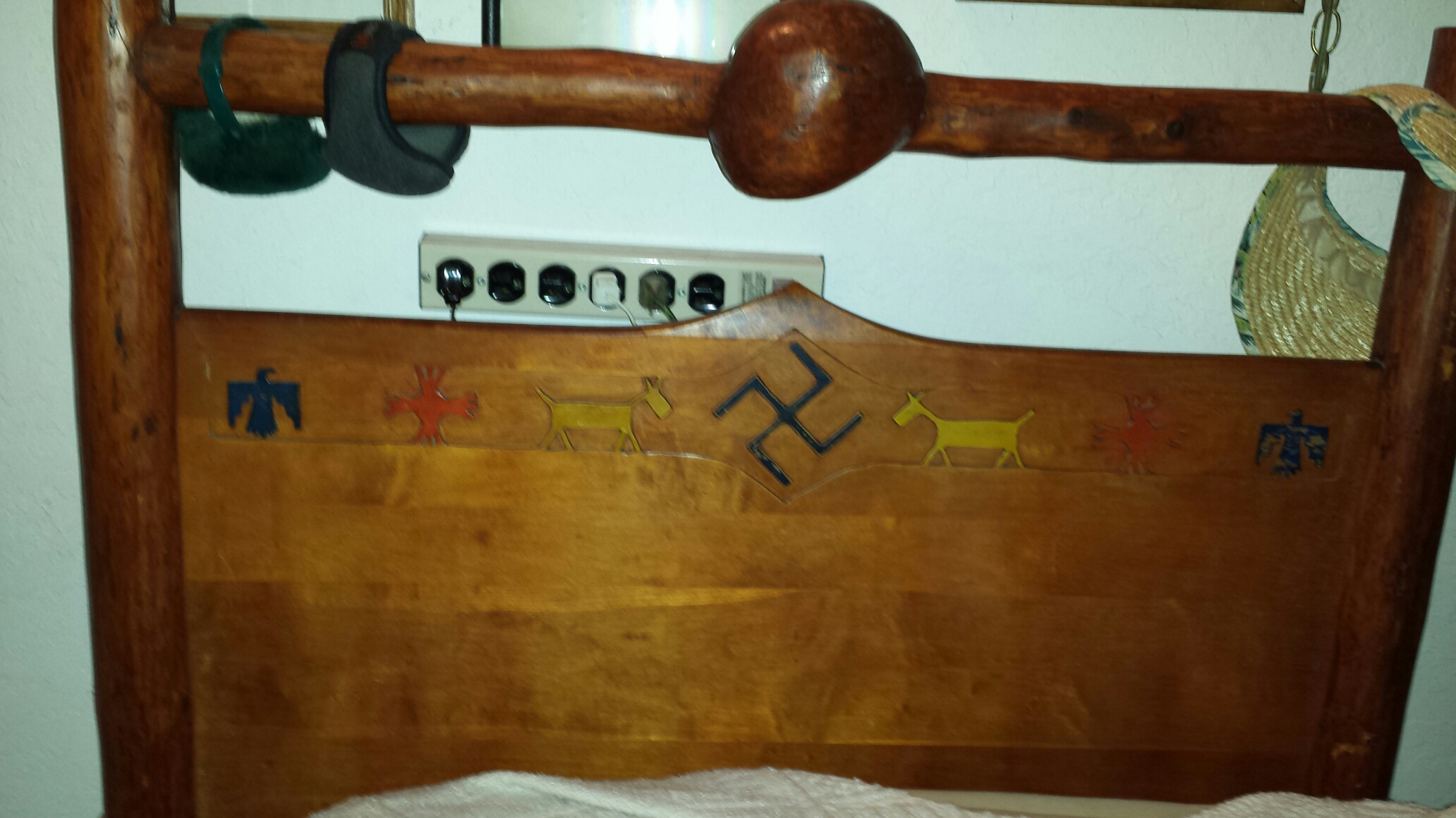 Distinguishing marks Large club like burls in furniture. Indian type paintings on bed and dresser