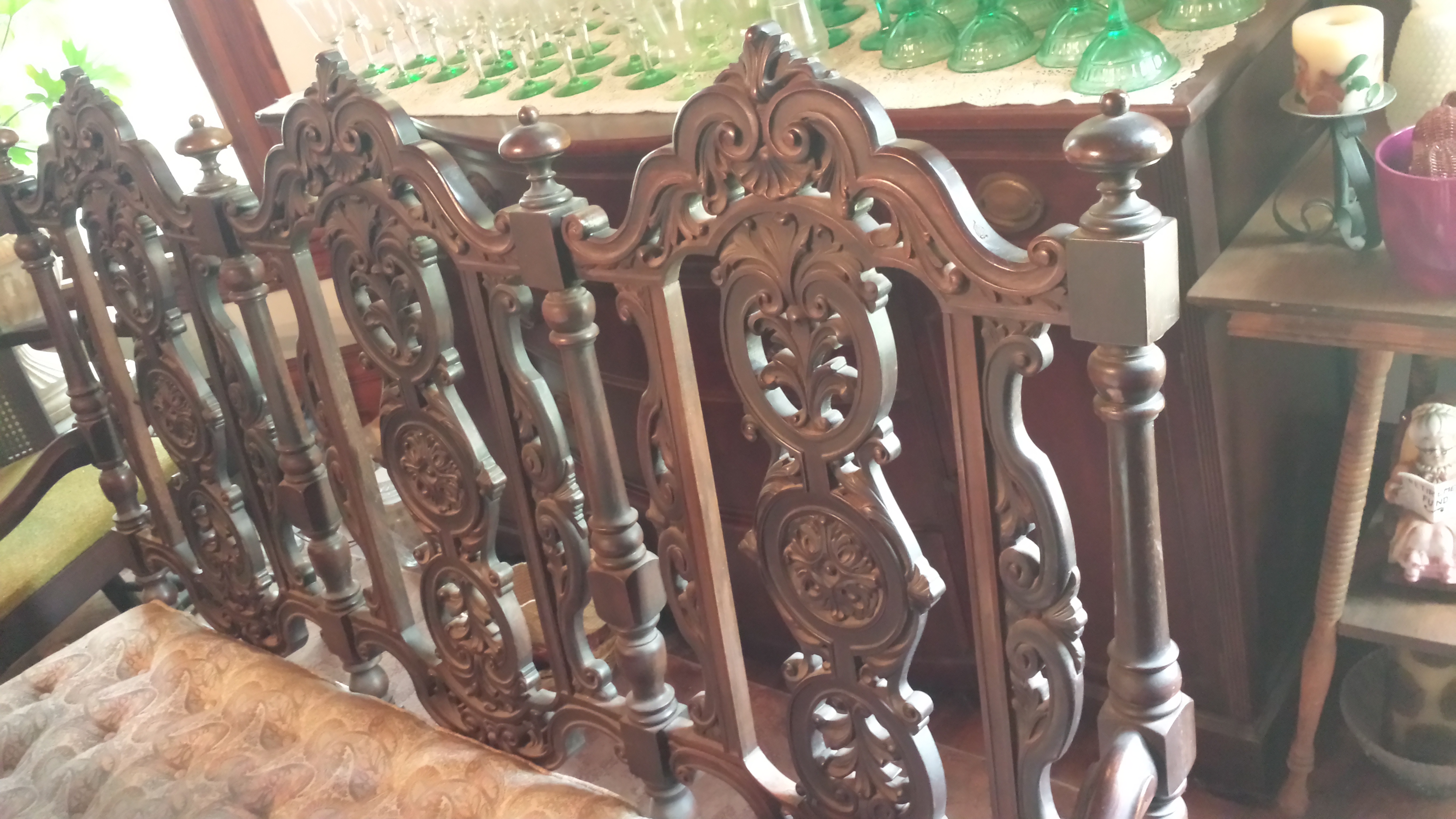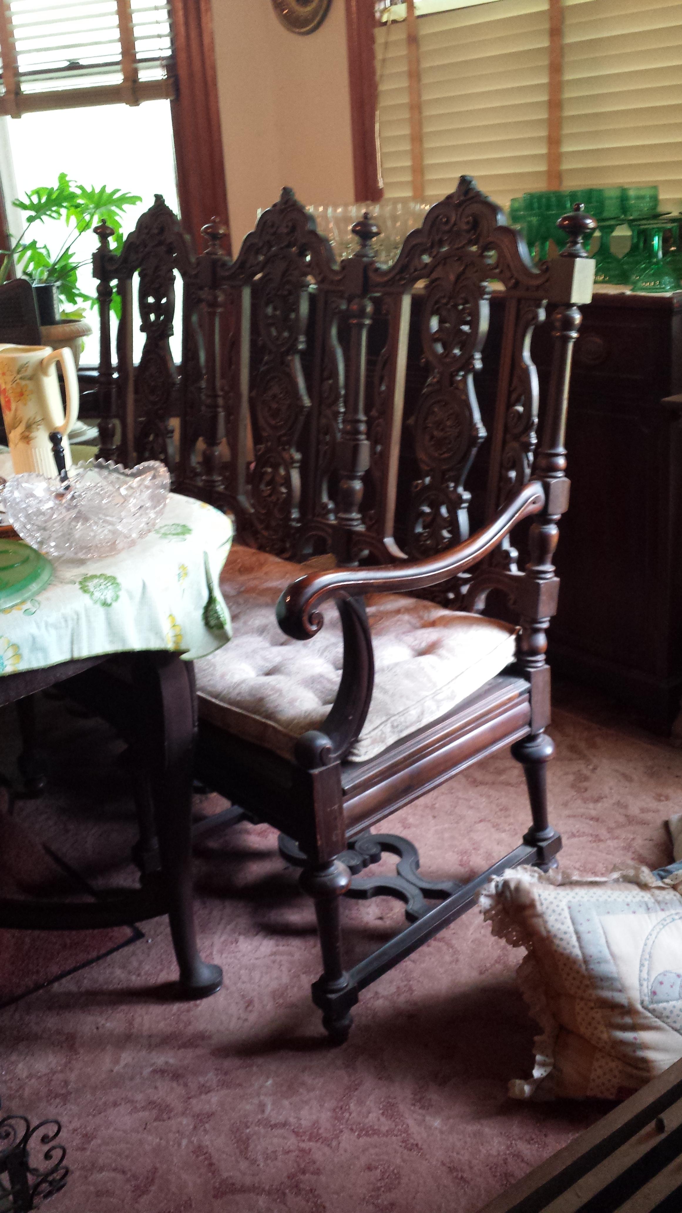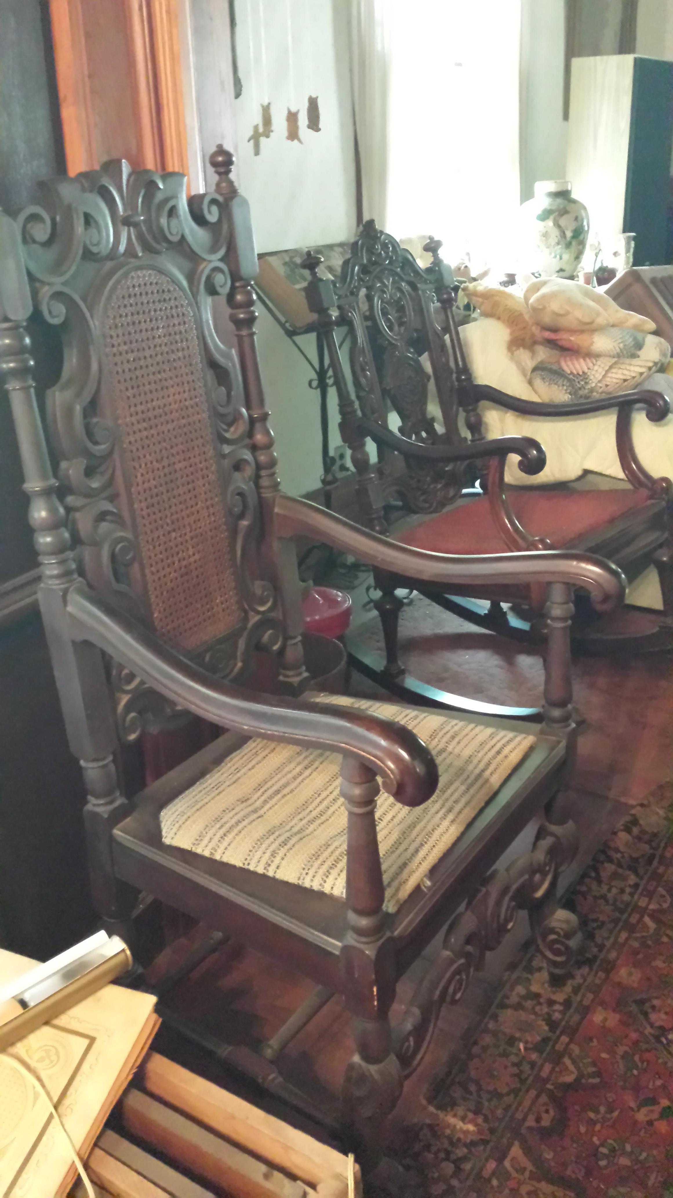 There's a rocker, settee, and 2 captains chairs. No info on bottom. Believed to be before 1920, possibly before turn of century. Thought to have been purchased in New York City where they may have come from Europe.