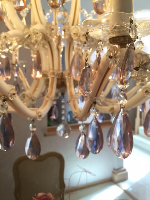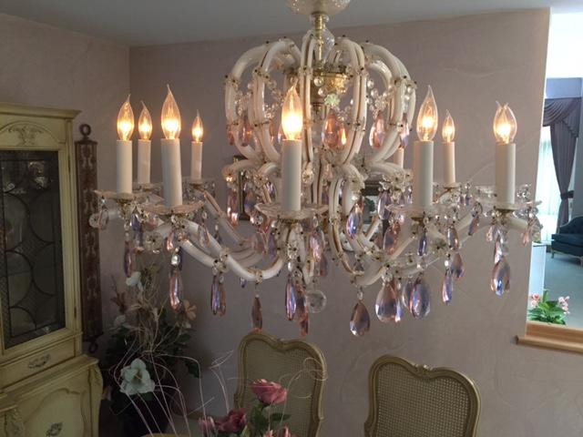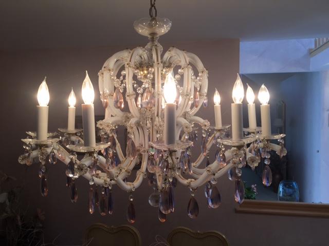 I need to know what actual type of chandelier this is? There is no identifying marks or hallmarks on this item. I do know that it was told it could be from the 1960's or 1970's, but I do not know? It does appear to be all glass. There are 10 arms with pink crystals around each arm and a light at the end of the arm. The upper part of the chandelier is round like a pumpkin. Almost looks like Cinderella's carriage. If known, what is this chandelier and what price would it bring at auction?