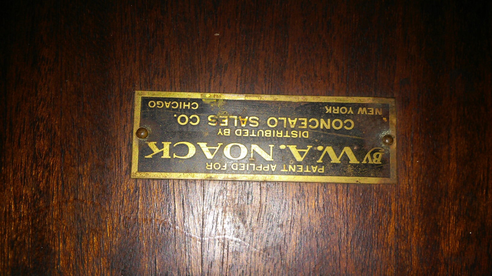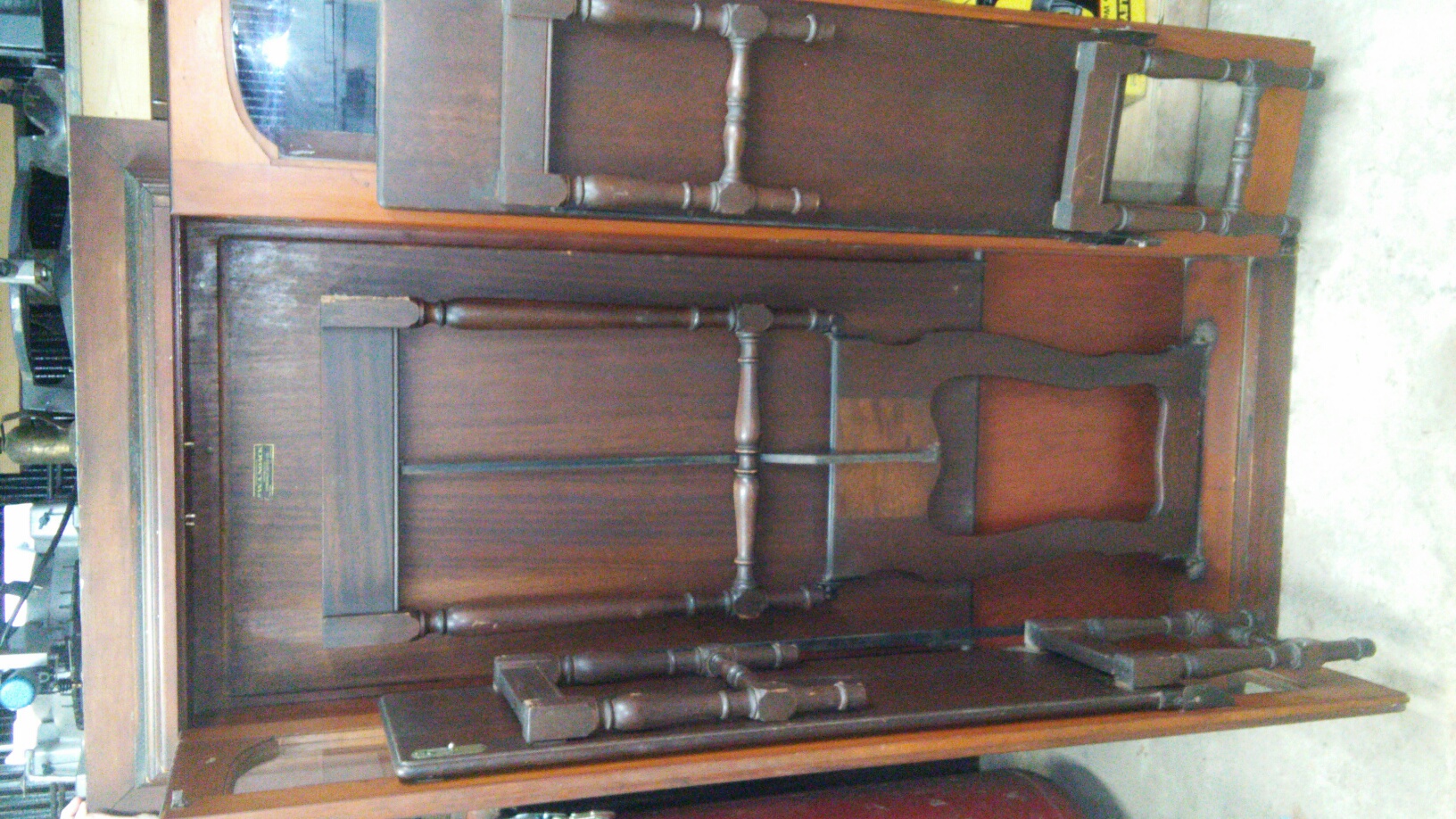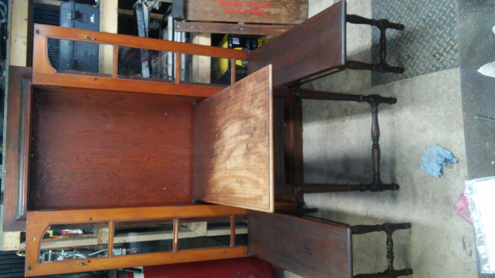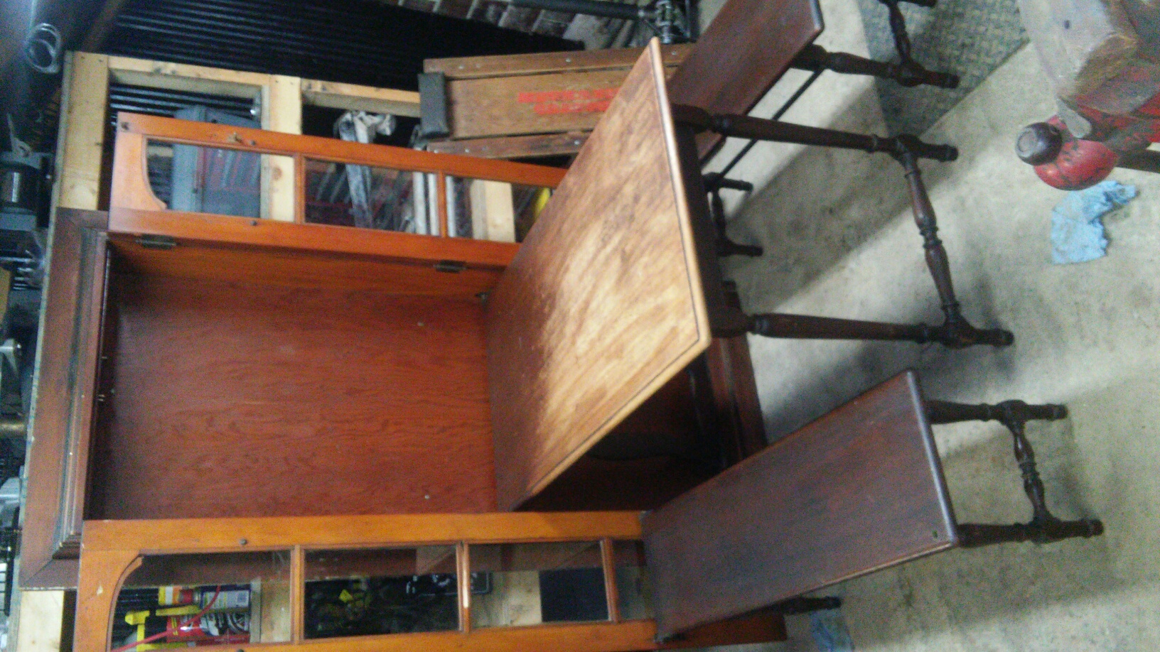 Antique Murphy Taple open the glass doors where benches are attached with original hardware. Fold down bencehes and table, cosmetic ware on the table top. Was found in a victorian house that was converted into appartments Metal ID tag reads: Patent applied for by W. A. Noack, Distributed by Concealo Sales Co. New York / Chicago