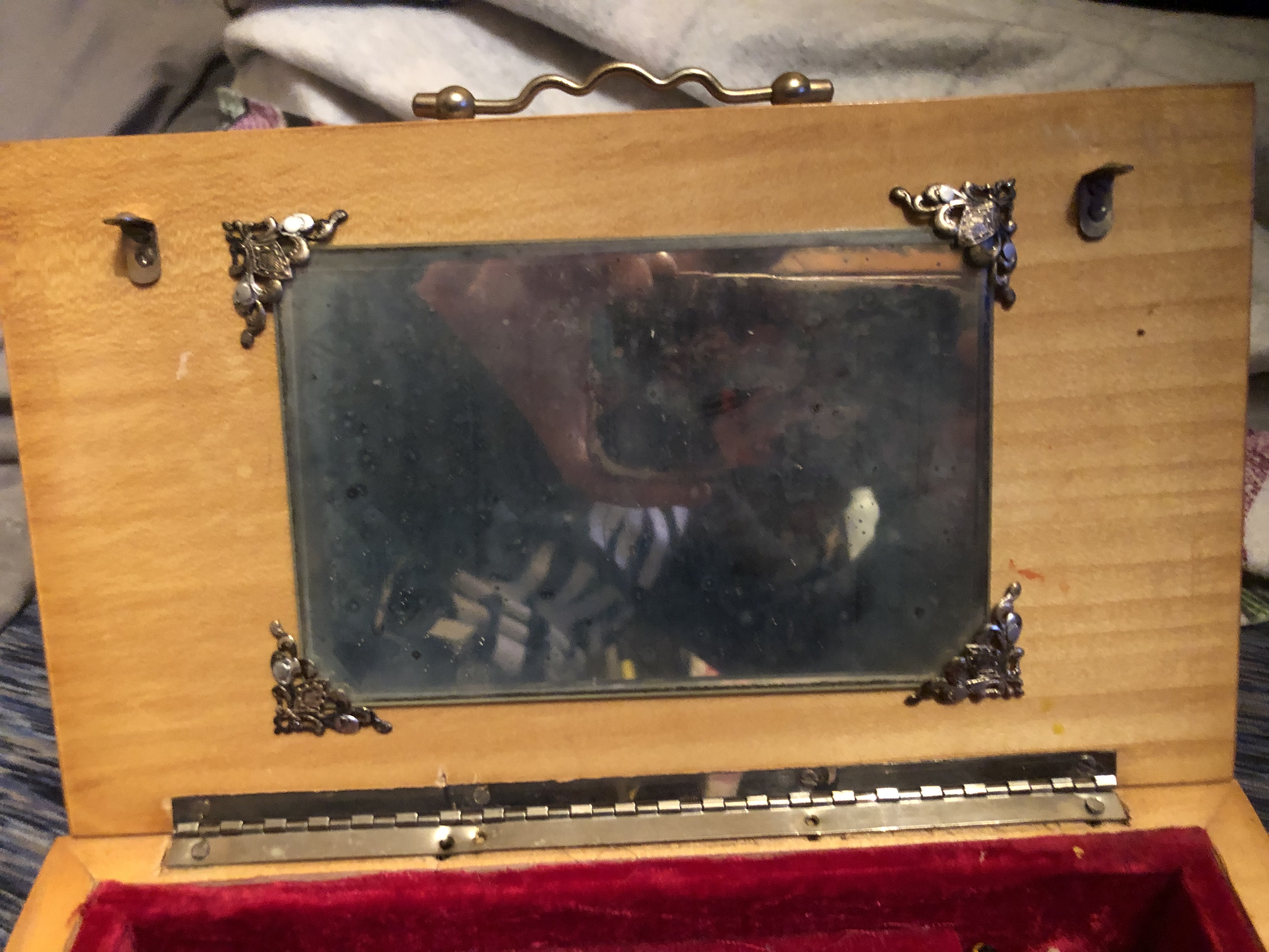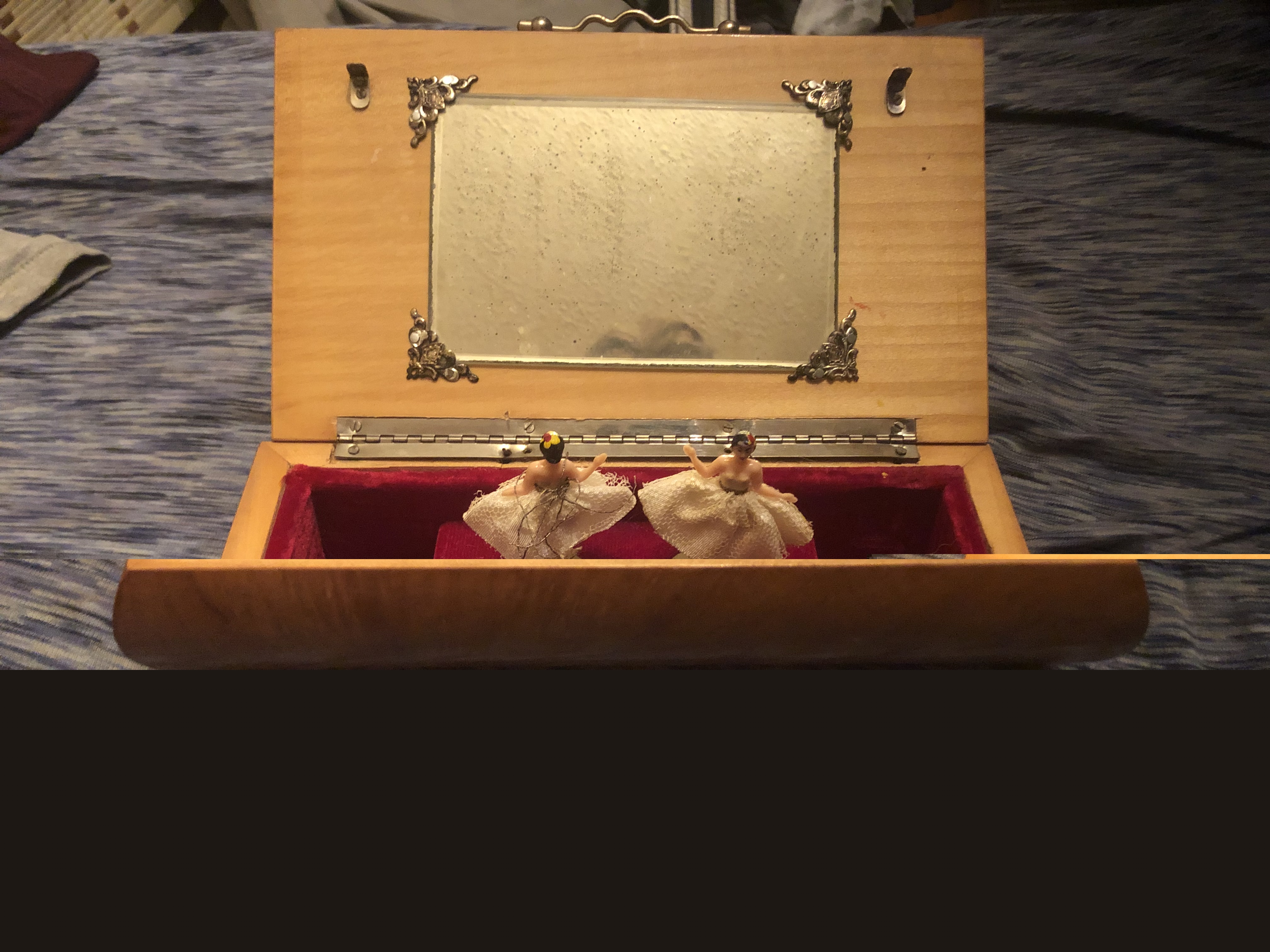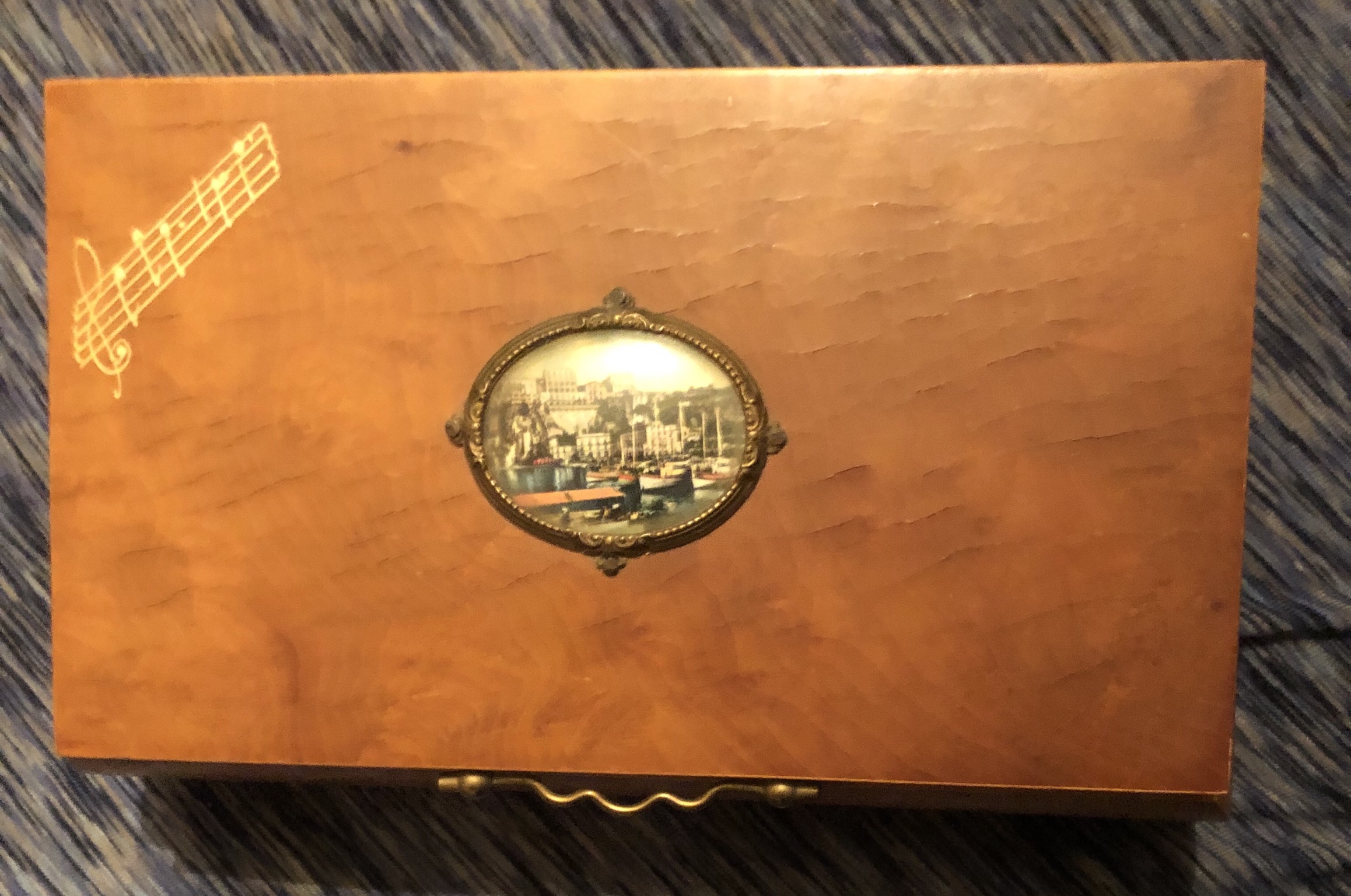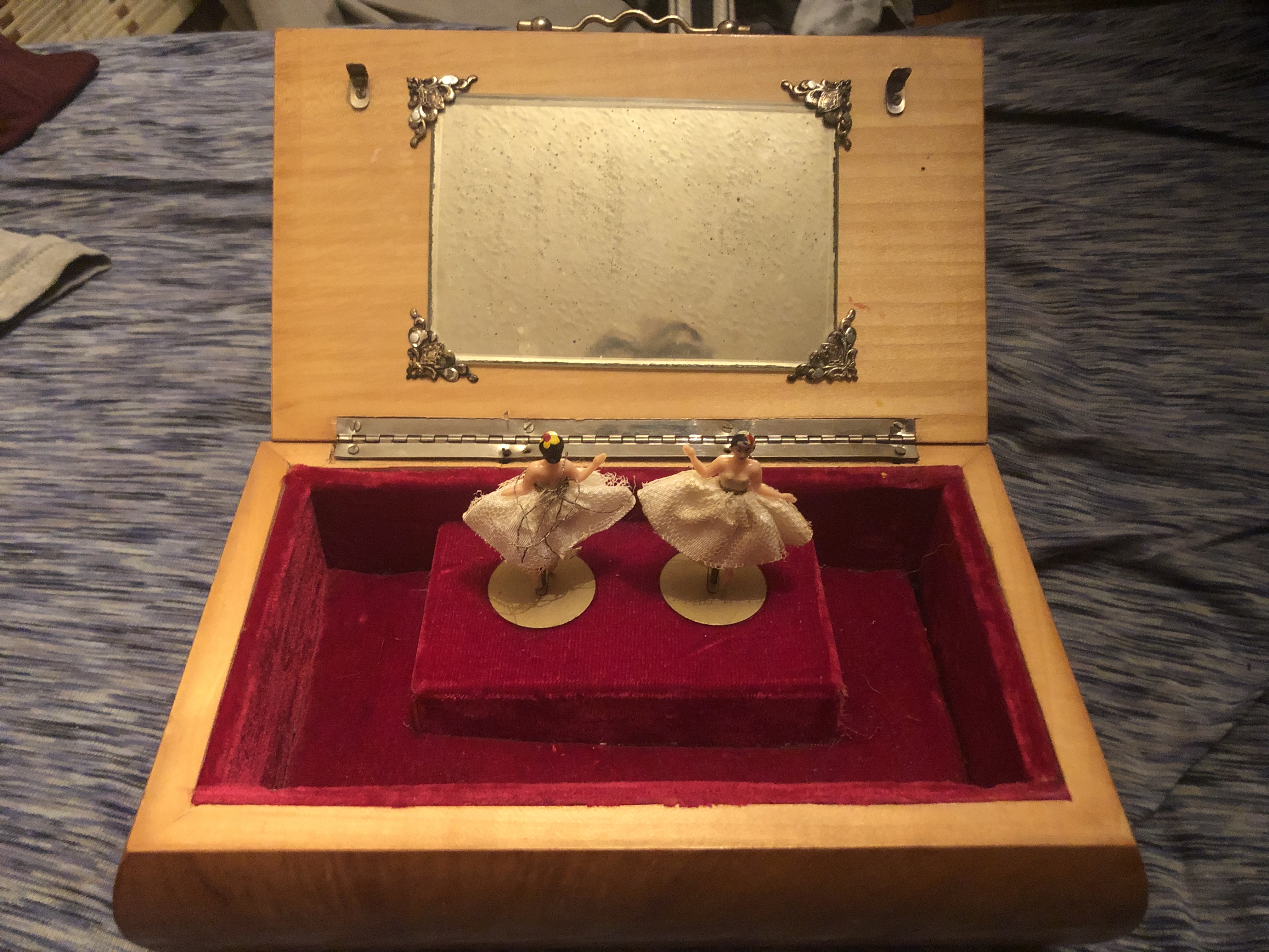 I have what I believe is a Reuge wooden musical box that has been passed down 3 generations. From the research I have done myself I believe the picture on the outside is of Sorrento, Italy. I believe it was hand painted on glass. The inside is lined red velvet and features a mirror with 2 ballerinas that dance to a unknown melody. The inside and the outside are both adorned with what appears to be brass. The bottom of the box has the wind mechanism and the only identifying tag on the box which is a sticker. I have been able to find similar ones online for about 400 dollars but I haven’t been able to find this model.