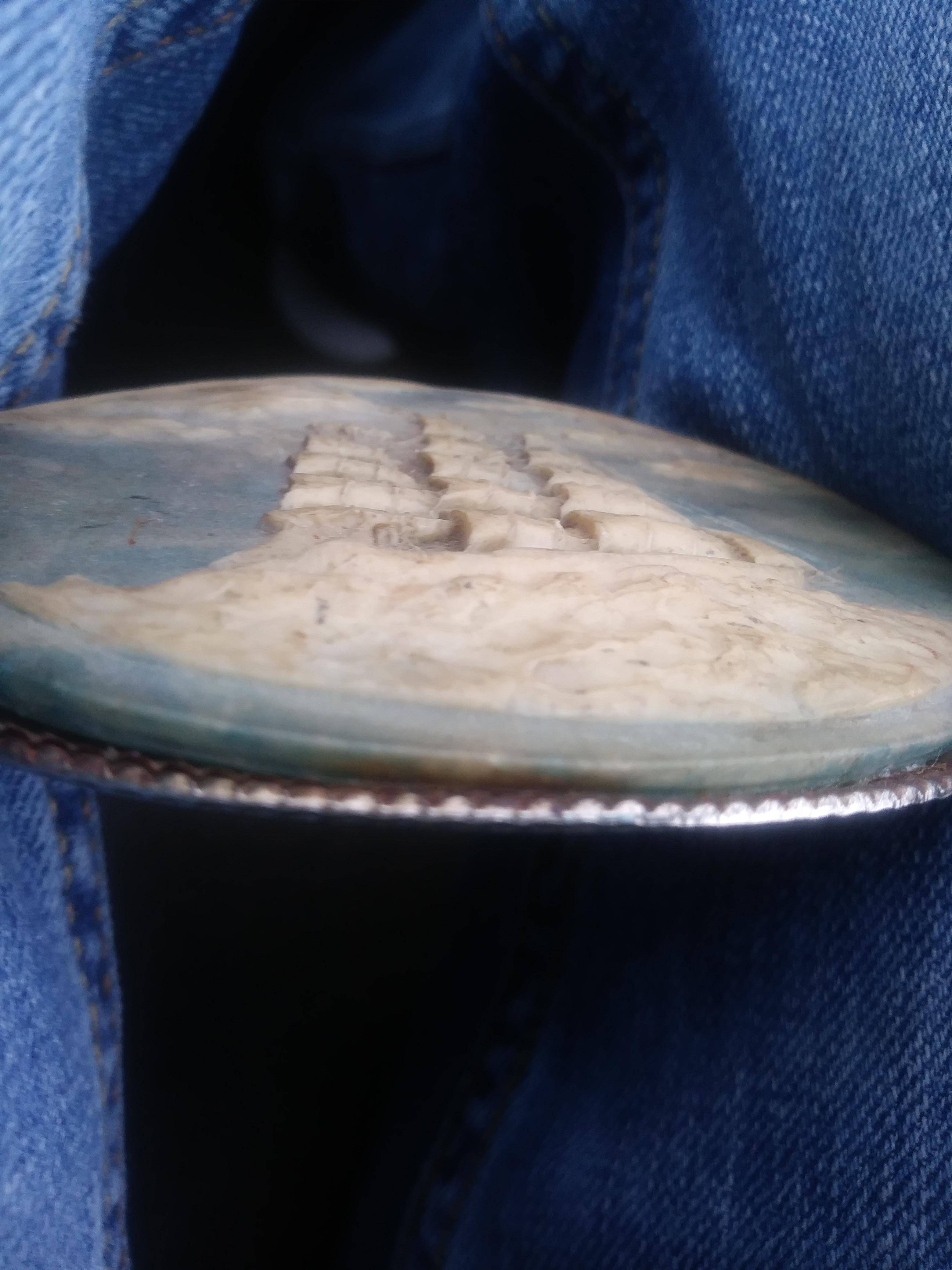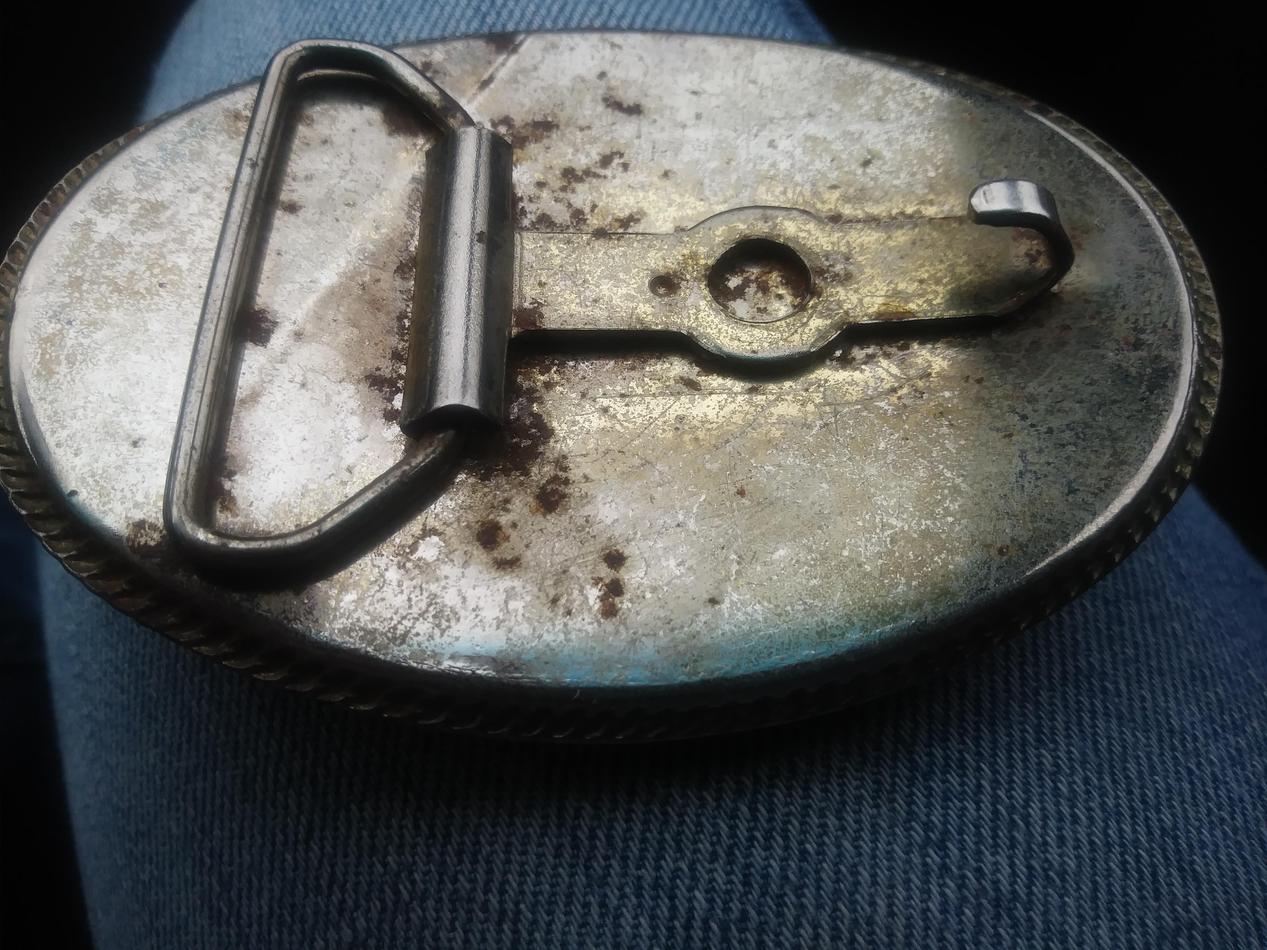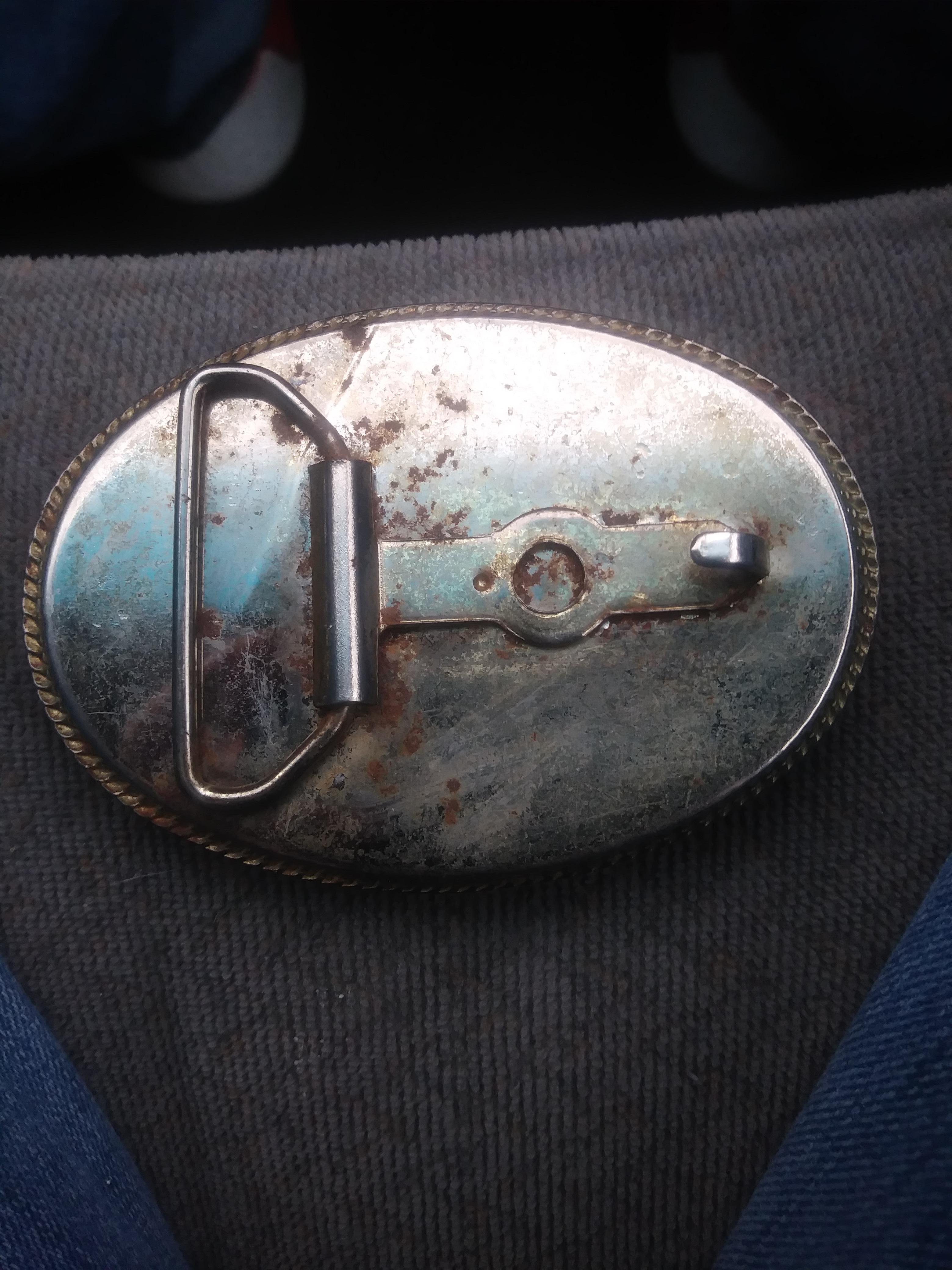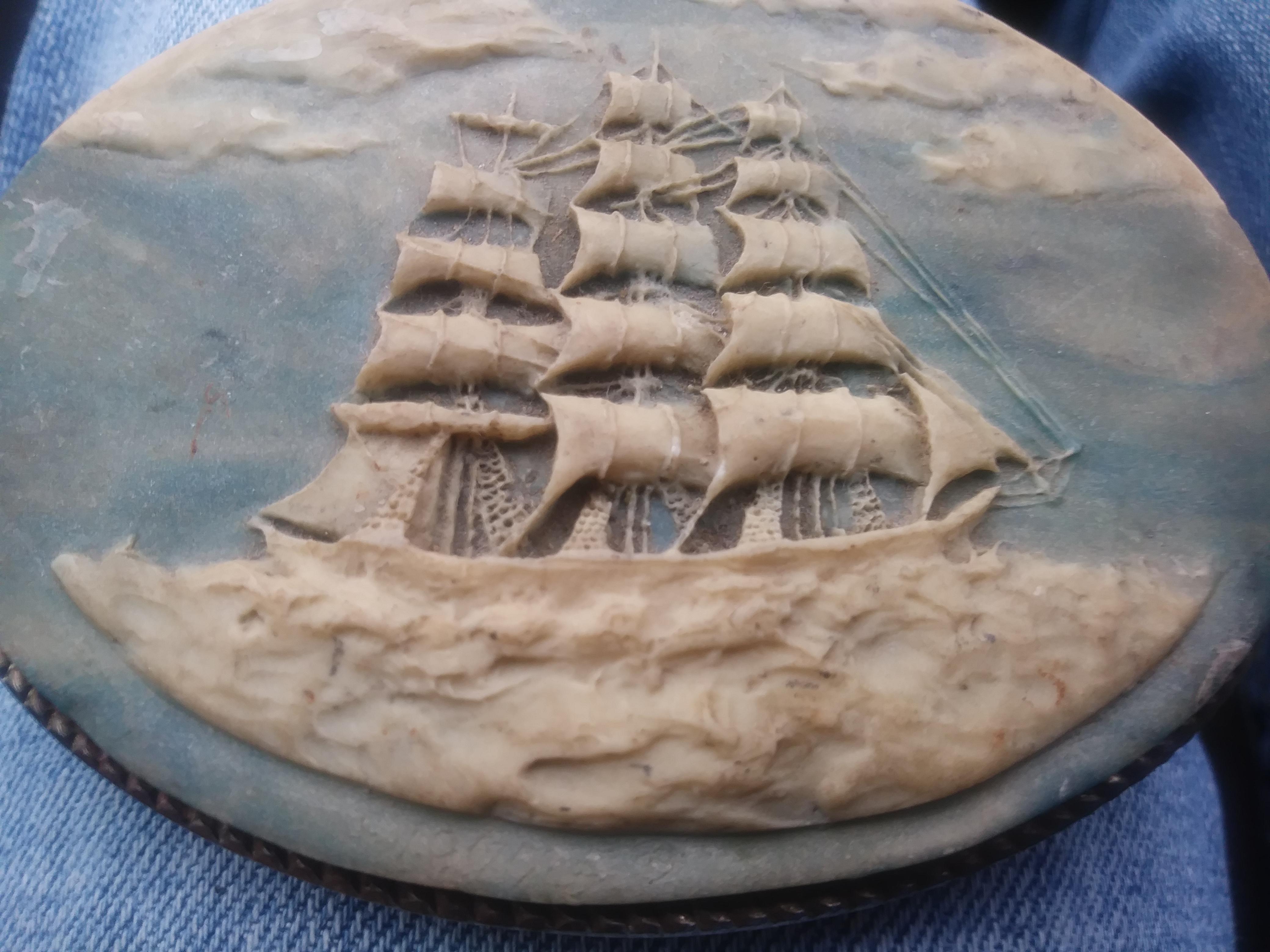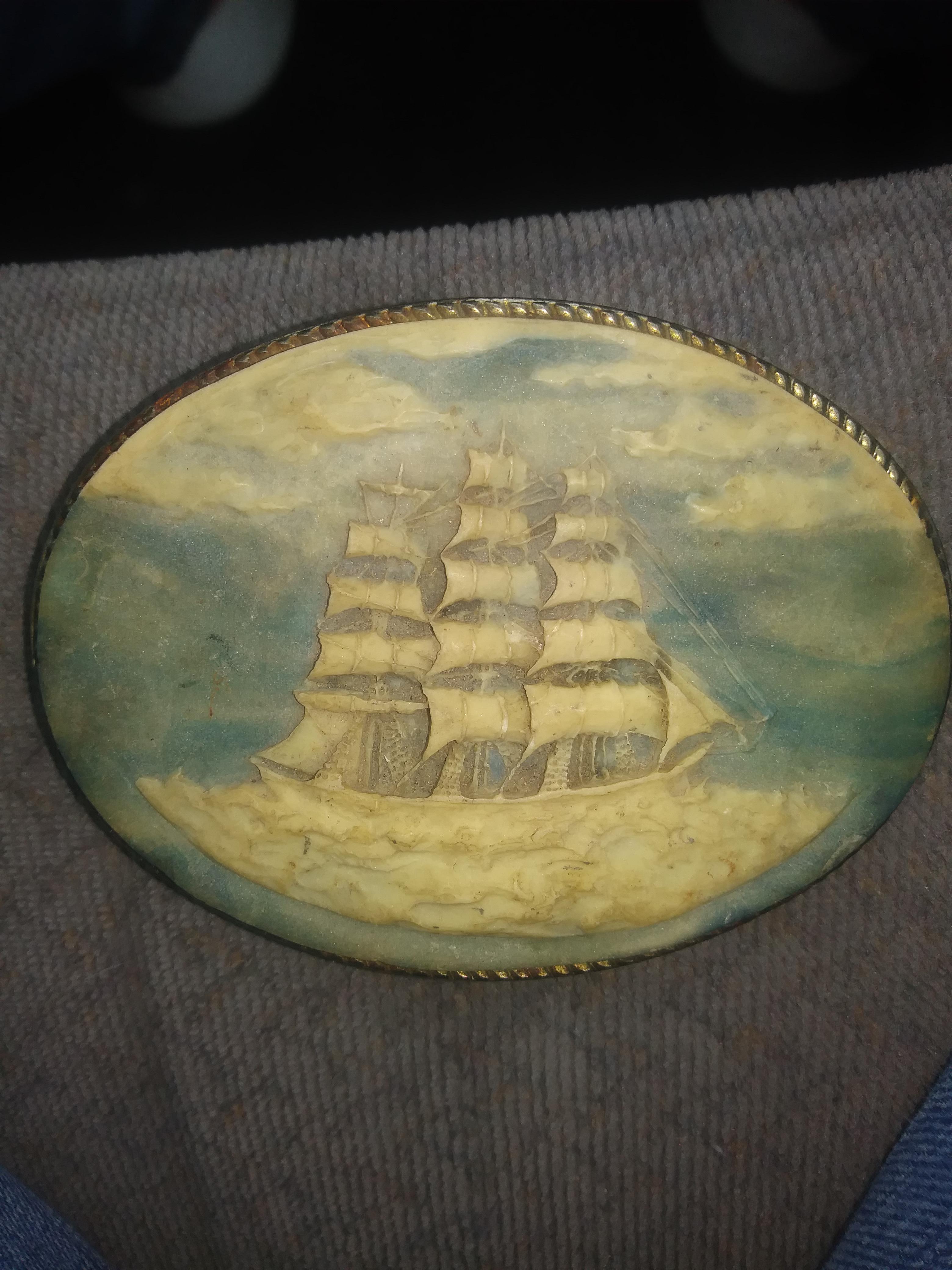 Looks to be carved or handmade i cant tell what its made of. Ivory is one thing that comes to mind but i don't know cause the blue doesn't look like it's been painted. Has fine detail in the ships sails and ties. Looks to be pretty old but it was definitely made by a fine artist. There are no visible markings on the buckle anywhere that i can see to tell who made it or how old it is.