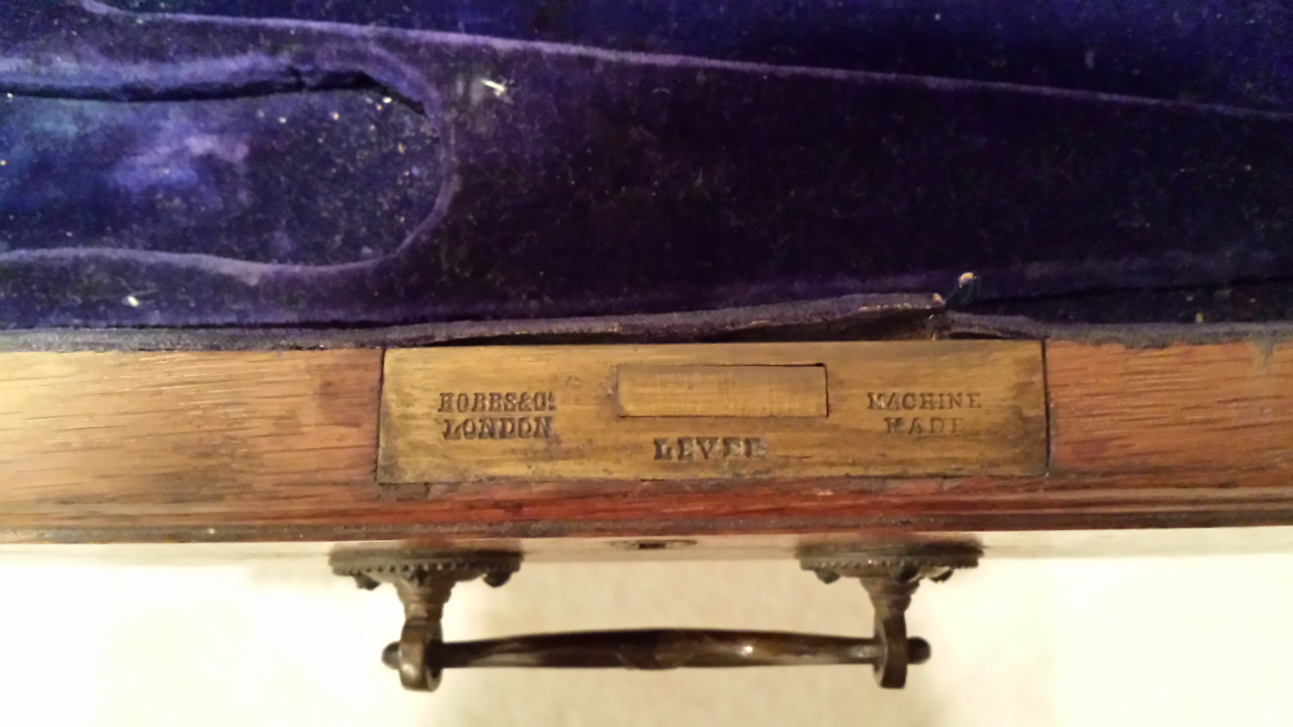 There are no markings as to a ship it may have been on. But there is an inlay on the top and front with a monogram. The only marks are from the locksmith which is Hobbs & Co London.