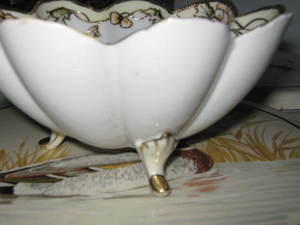 This is a very beautiful, delicate looking piece. Adorned with gold detailing, pale orange flowers, and a pale yellow edging. Has three feet on the bottom which are also detailed in gold ans pale yellow. This piece is in excellent condition.