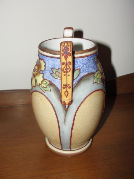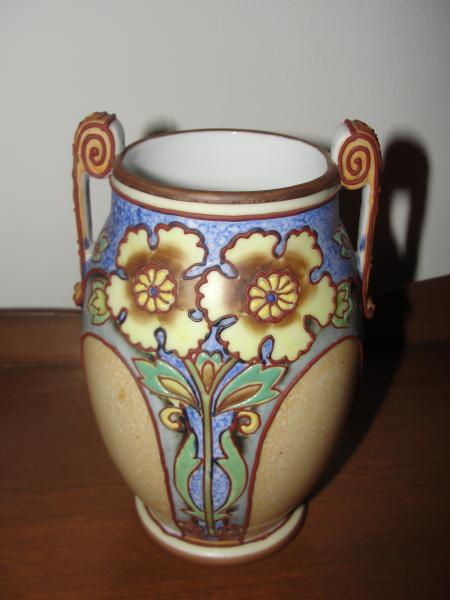 Description Unique Nippon vase, 6.25" H by 4.25" at its widest point with 2.5" high side handles. Stylized center flower with stem and leaves on one side, double flower with stem and leaves on other side. The colors on the vase are natural, blues, browns, greens,and pale yellow. The design is outlined in raised brown. The handles have a raised brown design with raised dots with a dot of yellow and 2 dots of blue in the design at the top of the each handle. The markings on the bottom of the vase are green, with letters saying hand painted Nippon around a wreath with an M in the center. I would appreciate any information you can give me about this vase along with the value. In all of my research online I have never seen another Nippon vase that looks like this.